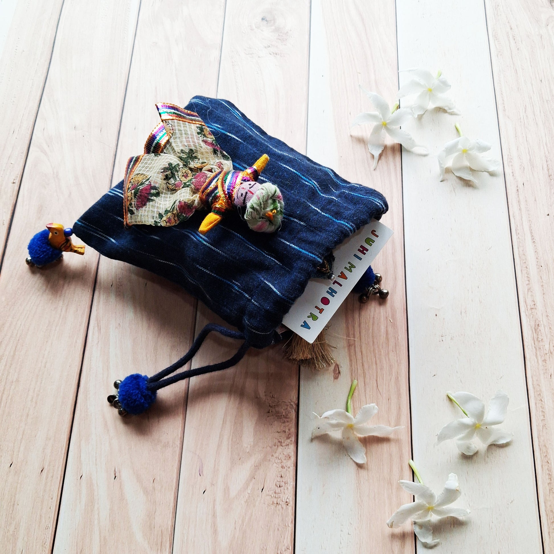 This hamper contains an indigo Puppet Potli. It has a handcrafted mirrorwork rakhi adorned with metallic beads. It also has a Paper Boat Dry Fruit and Nutty Trail mix alongwith a Happy Rakhi Card.