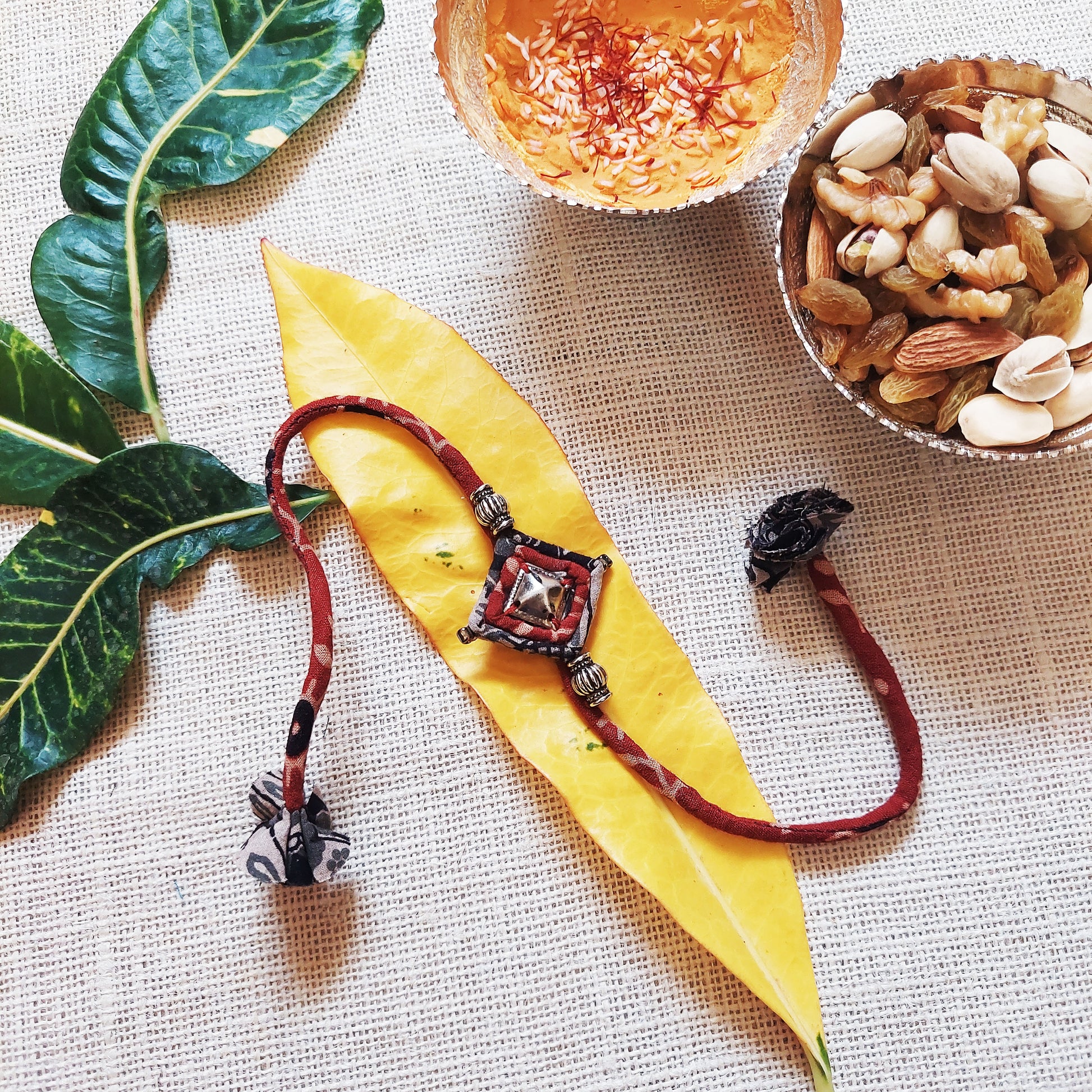 Handcrafted Rakhi for your dear brother. This is made using Ajrakh cotton pipings and finished with tassels. This embodies the rich heritage of our country and artisans. Rakhi is adorned with antique beads to make it unique and special.