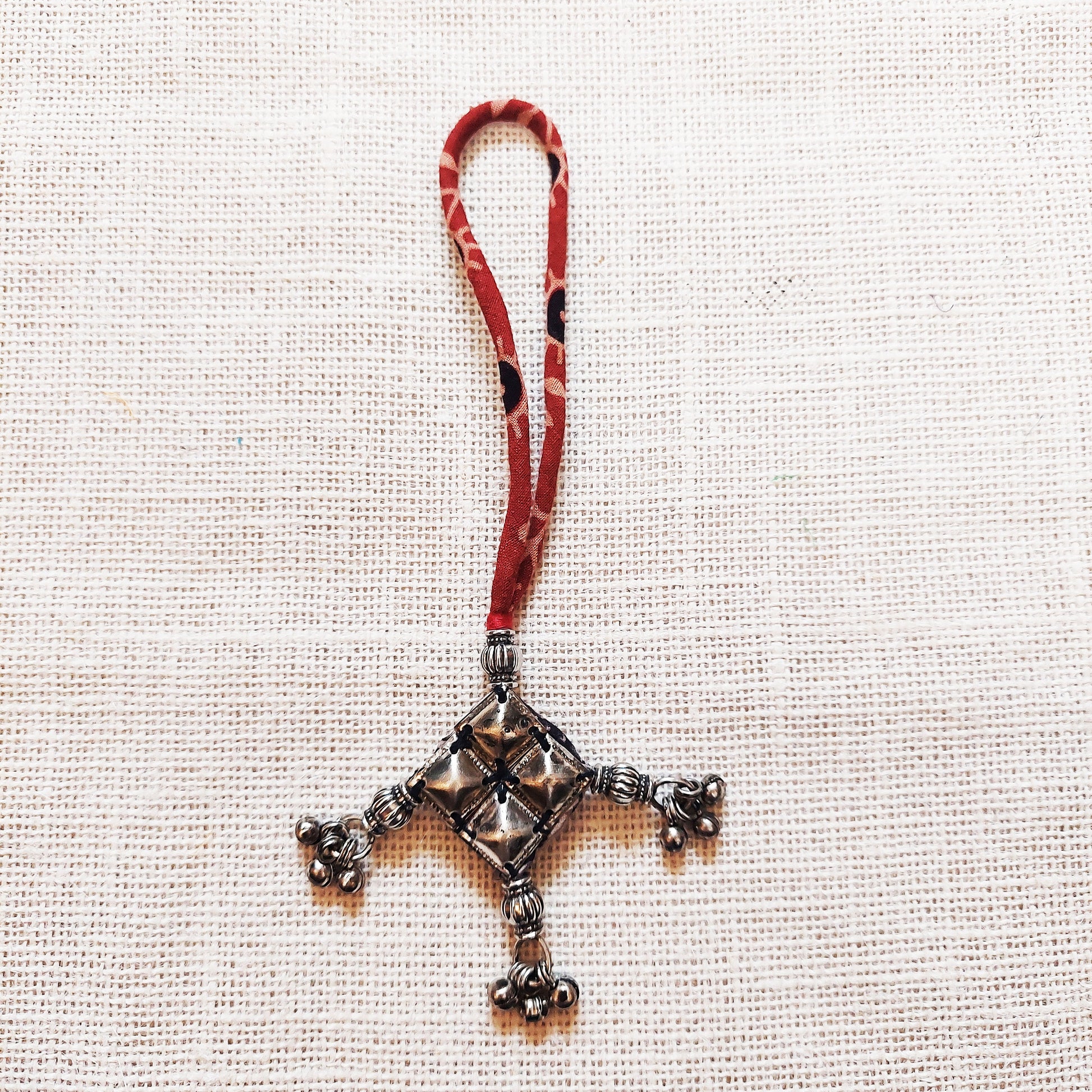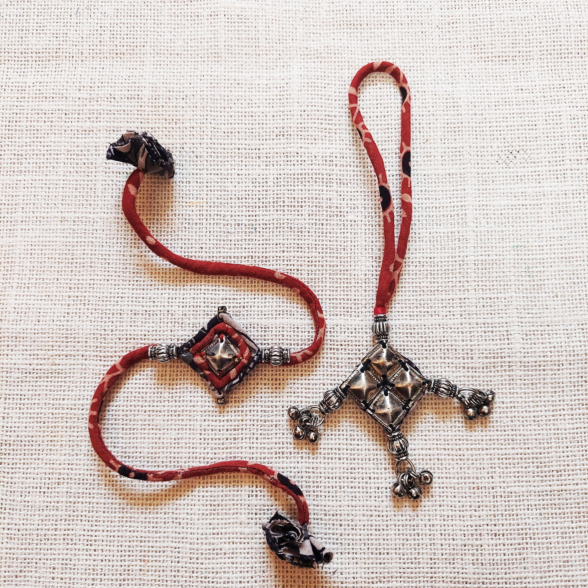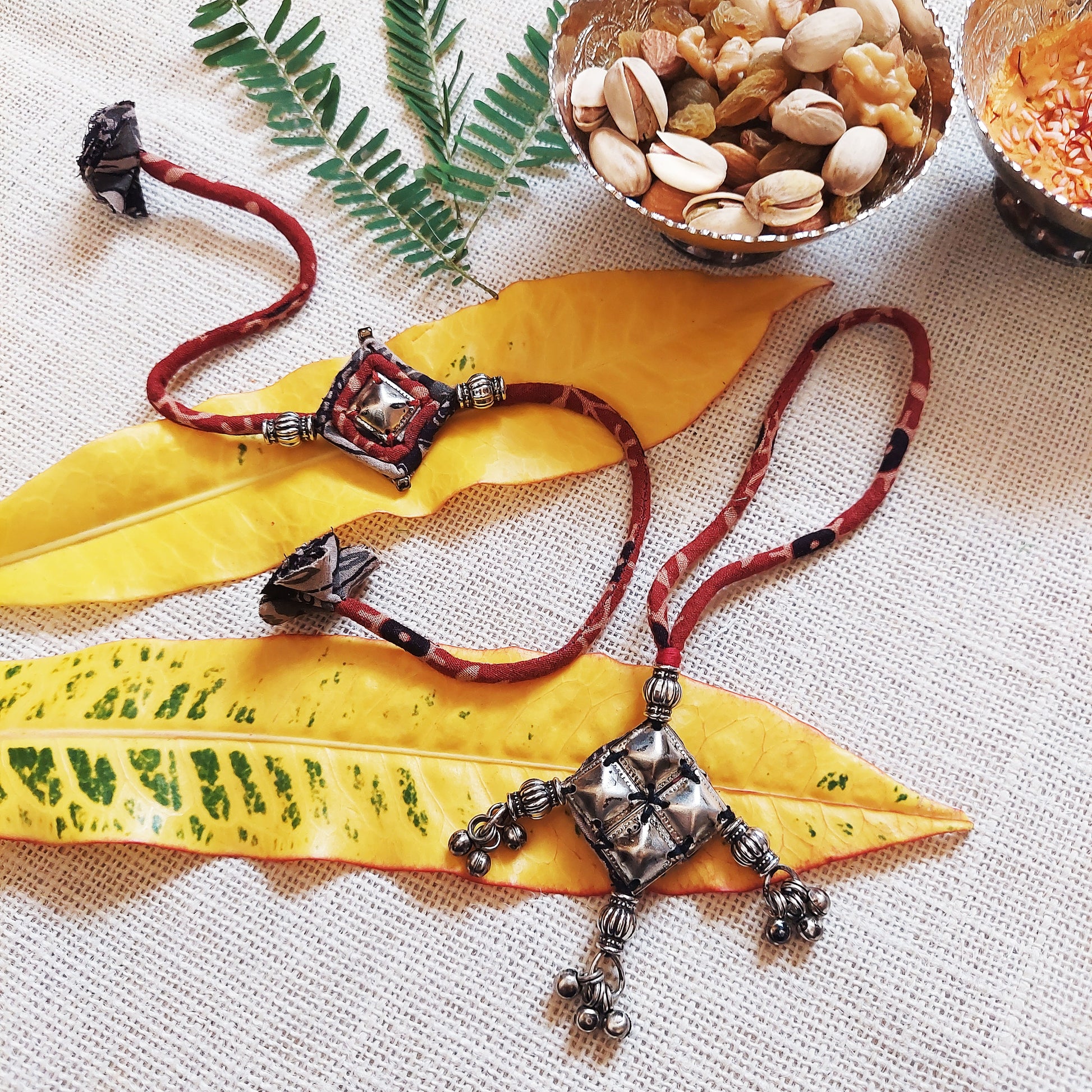 Handcrafted Rakhi Lumba Set for your Brother and Bhabhi, made using Ajrakh cotton pipings and adorned with Antique Metal beads and Ghungroos. A unique Set to celebrate this special bond.