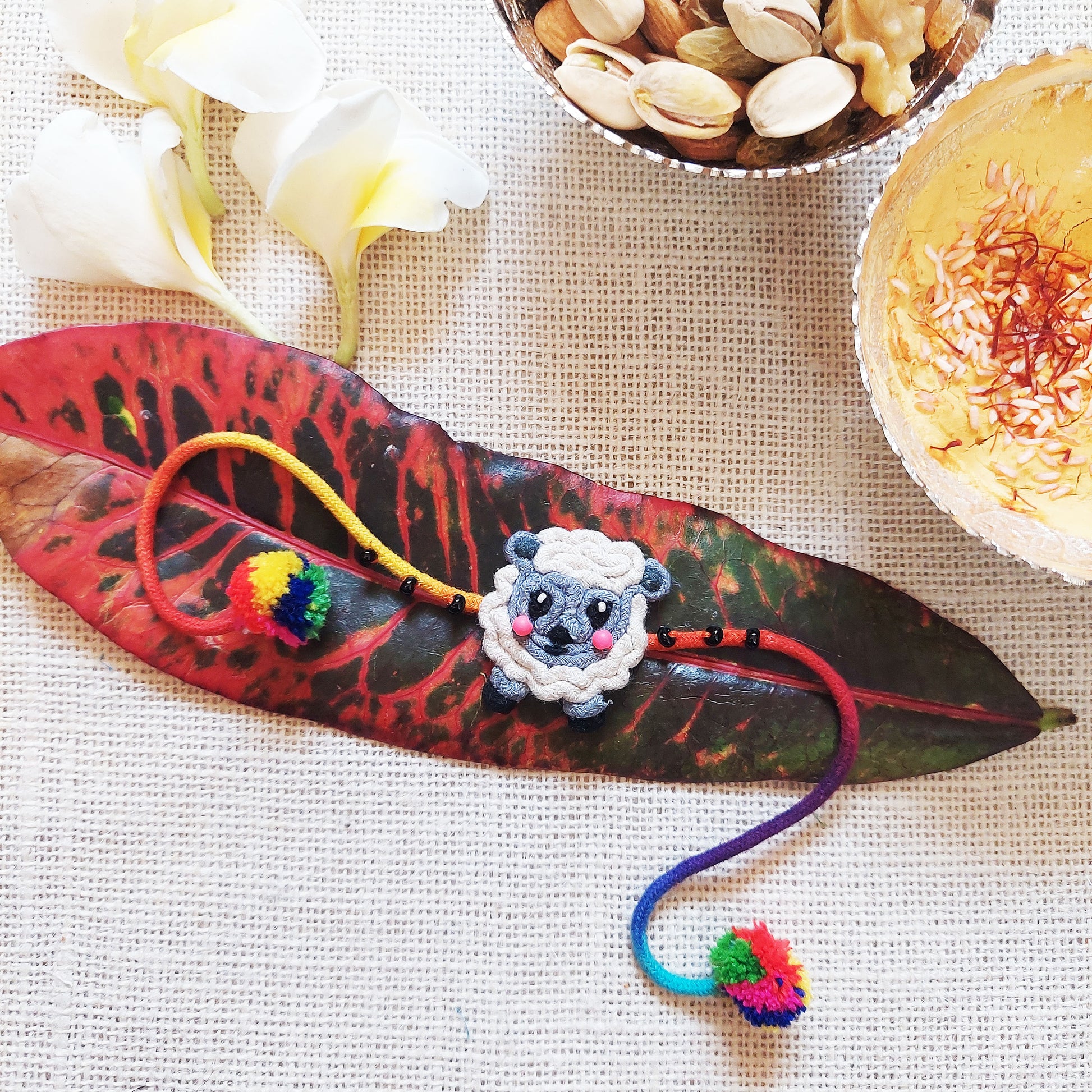 Handmade Rakhi for your little brother. This one has a Sheep created in our signature Dori Work and embellished with Ceramic beads and pompoms. Very Adorable Rakhi to celebrate this Special bond.
