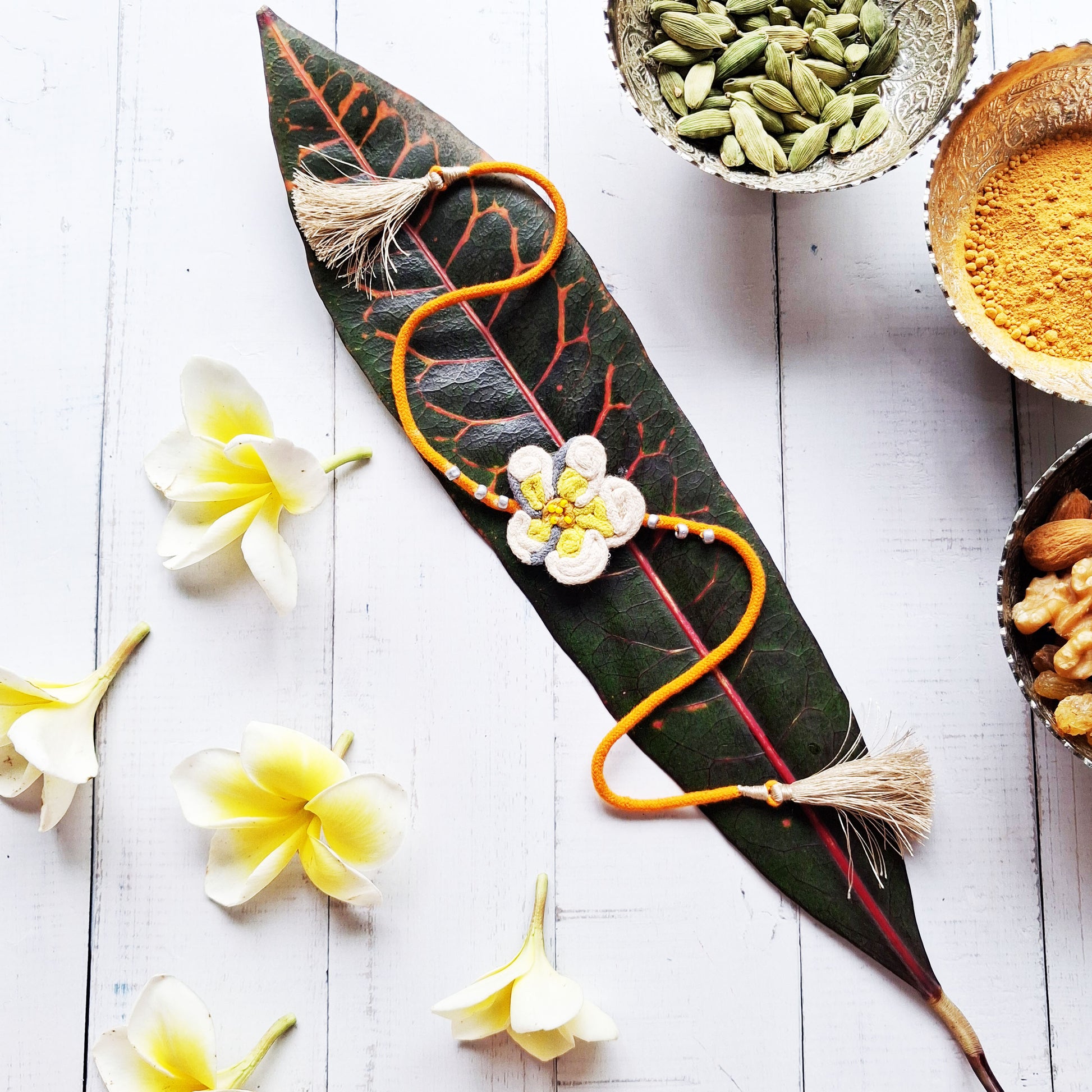This is a Handmade Rakhi created with our signature Doriwork with a beautiful frangipani flower design adorned with metallic silver beads. The Rakhi is finished wth Silk tassels.