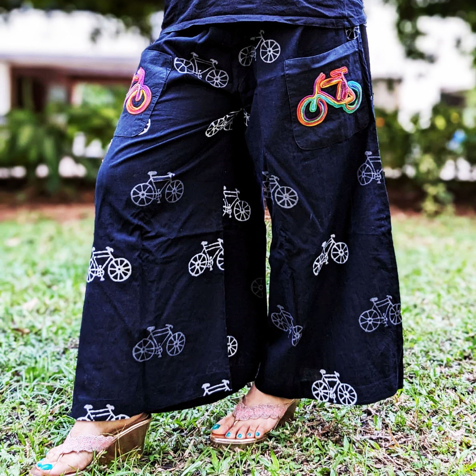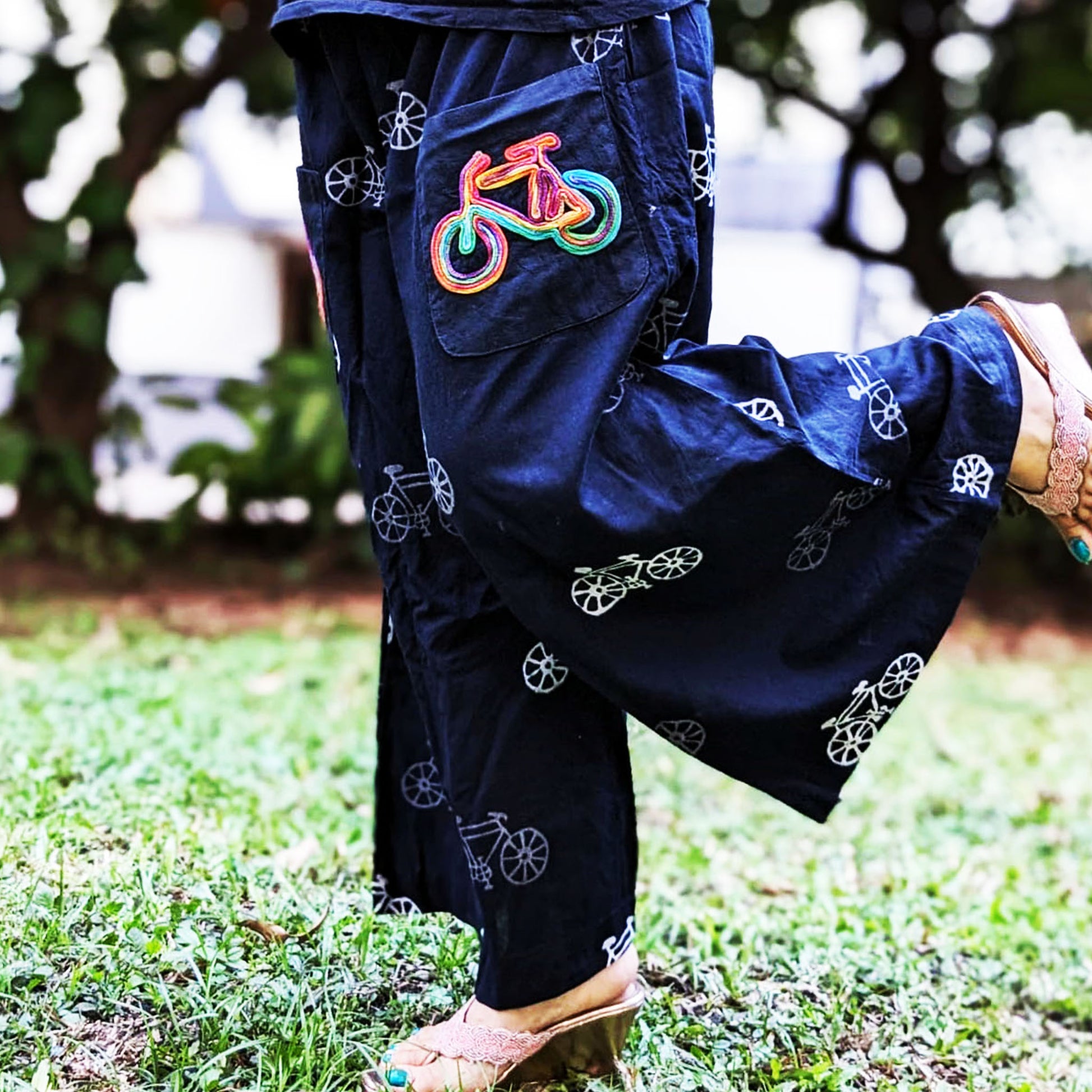 This Cotton Palazzo is a perfect pick for the upcoming Summer Season. Its cool design and even cooler Pockets make it a unique garment and versatile to be worn with T- shirts or Kurtas. The pocket detail has a handcrafted Bicycle in our signature Dori work technique to compliment the Cycle Printed Fabric. This is available in different sizes and has a zipper on the left and a drawstring for adjustment.