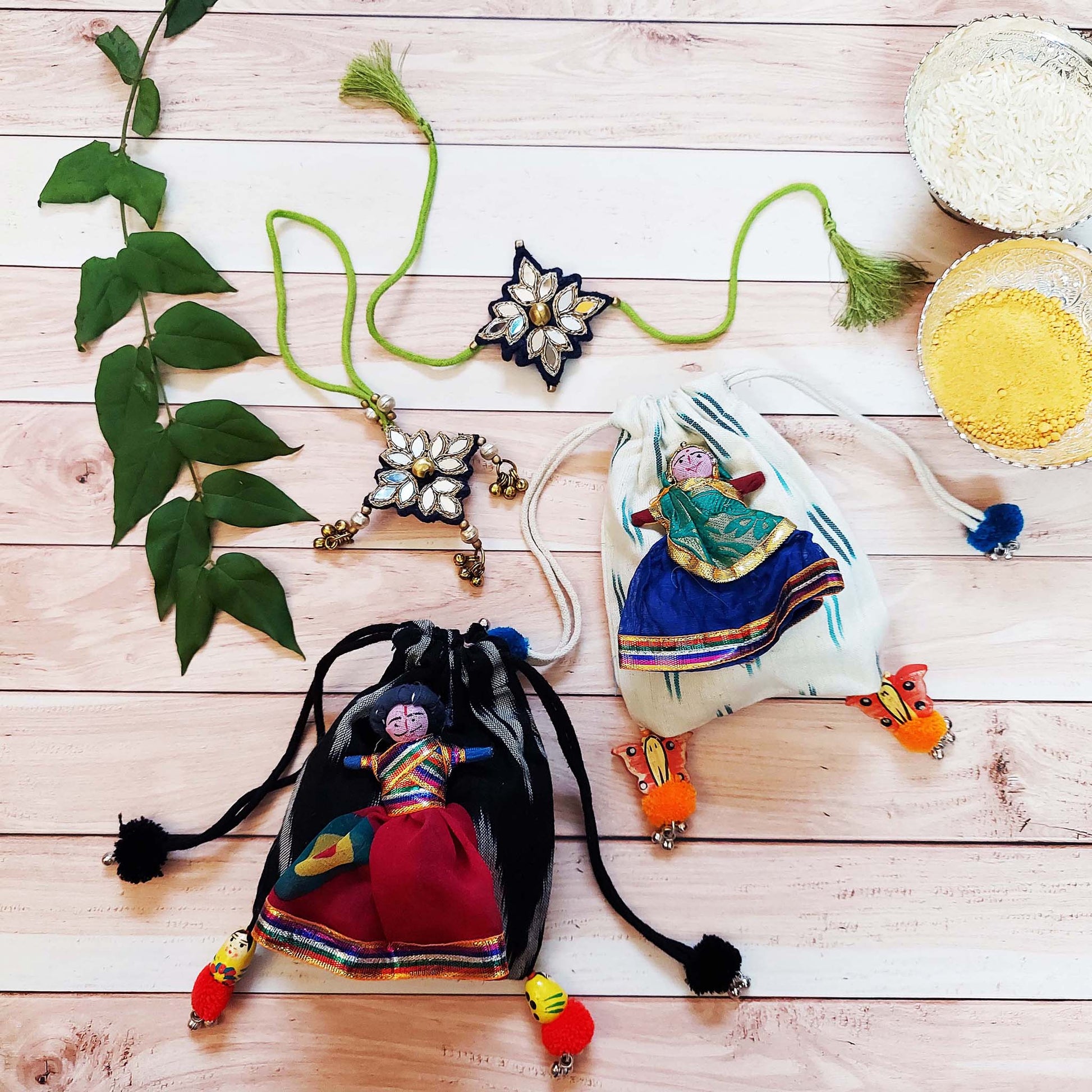 A pair of Ikat Potlis with Rajasthani Kathputlis and a mirrorwork Rakhi Lumba set