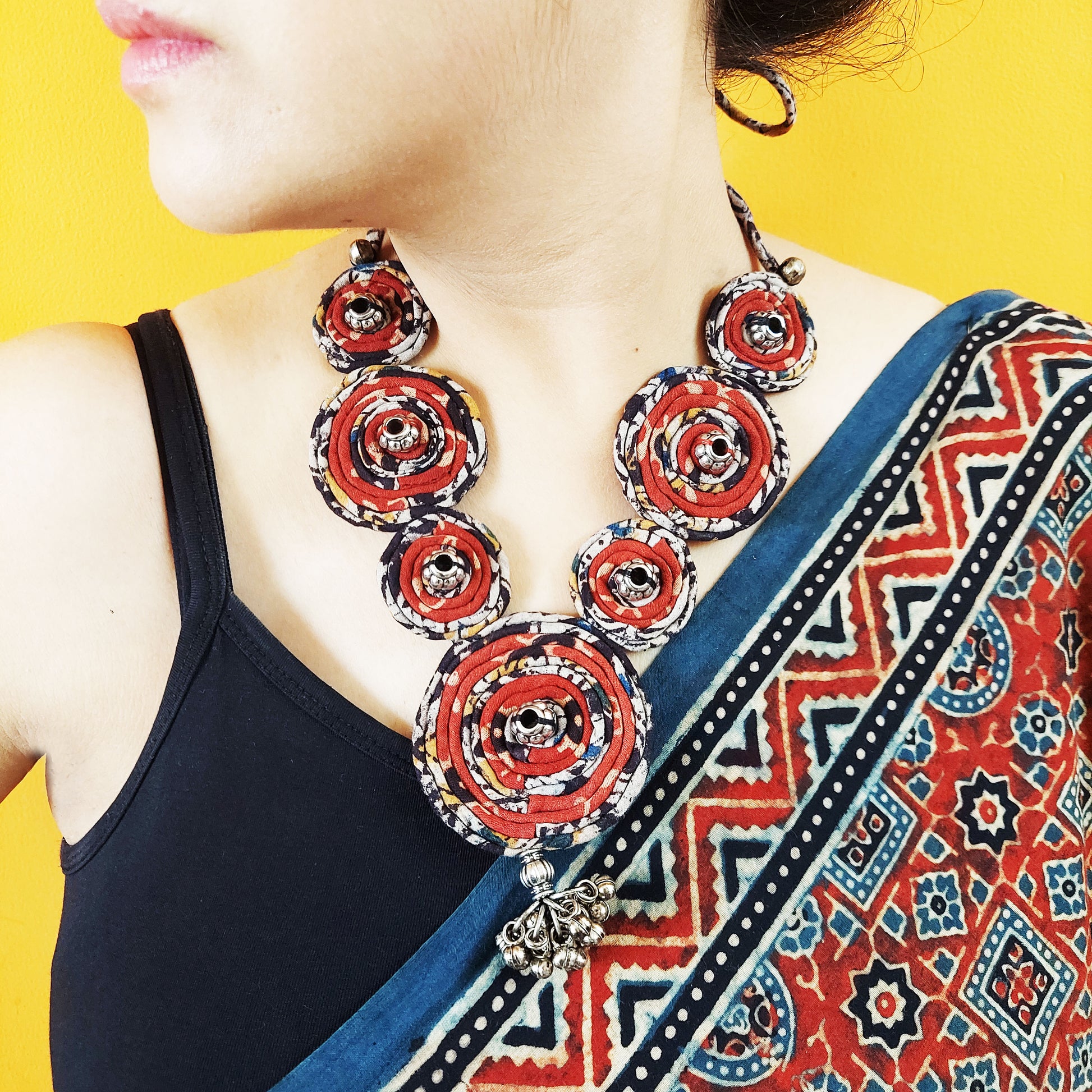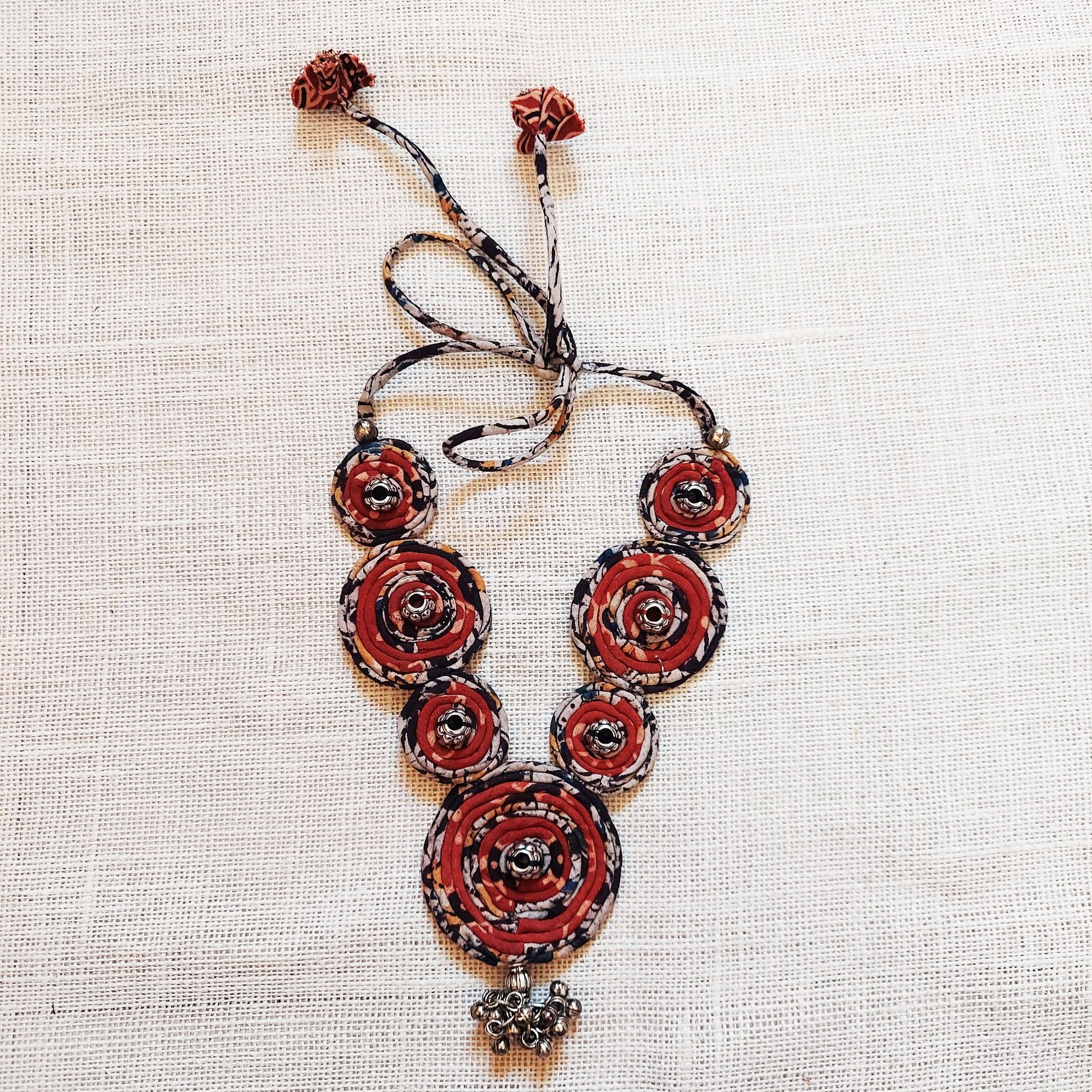 This Necklace is handcrafted with upcycled Ajrakh Fabric Pipings. It is adorned with Metal Beads and Ghungroos to give it a Festive Look and strings are finished with tassels.