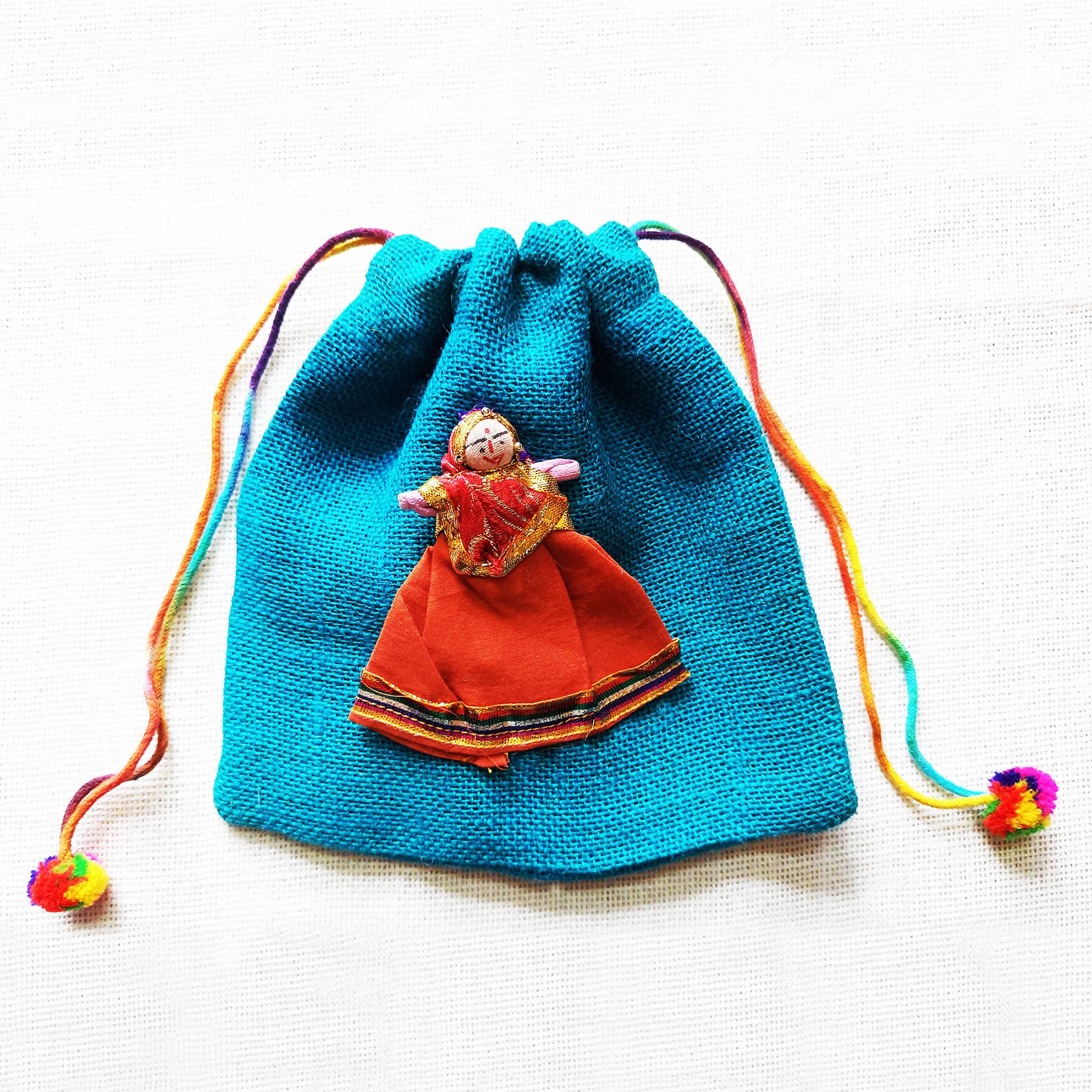 Add some Indian culture to your wardrobe with this Blue-Kathputli-Potli. Exquisitely crafted using high-quality jute and featuring a single handmade puppet stitched to it, this potli is sure to turn heads. It has a drawstring closure which ensures your valuables are safe and secure. Get the perfect traditional look with this amazing creation!