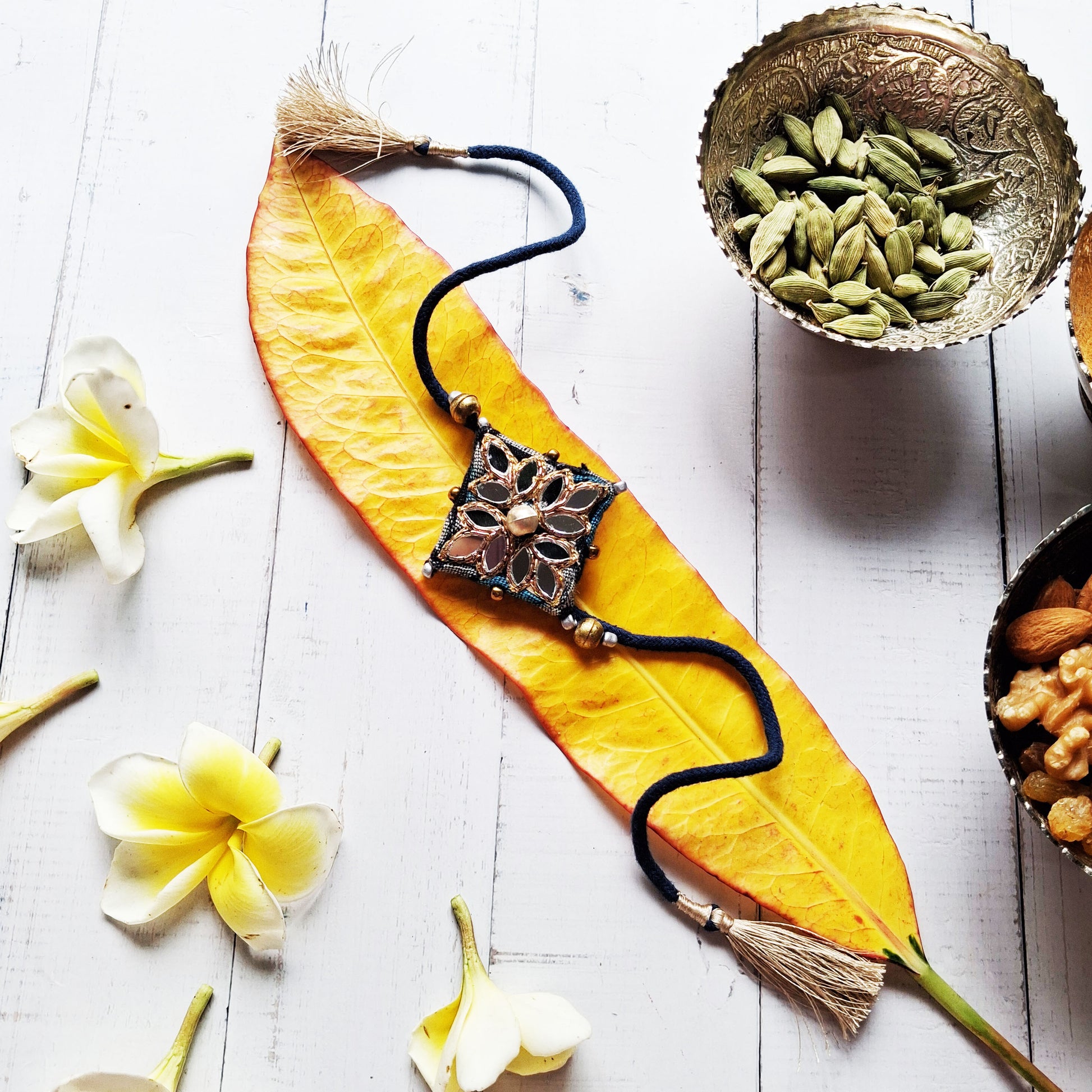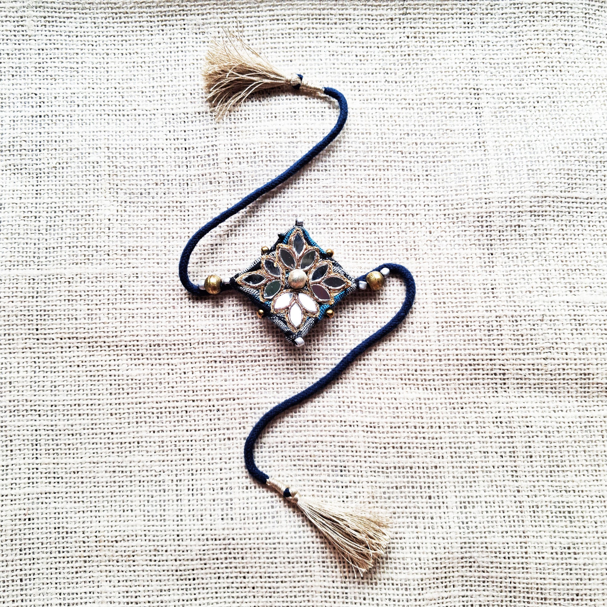 This is a handmade textile Rakhi created using Ikat pipings and embellished with mirrorwork and metallic beads, The Rakhi is finished with silken tassels.
