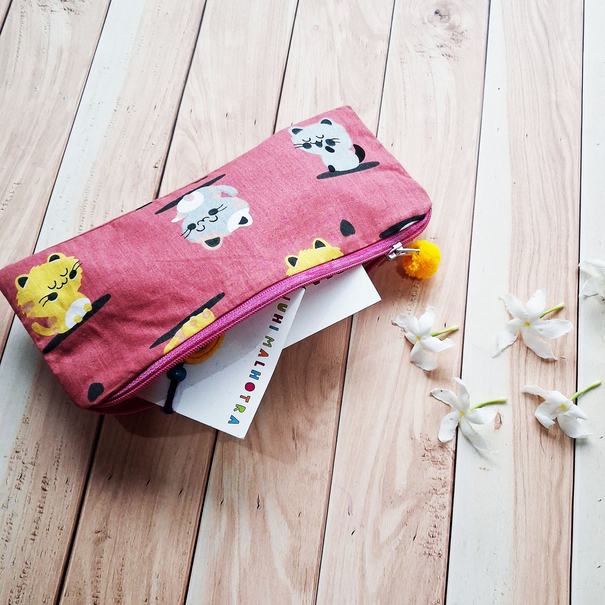 This hamper contains a Kitty Printed Zipper Pouch. It has a handmade Burger Rakhi made with our signature doriwork. It also has a Paper Boat Dry Fruit and Nutty Trail mix alongwith a Happy Rakhi Card.