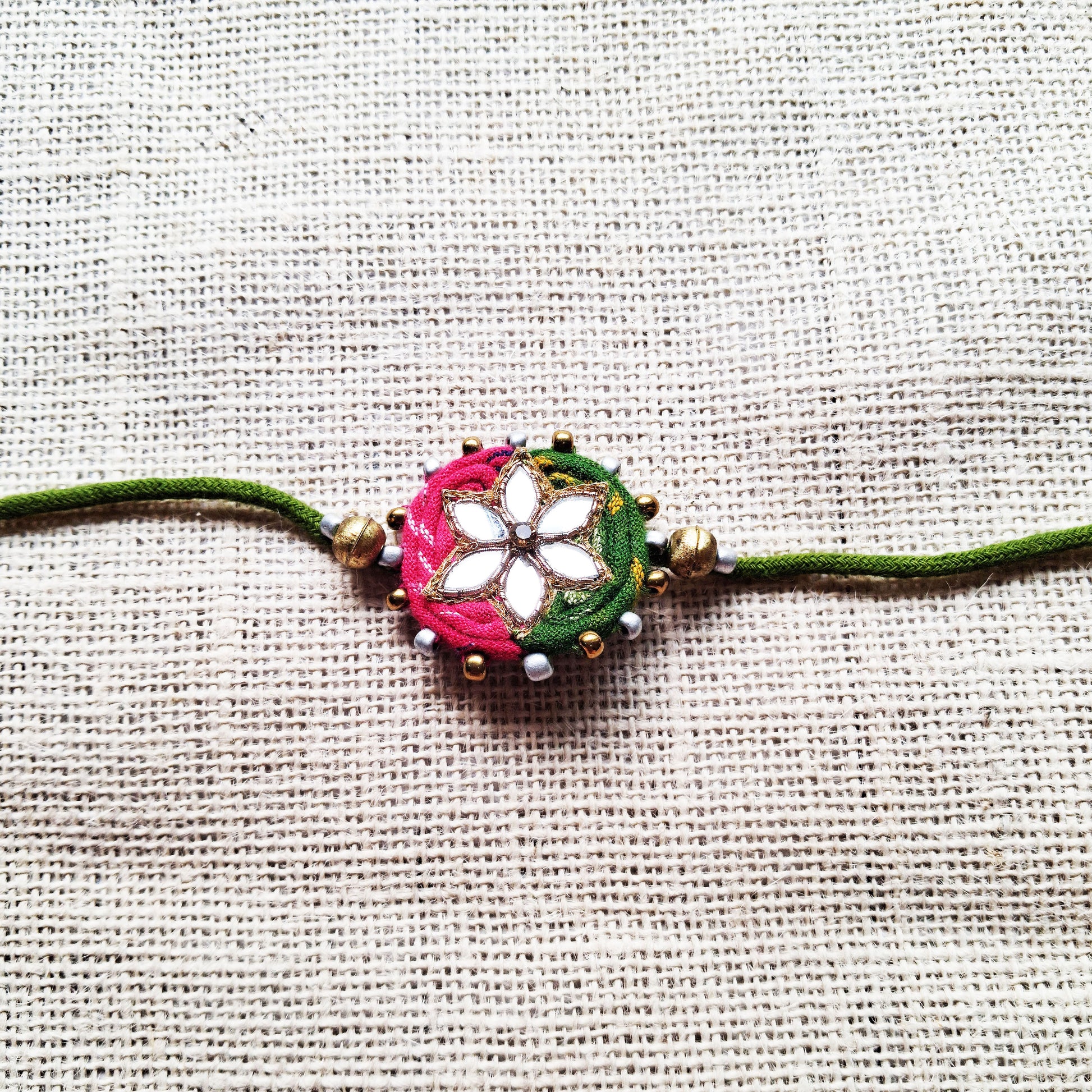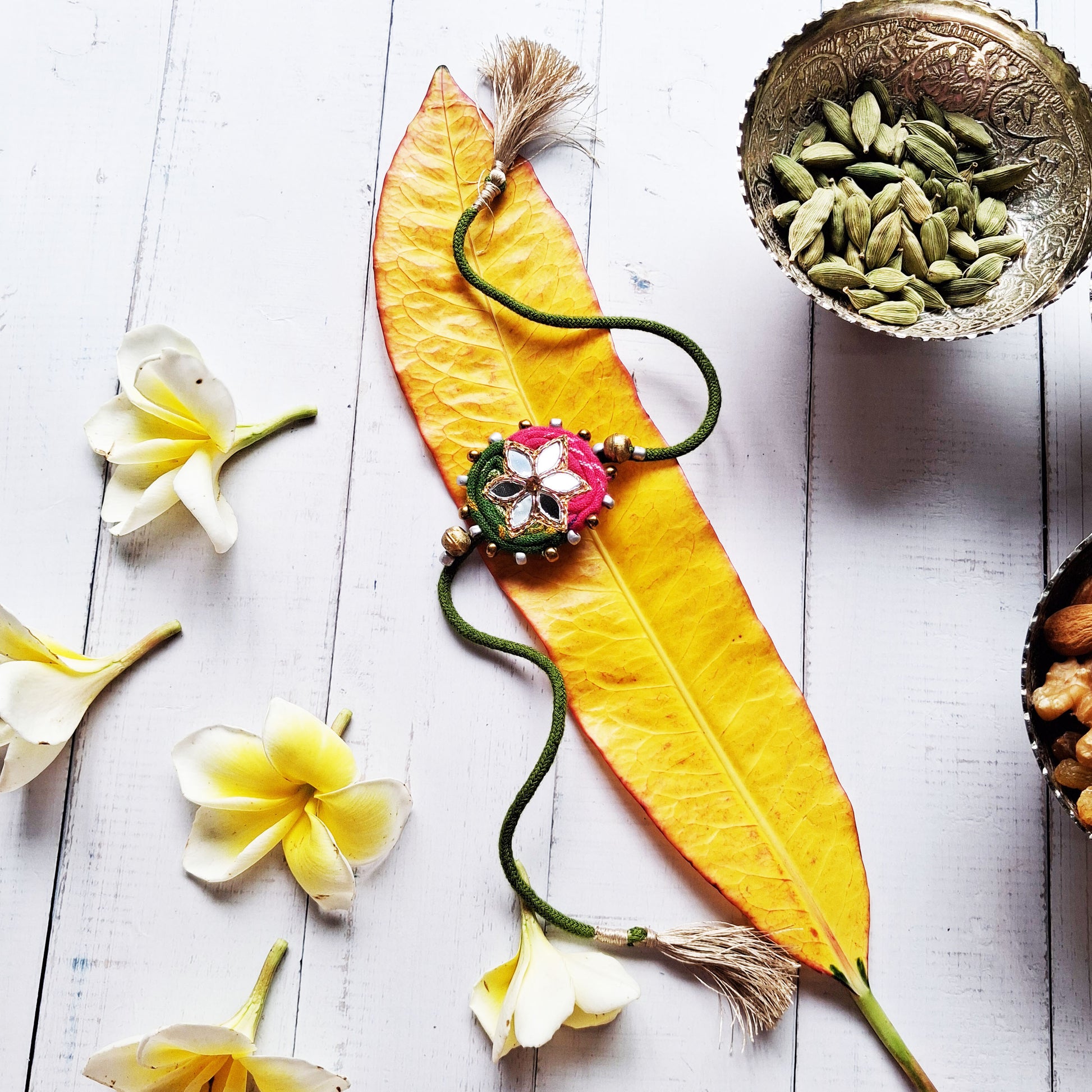 This is a handmade textile Rakhi created using Ikat pipings and embellished with mirrorwork and metallic beads, The Rakhi is finished with silken tassels.