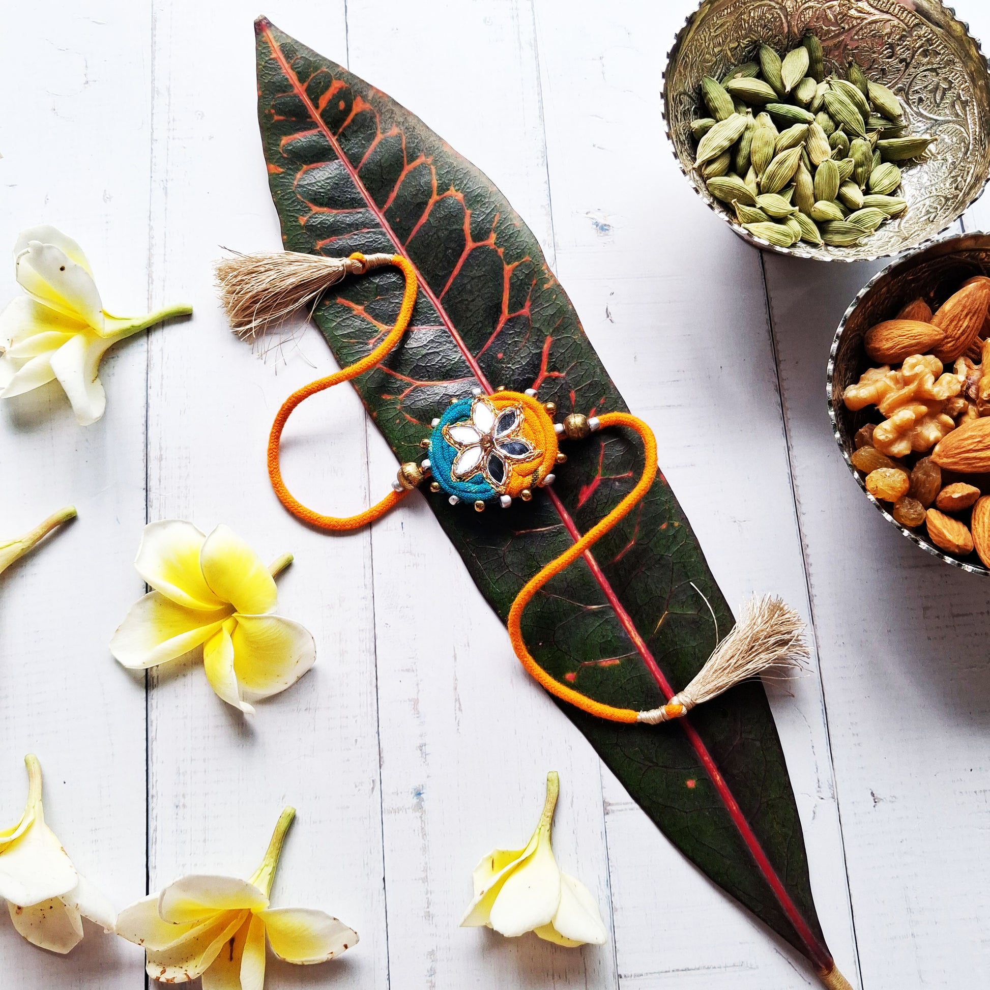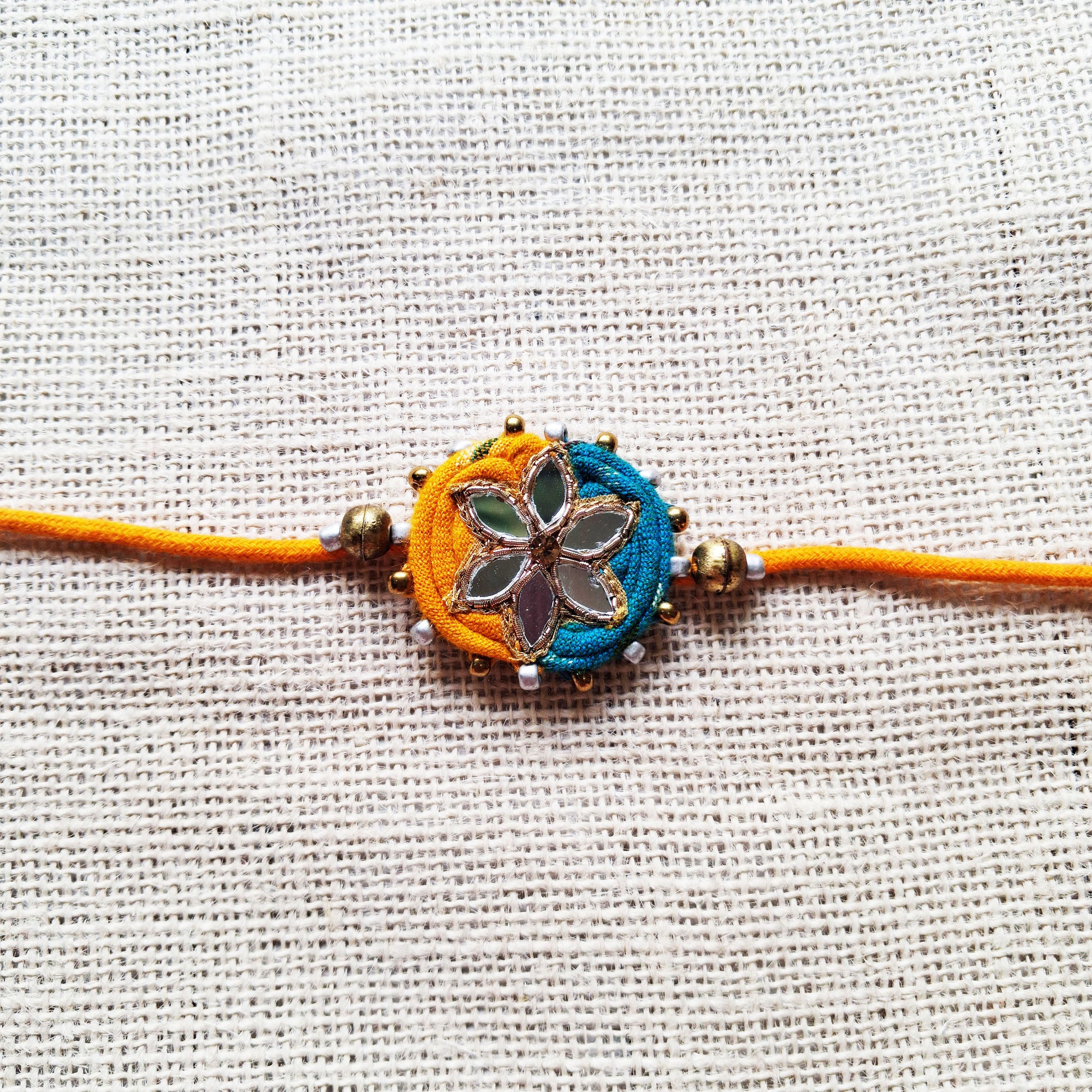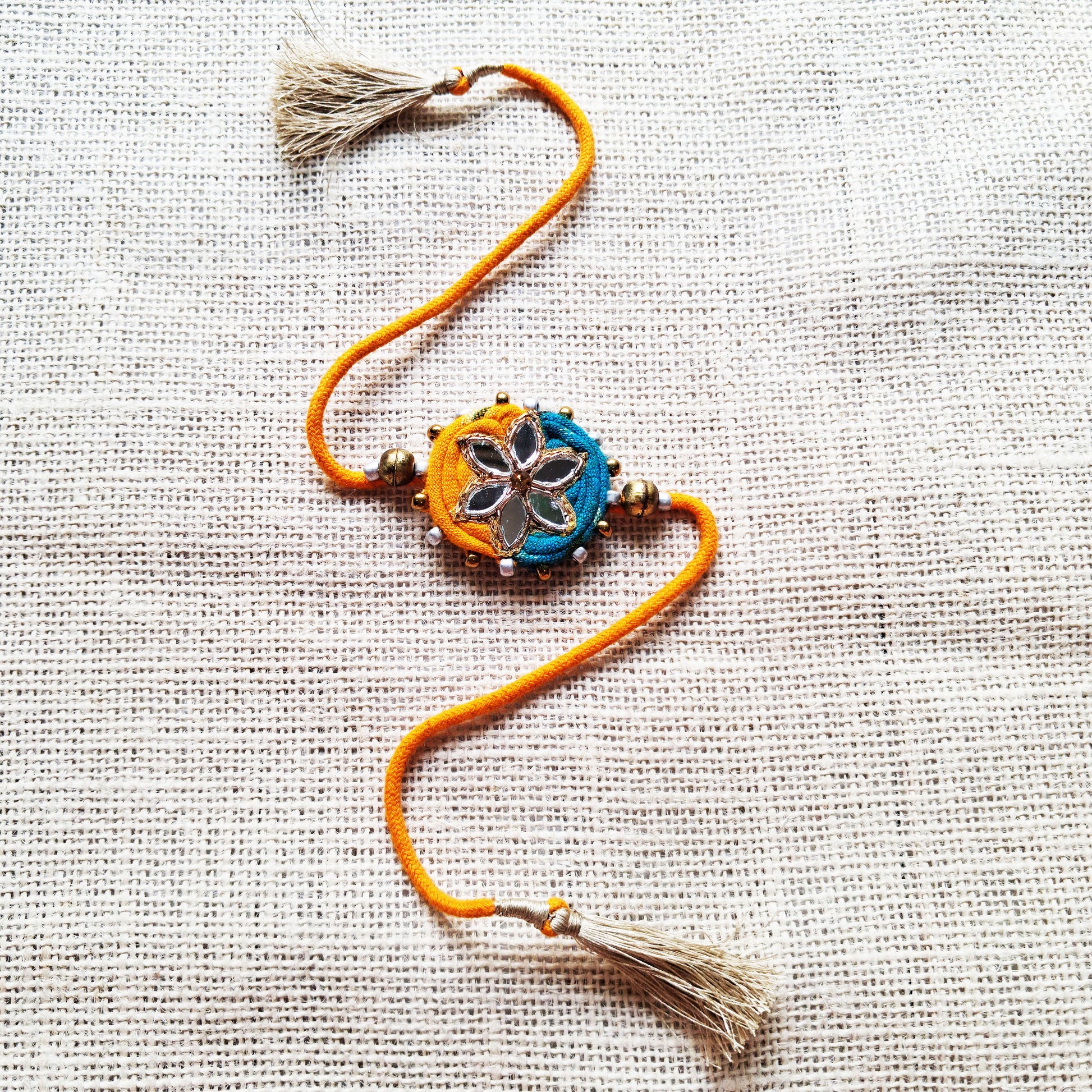 This is a handmade textile Rakhi created using Ikat pipings and embellished with mirrorwork and metallic beads, The Rakhi is finished with silken tassels.