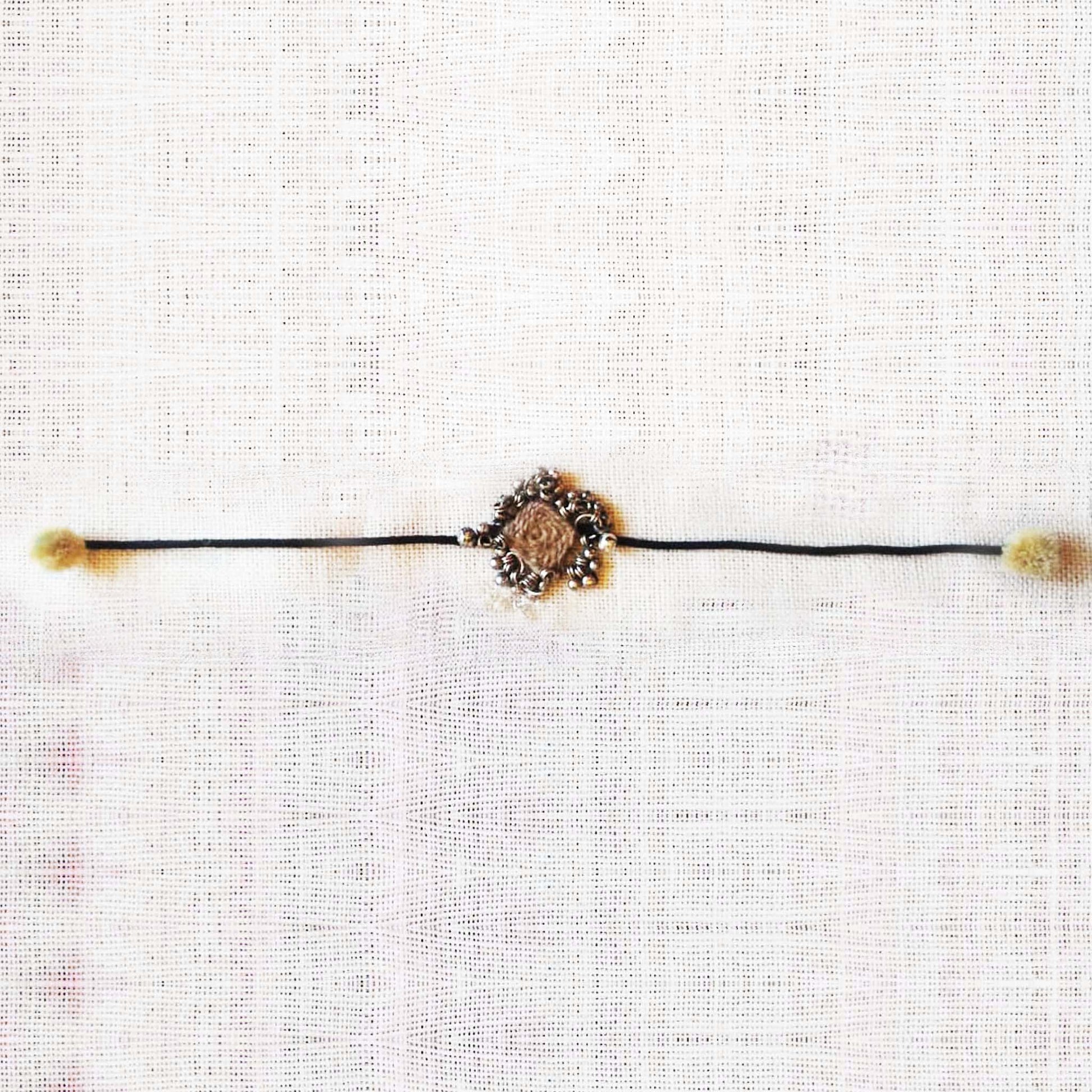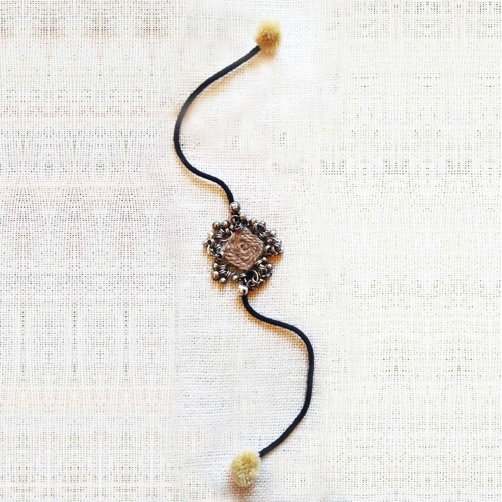 Classic and Ethnic Jute Rakhi adorned with antique ghungroos, hand sewn on a black dori and finished with pompoms