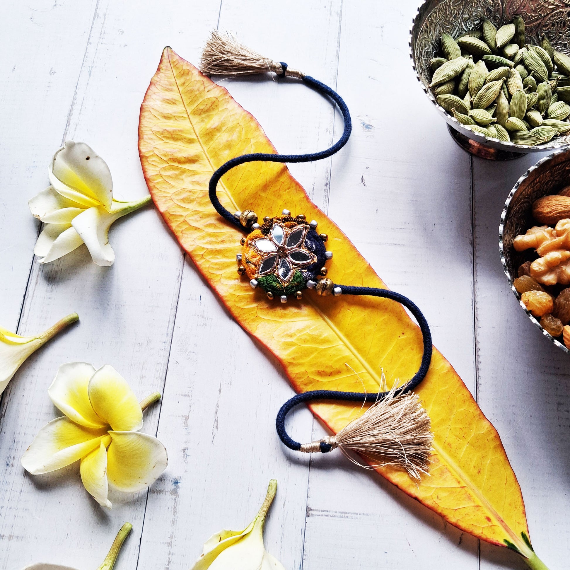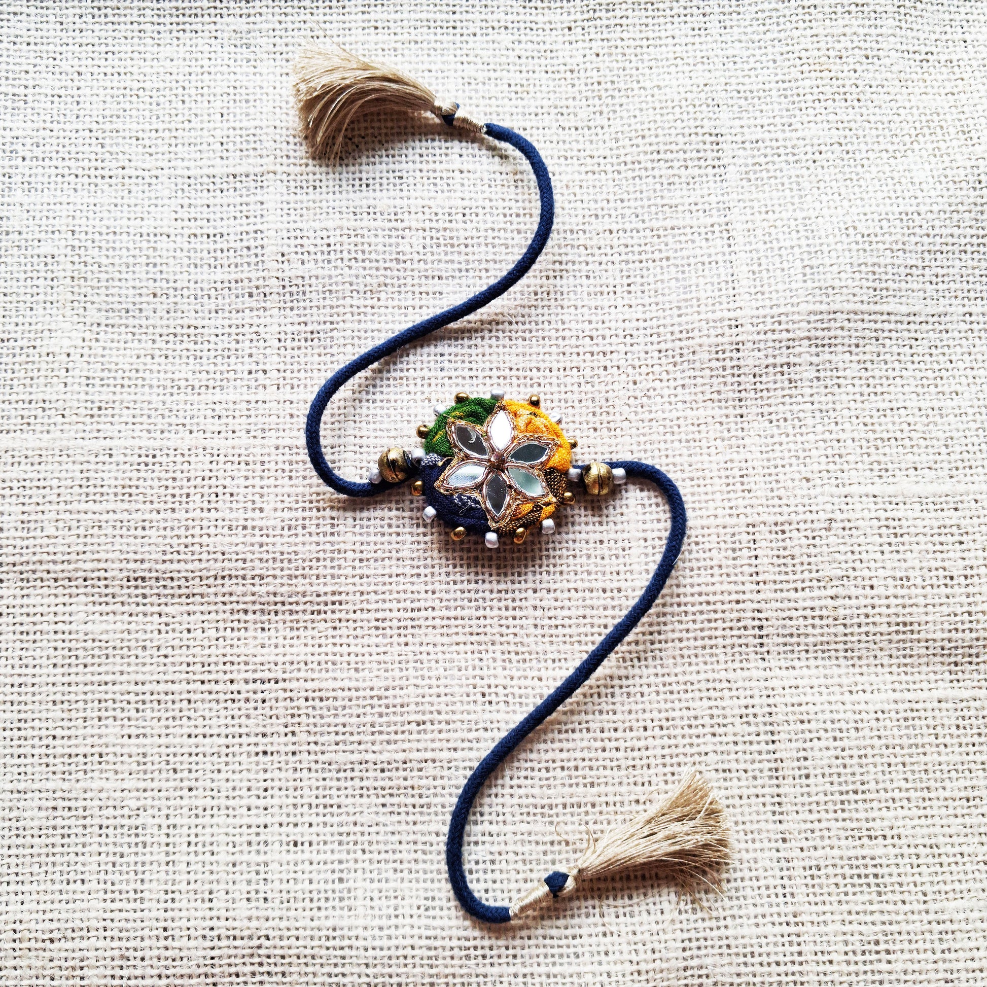 This is a handmade textile Rakhi created using Ikat pipings and embellished with mirrorwork and metallic beads, The Rakhi is finished with silken tassels.
