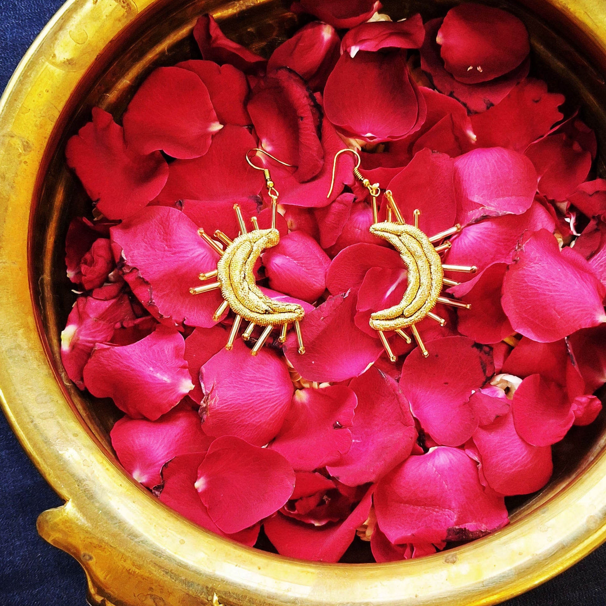 Handcrafted from Gold fabric, these danglers are special and can transport you into the beautiful night sky. These are perfect to flaunt at your festive ocassions and will turn heads wherever you go.