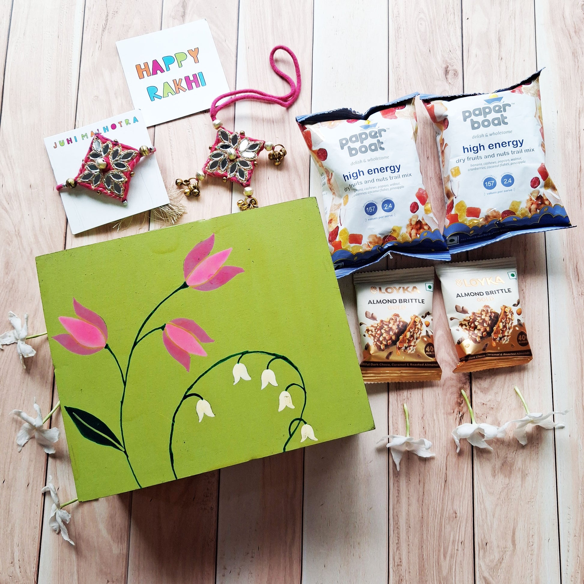 This hamper contains a hand painted box with flowers. It has a handcrafted Mirrorwork Rakhi Lumba set. It also has two small packets of Almond Brittle and two packets of Paper Boat Dry fruits and nutty trail mix alongwith a Happy Rakhi card.
