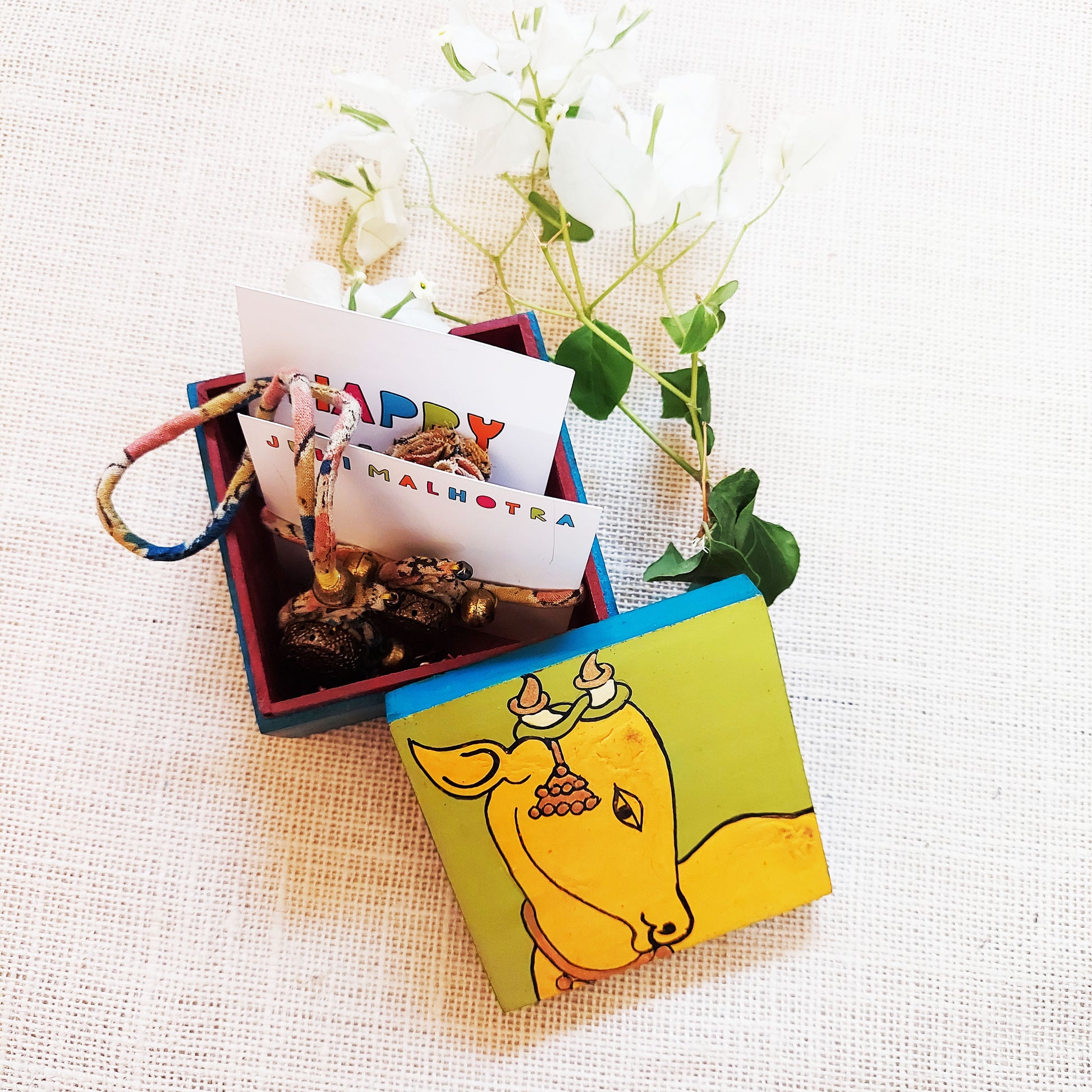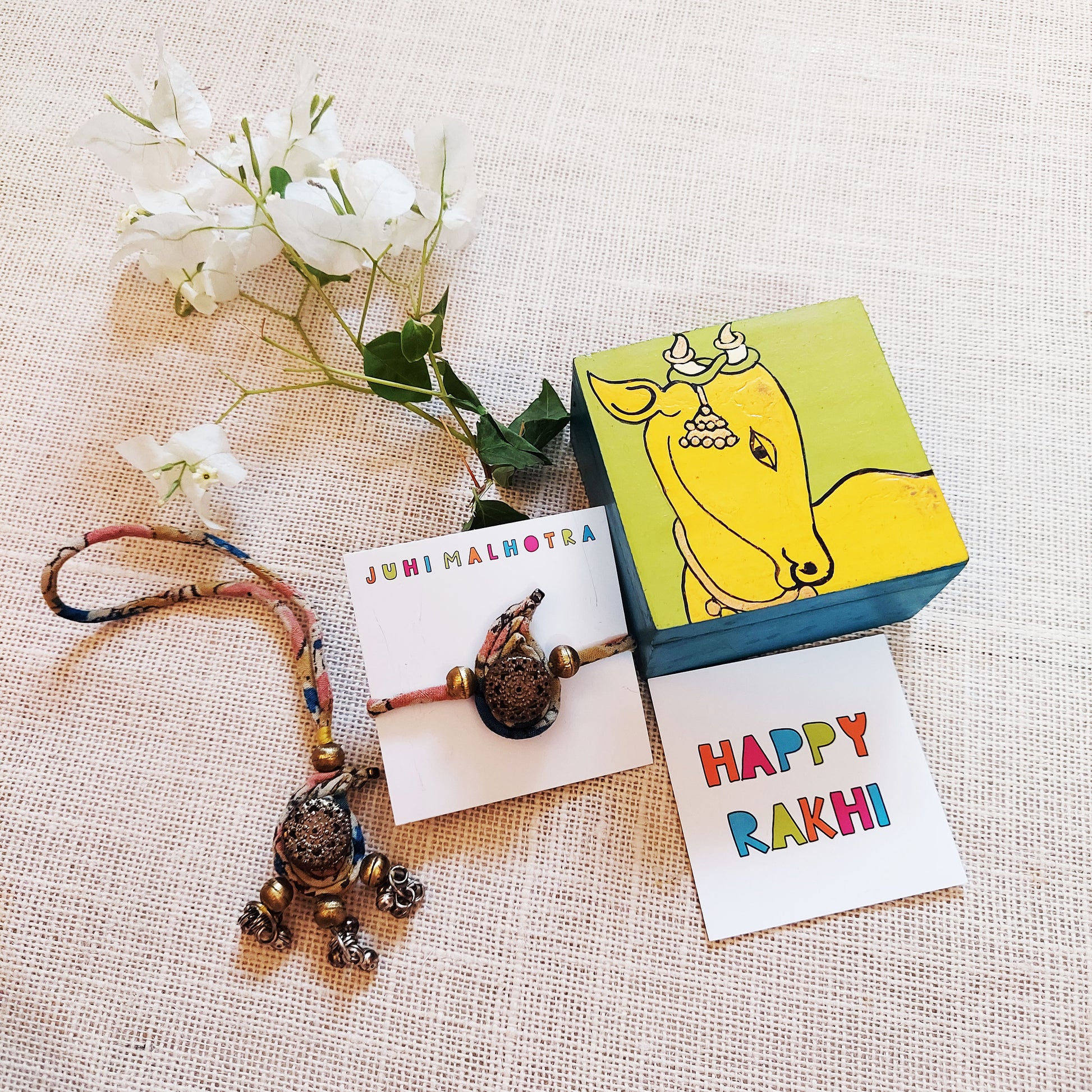 A Rakhi Lumba Hamper for your brother and sister in law. A hand painted box with a handmade Rakhi and Lumba Set alongwith a handmade Rakhi Card to celebrate this pious bond.