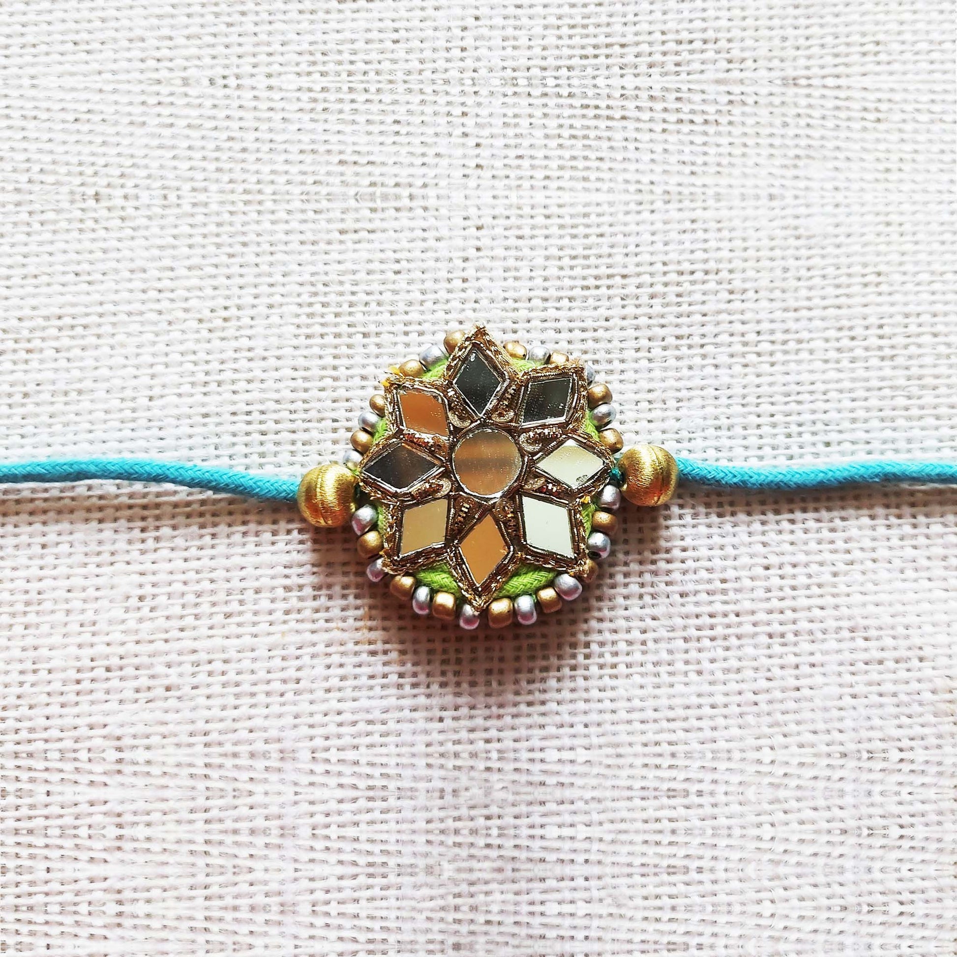 Sitara Rakhi made using age old technique of mirrorwork, adorned with beads and pompoms. A truly Royal Rakhi.