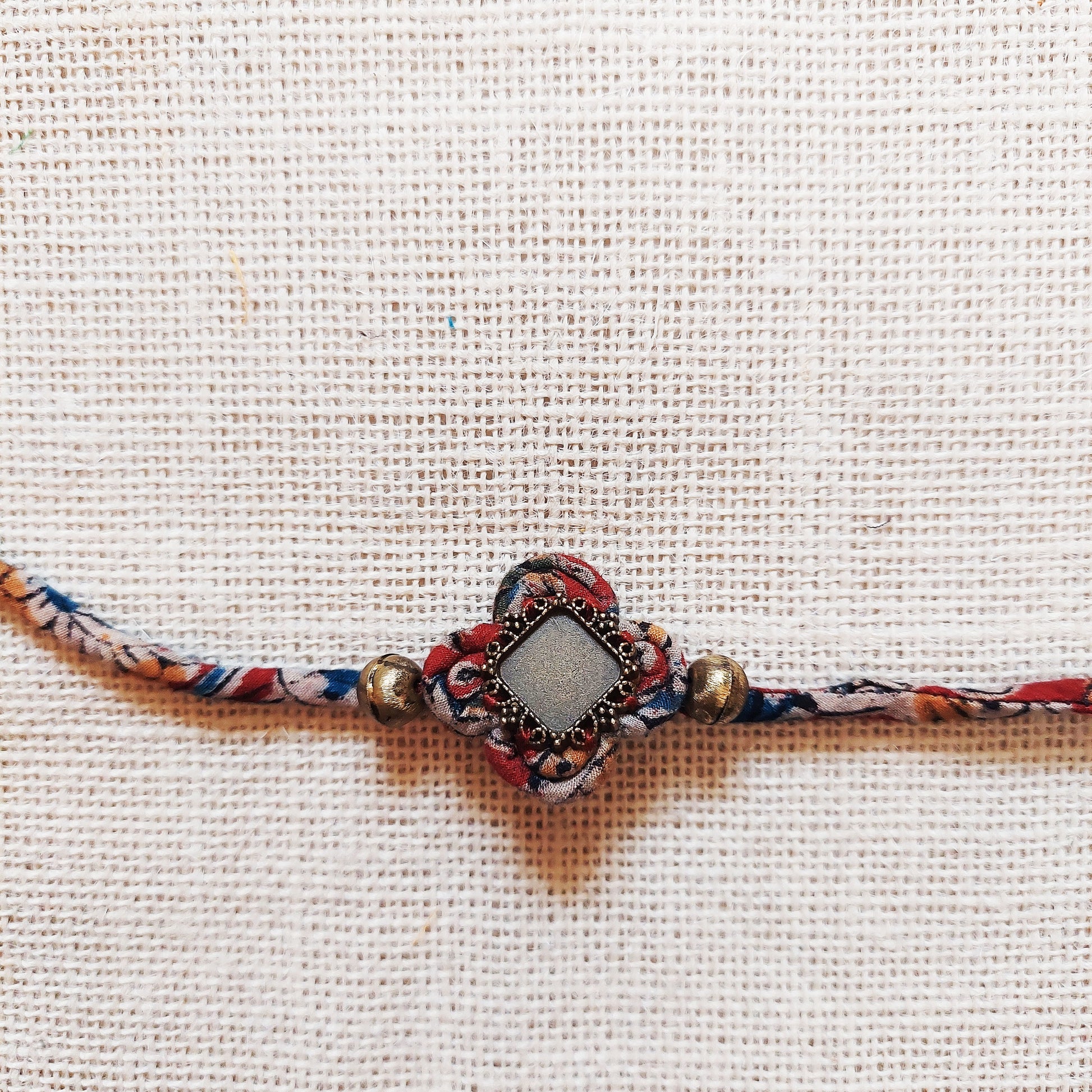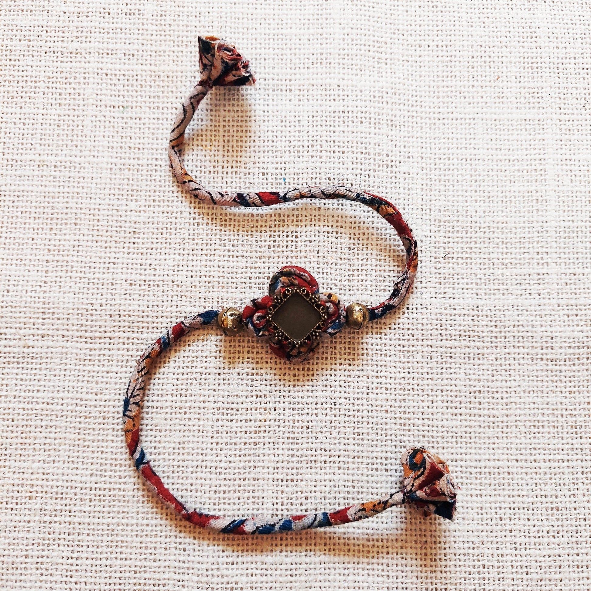 Handcrafted Rakhi for your dear brother. This is made using Kalamkari cotton pipings and finished with tassels. This embodies the rich heritage of our country and artisans. Rakhi is adorned with antique beads to make it unique and special.