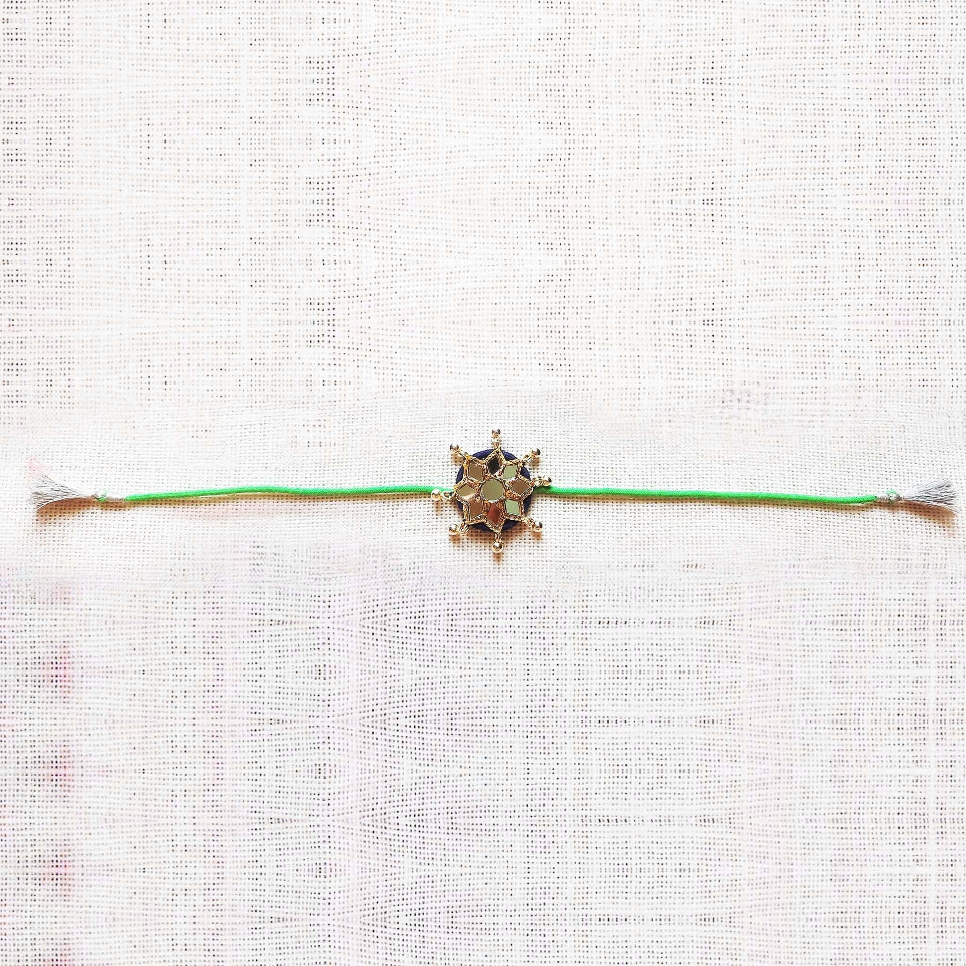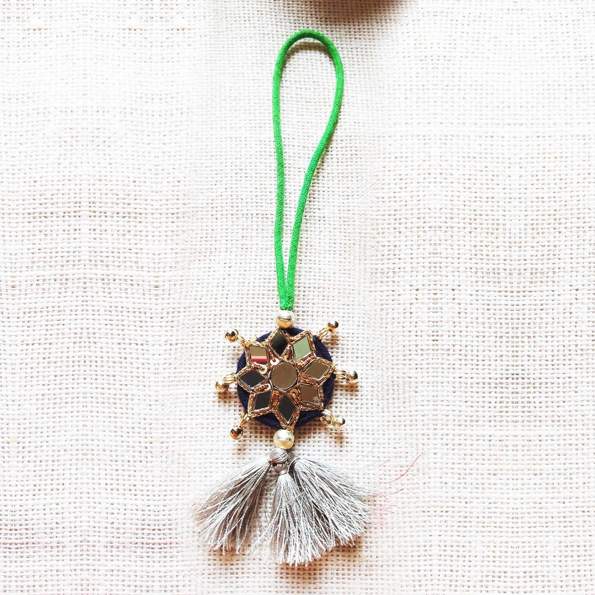 A classic Sitara Rakhi Lumba set. Rakhi and Lumba are made with Cotton dori, adorned with age old mirrorwork and beads and finished with Fine Silken tassels.