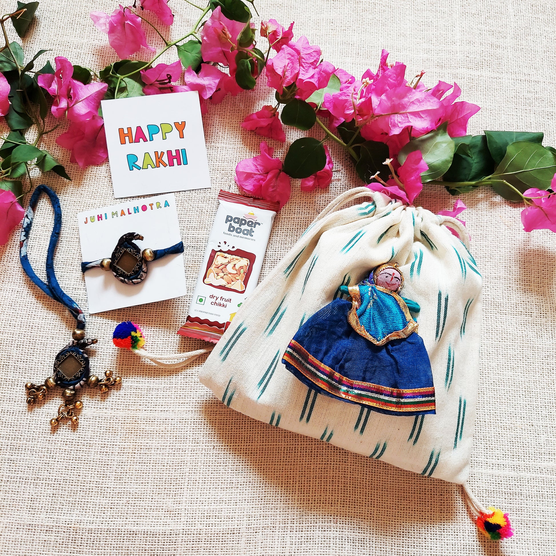 Ikat Potli hamper in white with an indigo Rakhi Lumba Set, a paper boat chikki and a happy Rakhi card to celebrate this pious bond.