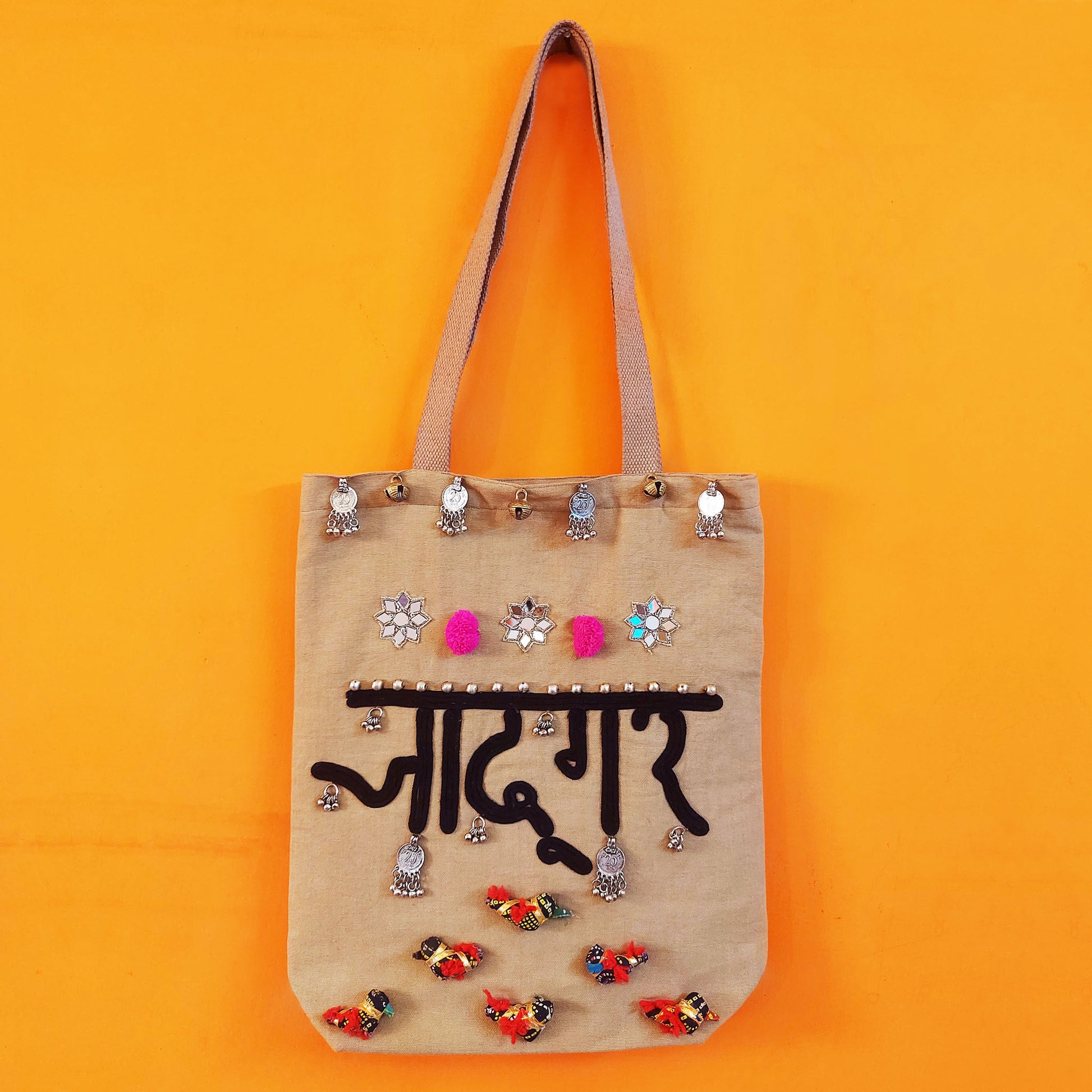 This bag is made in Beige Cotton Canvas and is embroidered in our signature Doriwork with 'Jadugar' written in Hindi. It is embellished with mirrorwork, metallic ghungroos and fabric birds. A bag that is created for all those who believe in magic.