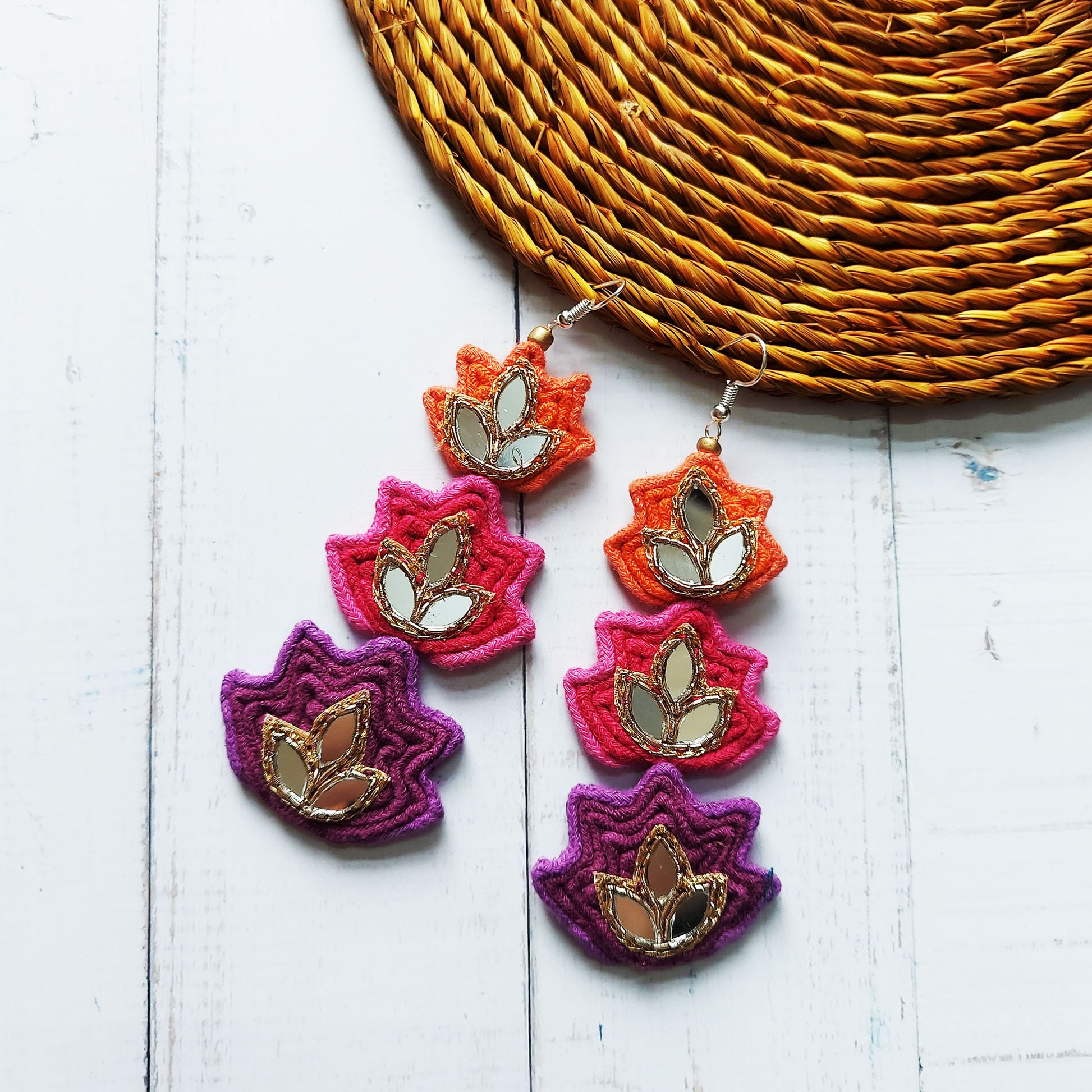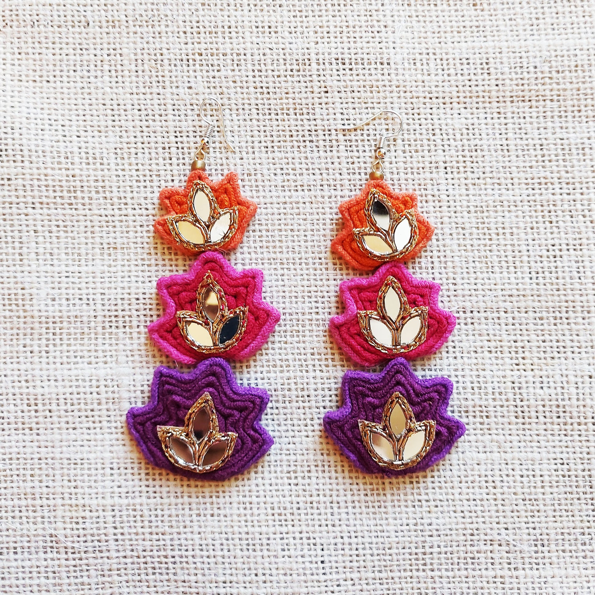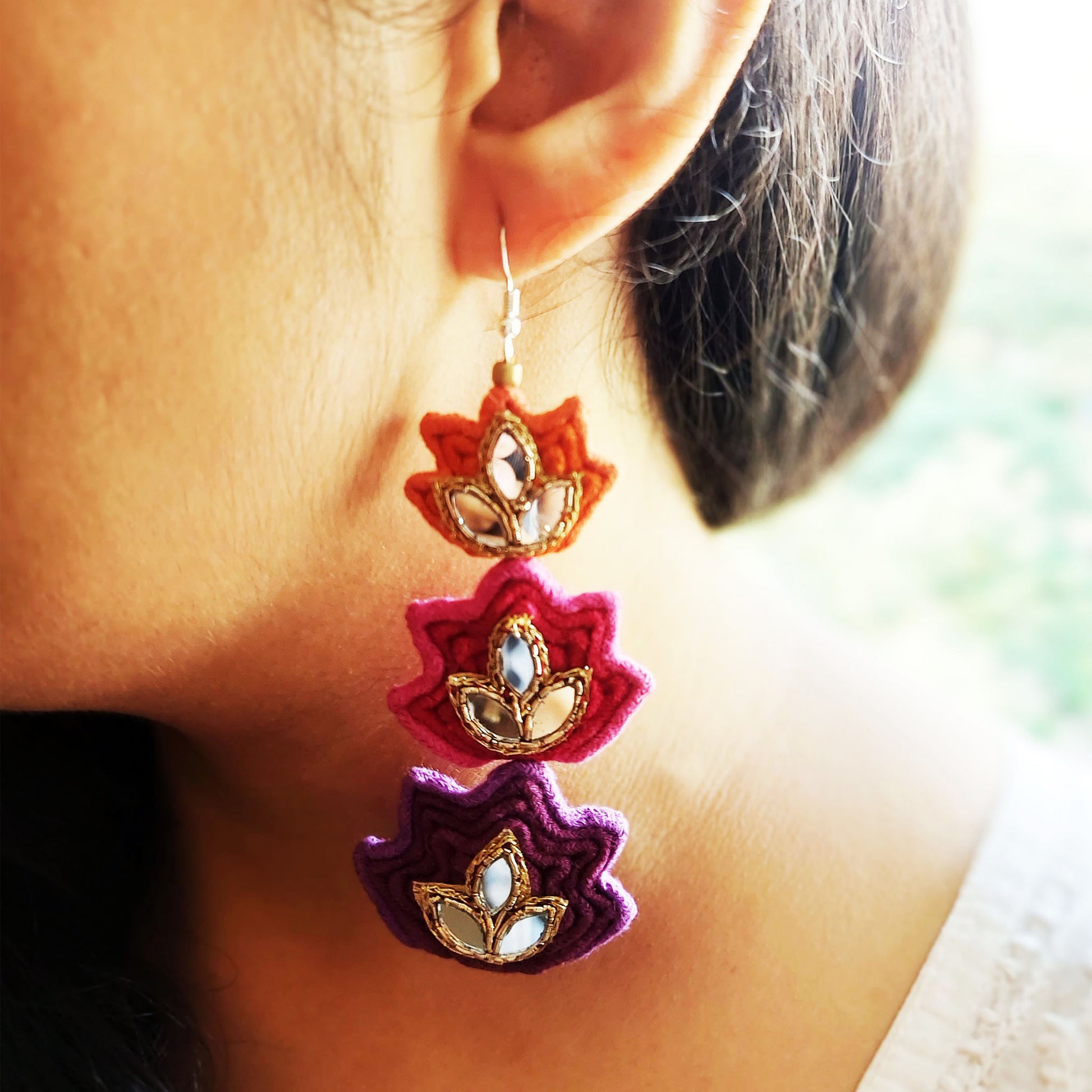 Three layered Lotus earrings in vibrant shades of pink, orange and purple adorned with Mirrorwork. A perfect pair to add a pop of color to your outfit.