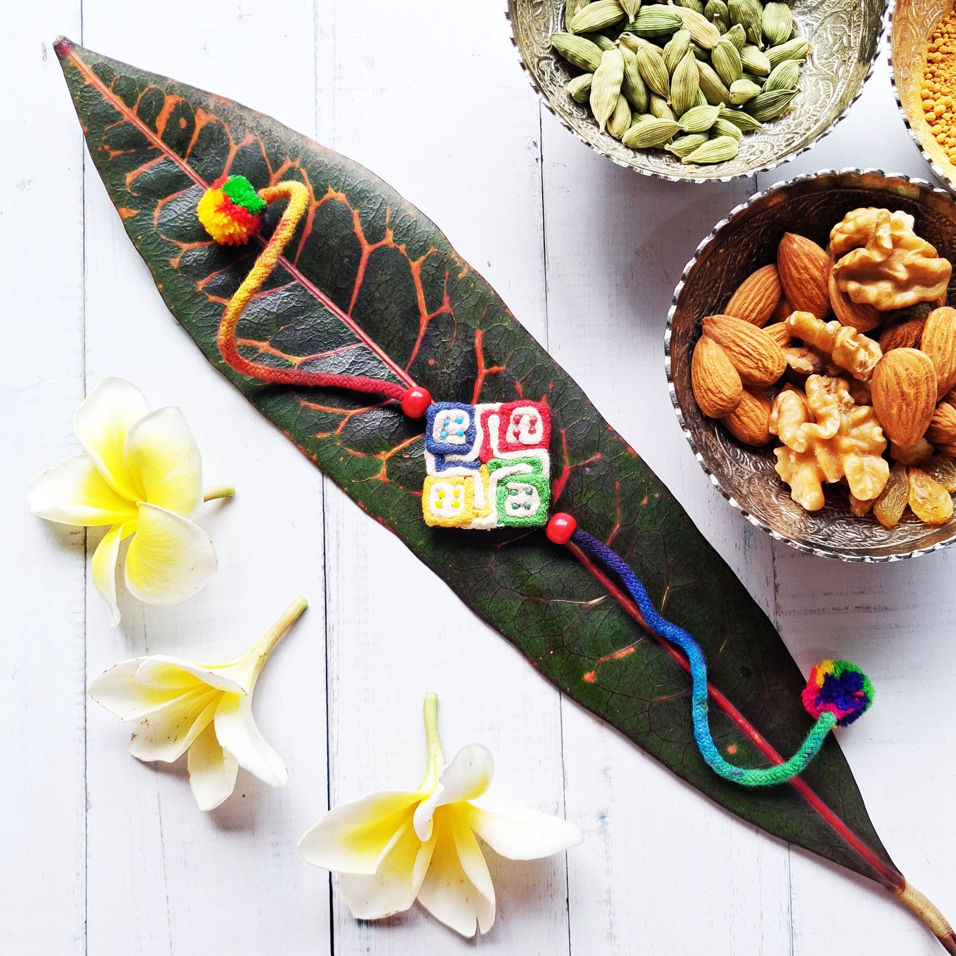 This Rakhi has the classic Ludo game embroidered in our signature Doriwork to cherish the sibling bond. It is adorned with wooden beads and pompoms on each side.