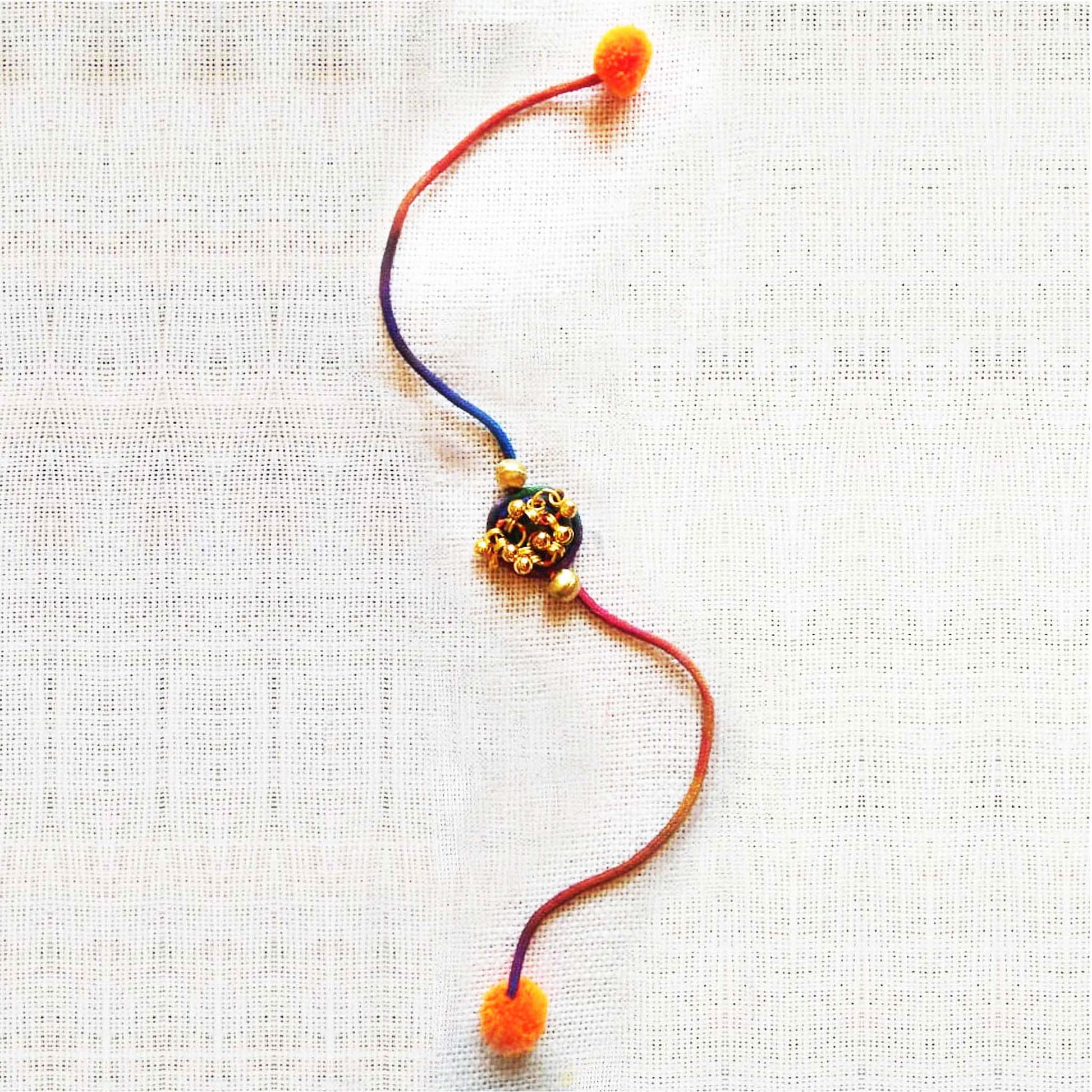 Multicolor gold handmade Rakhi in cotton Dori, finished with Pompoms