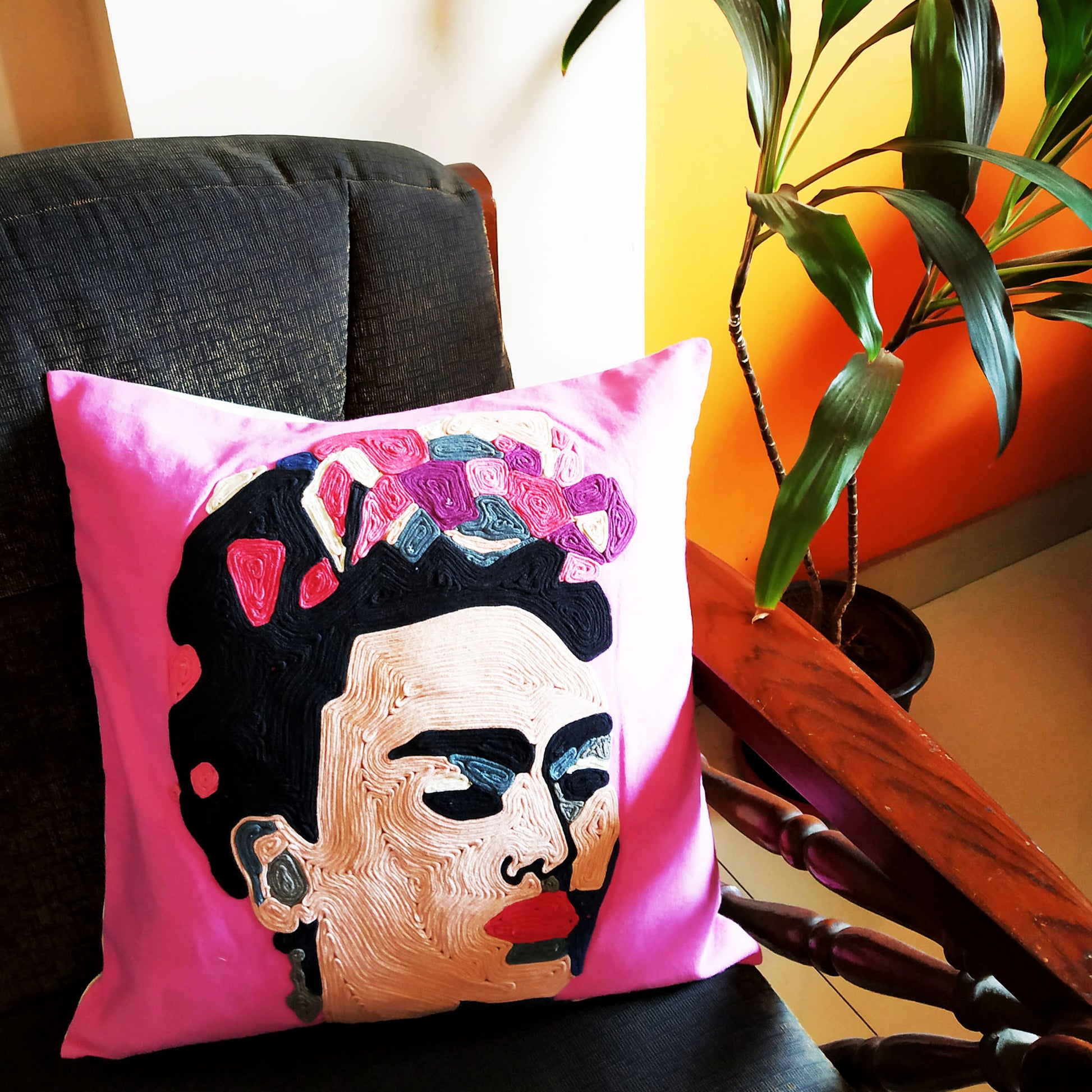 Transform your home into a vibrant, artistic paradise with this Pink-Frida-cushion-cover. Featuring beautiful embroidery of the legendary Frida Kahlo , you'll love the unique design and aesthetic of this cover. Made from pink cotton canvas, it's durable and timeless with a pleasant feel on the skin. The back is finished with muslin cloth and easy zipper opening for convenience. Add a beautiful touch to any room with this cushion and experience Frida Kahlo's art along with maximum comfort.
