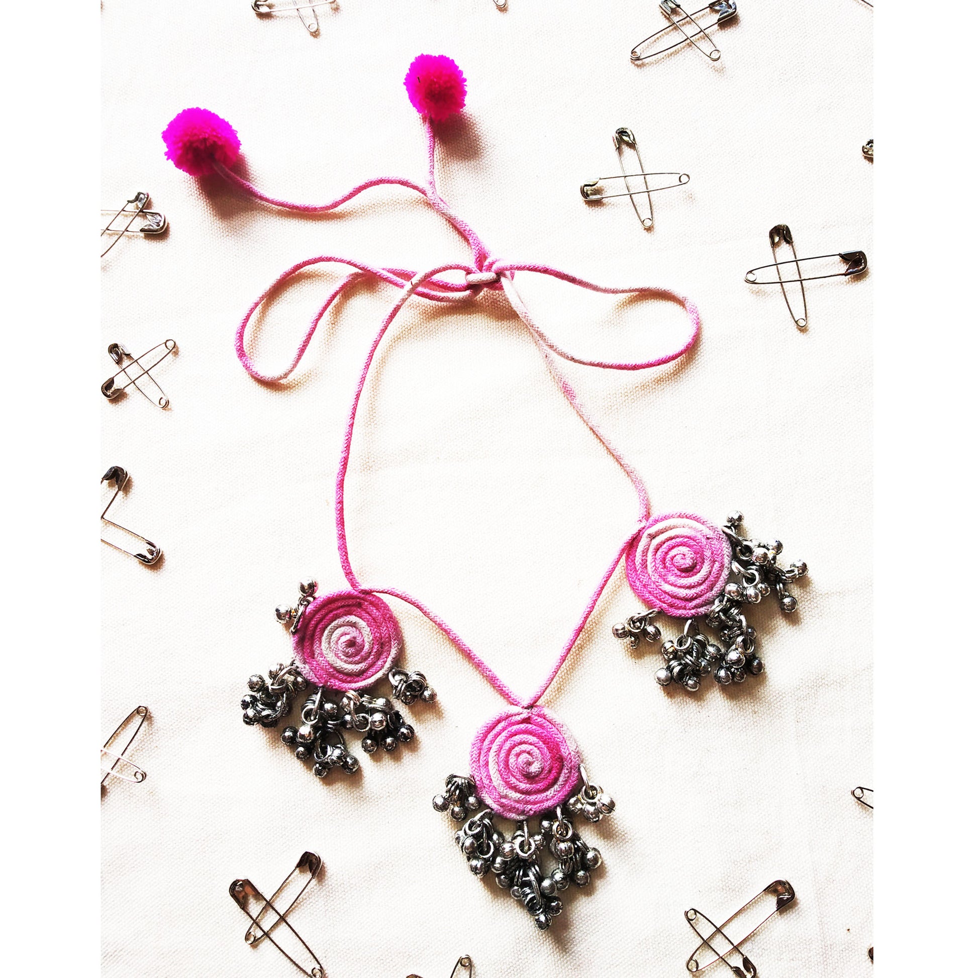 Accessorize with this beautiful pink shaded necklace for all occasions, from a casual day out with friends to more formal events. The delicate tie and dye corded necklace adds a chic and feminine touch to any outfit. Along with the stunning pink shades, the ghungroos add an interesting element of traditional Indian artistry to your ensemble, making you stand out in the crowd! This necklace is sure to add a hint of subtle sophistication to any look.