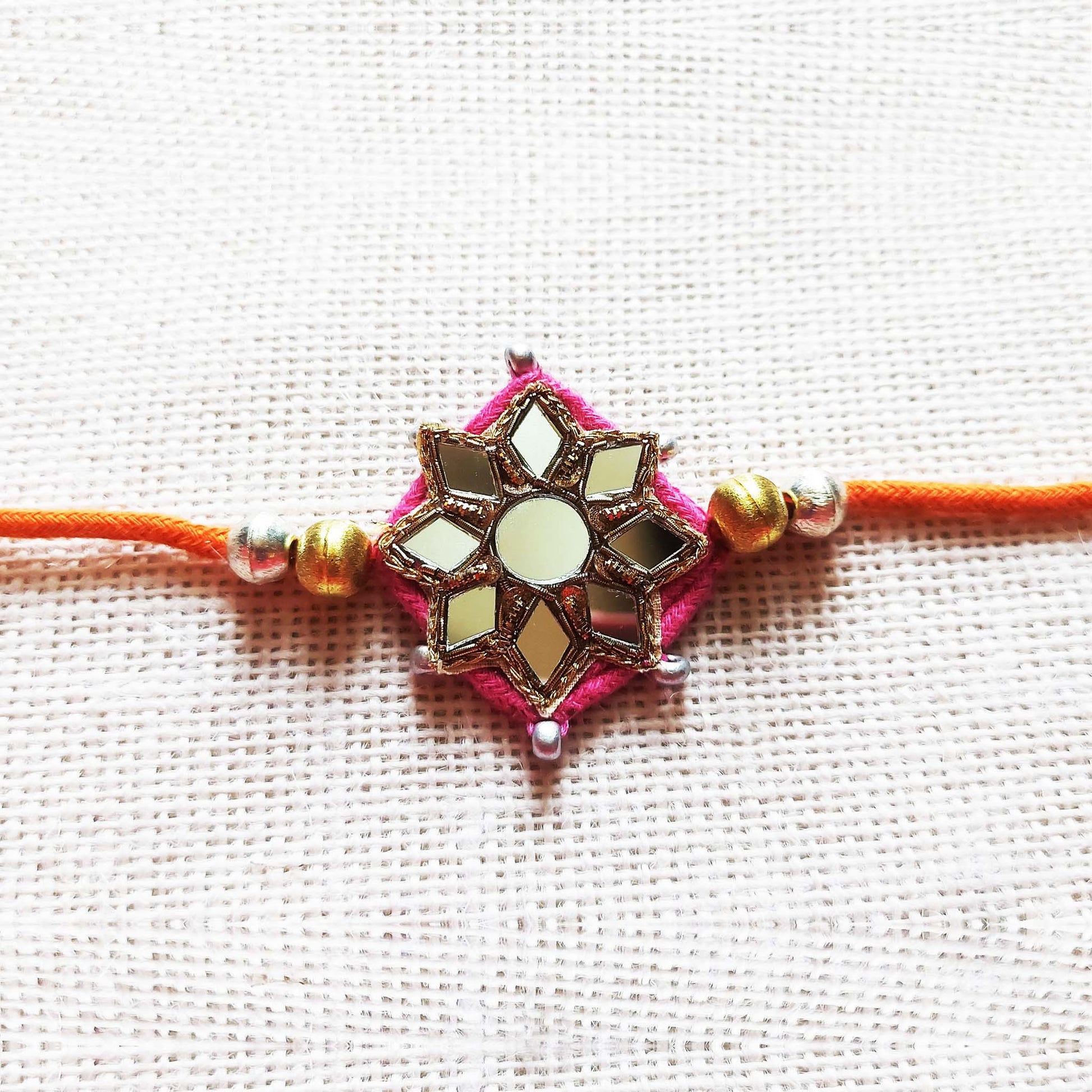 Sitara Rakhi made using age old technique of mirrorwork, adorned with beads and pompoms. A truly Royal Rakhi.