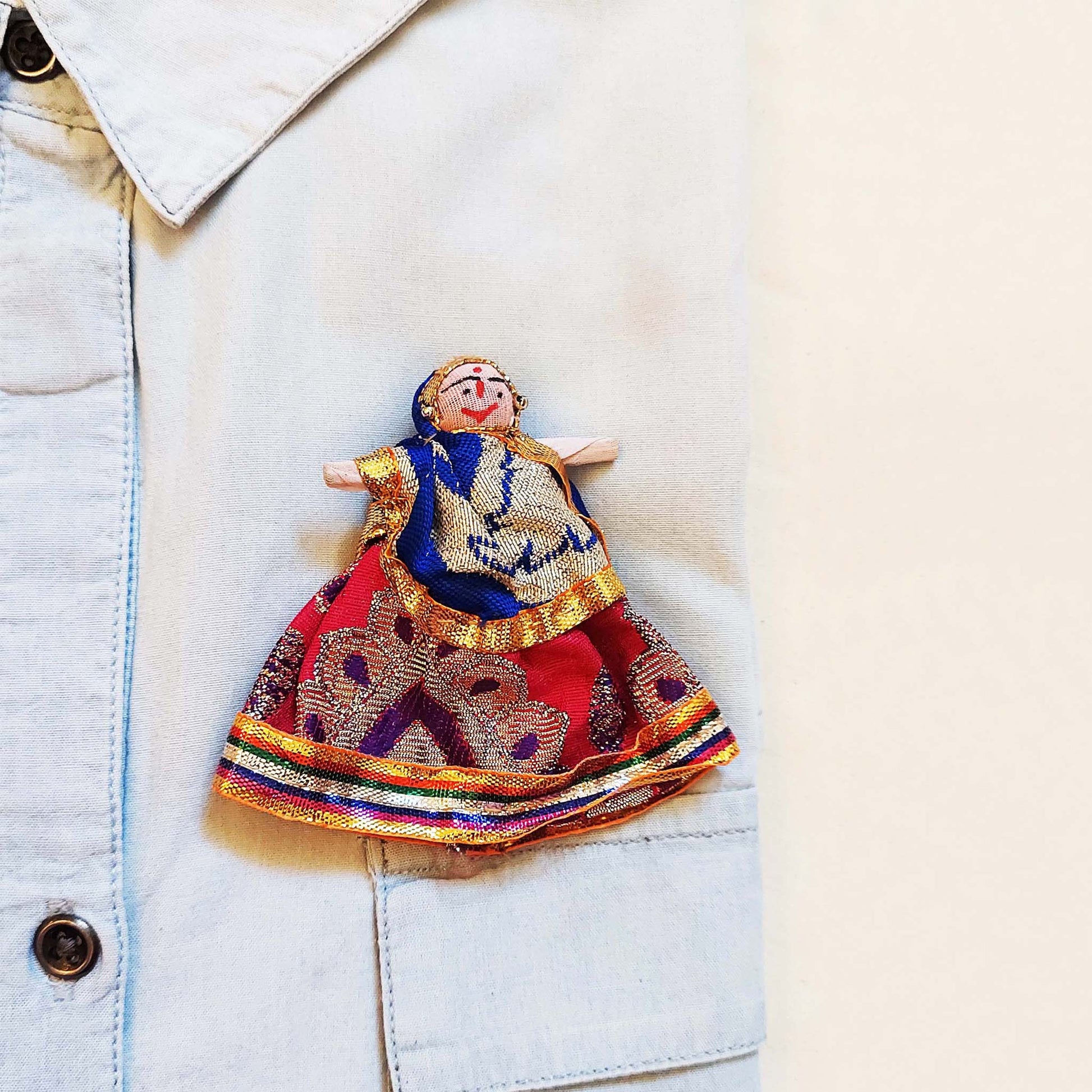 Stand out from the crowd with this one-of-a-kind Quirky female kathputli brooch. This traditional Rajasthani puppet was thoughtfully hand made from fabric scraps and embellished with Gota. Add a touch of bold personality to your outfit with this unique brooch. Wherever you go, let this quirky female kathputli serve as an extension of your own unique style and vibrant personality. Since these are handmade from scraps, colors and patterns may vary.