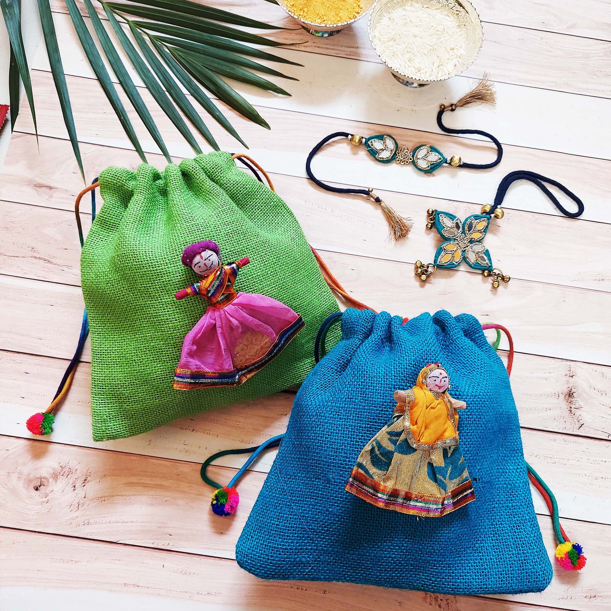 A pair of Jute Potlis with Rajasthani Kathputlis and a mirrorwork Rakhi Lumba set