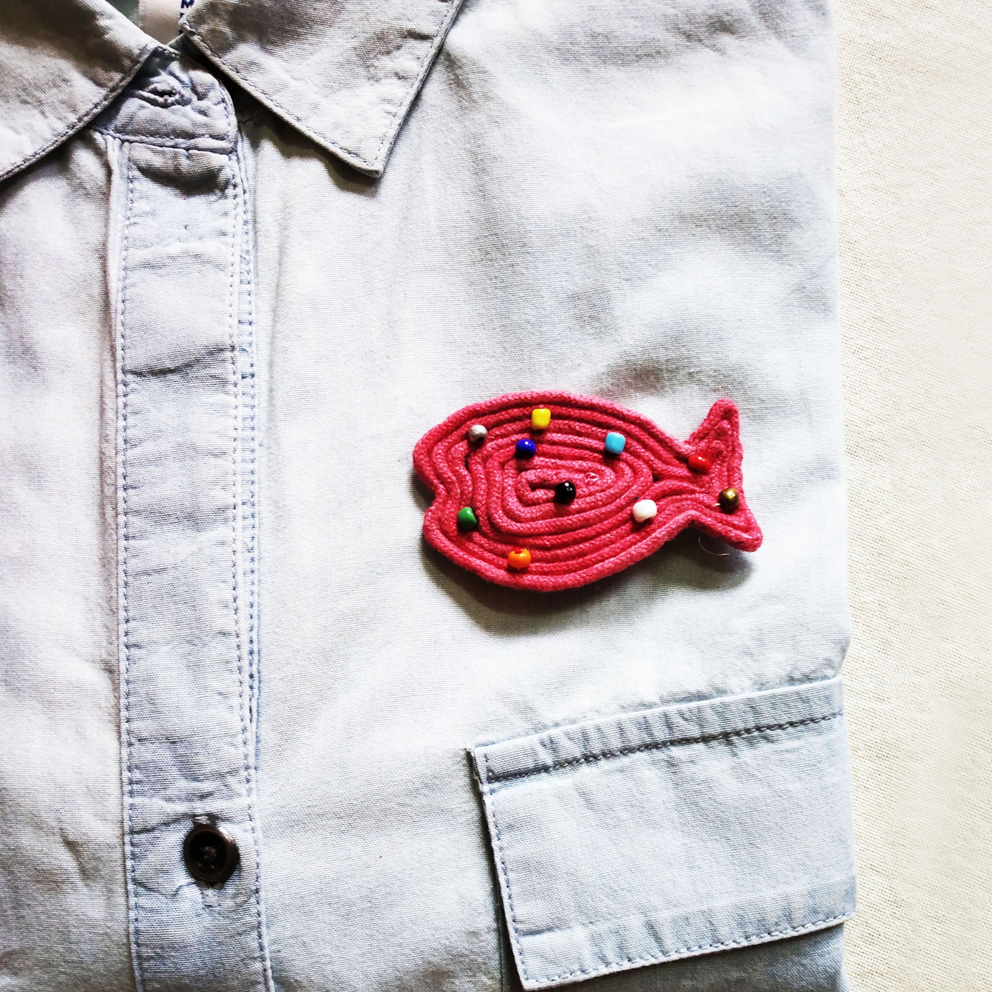 Add a touch of glamor to any outfit with this intricate red beaded fish brooch. This beautiful brooch is handmade with dazzling red cording and intricately embroidered with beads. Whether you're dressing up for a party or just accenting your everyday style, this fish brooch is sure to make a statement.