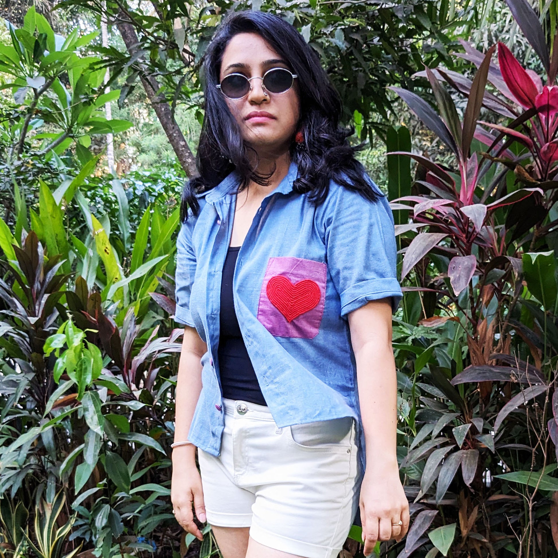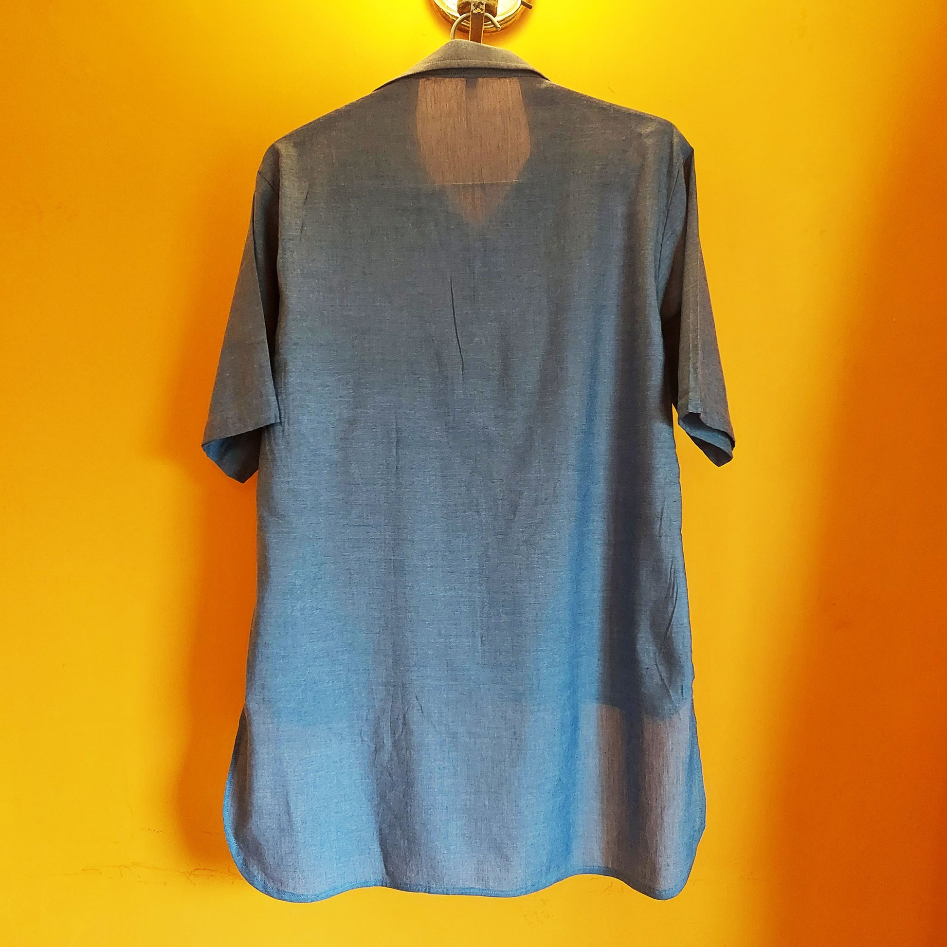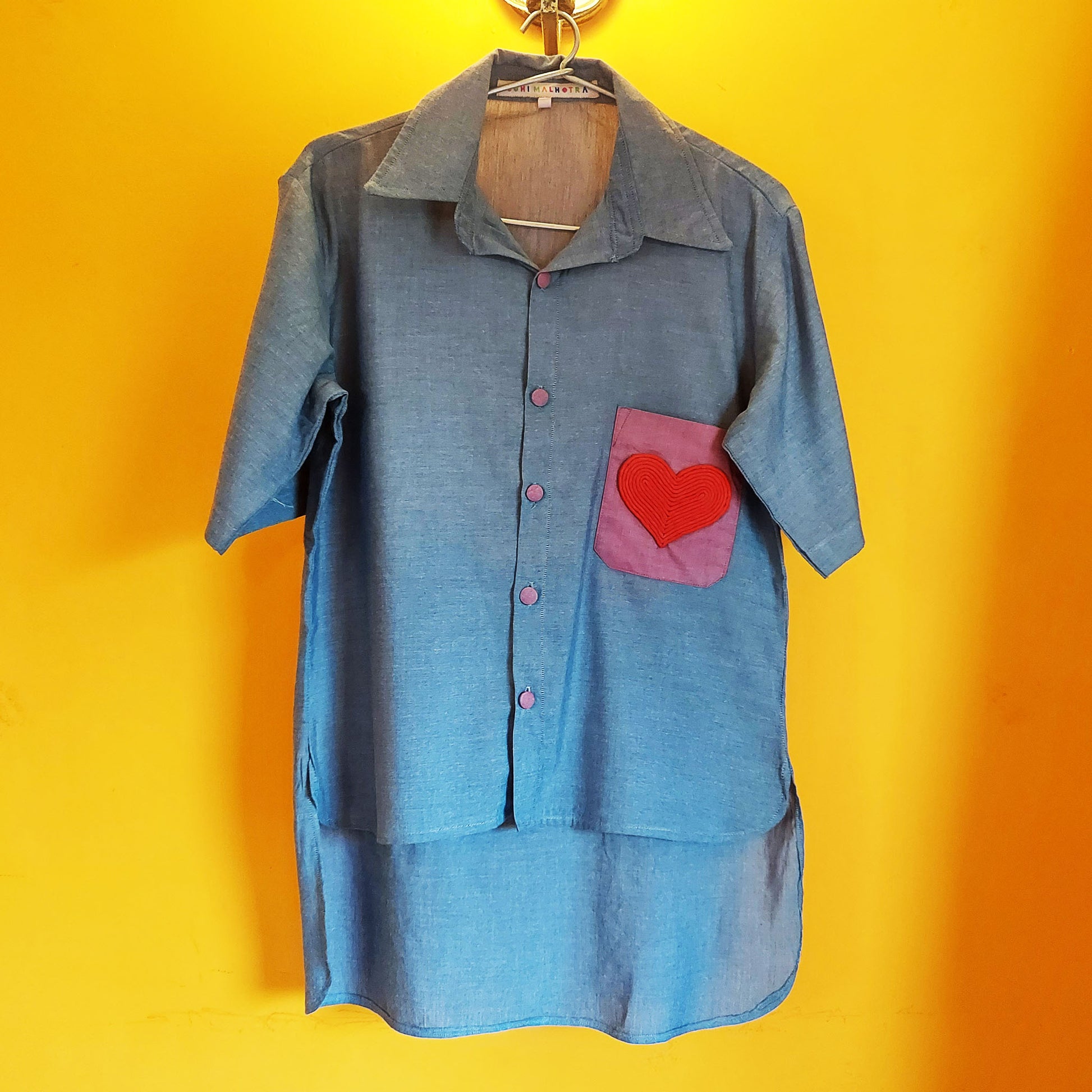 This Cotton chambray shirt is perfect for the summer. The USP is the pocket detail. This shirt is made in Blue chambray cotton with a purple pocket and a handmade heart patchwork. The back length of the shirt is longer than the front.