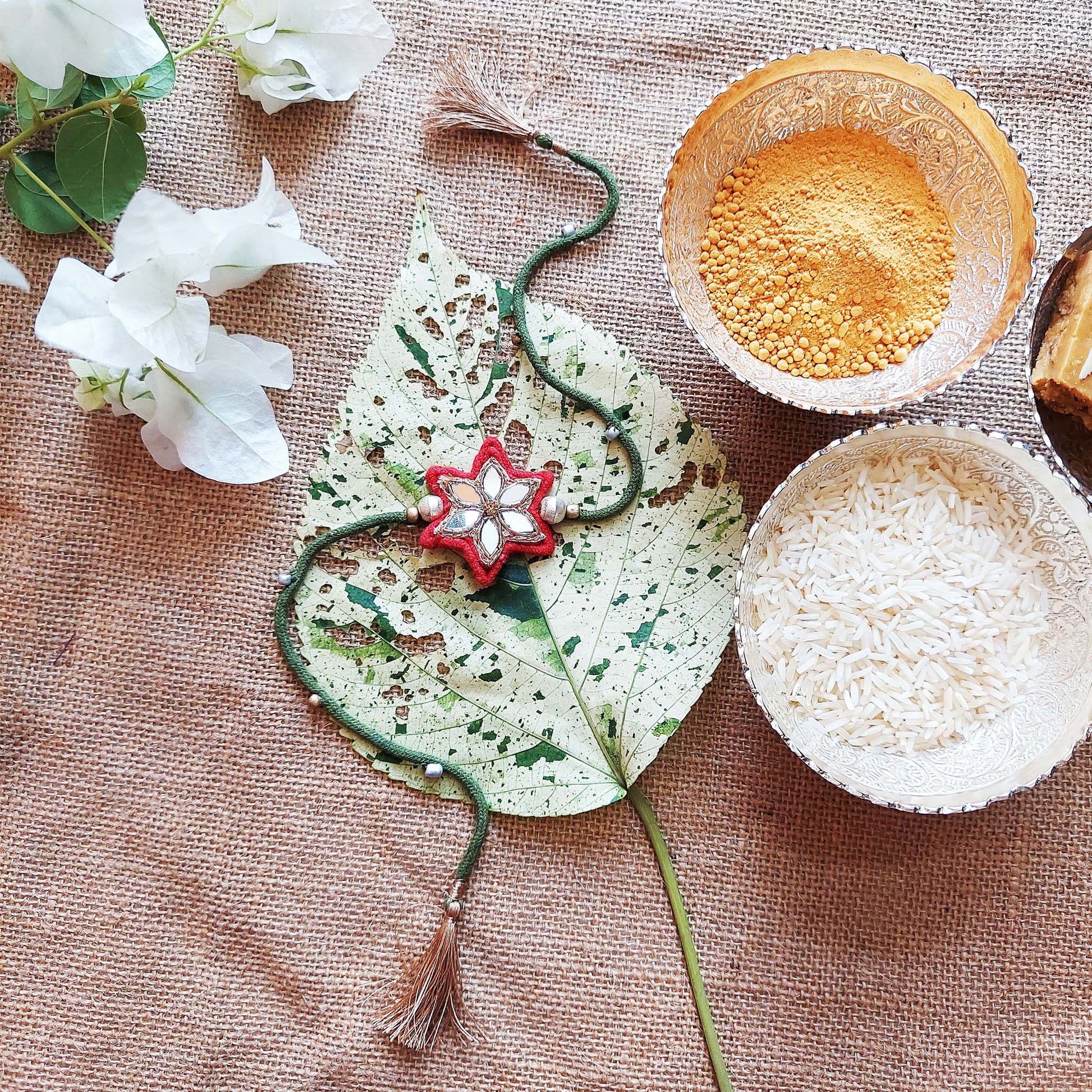A mirrorwork Rakhi in the shape of a star, hand sewn on cotton Dori and finished with beads and silken tassels. A truly Royal piece.