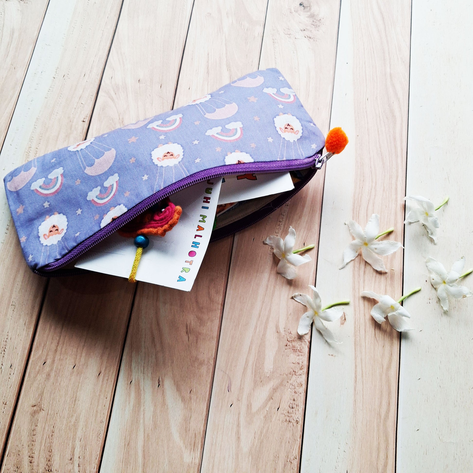 This hamper contains a Printed Zipper Pouch. It has a handmade Seahorse Rakhi made with our signature doriwork. It also has a Paper Boat Dry Fruit and Nutty Trail mix alongwith a Happy Rakhi Card.