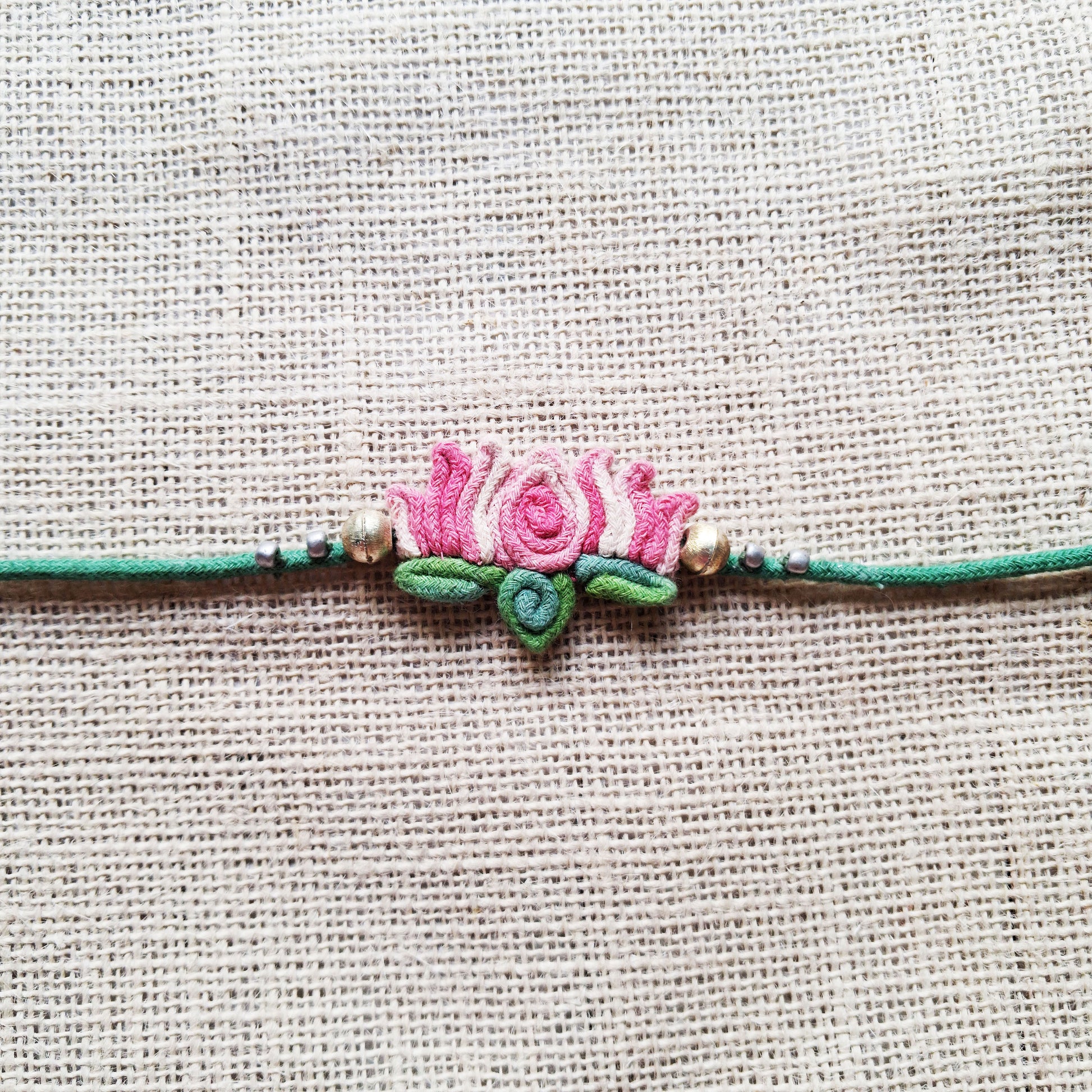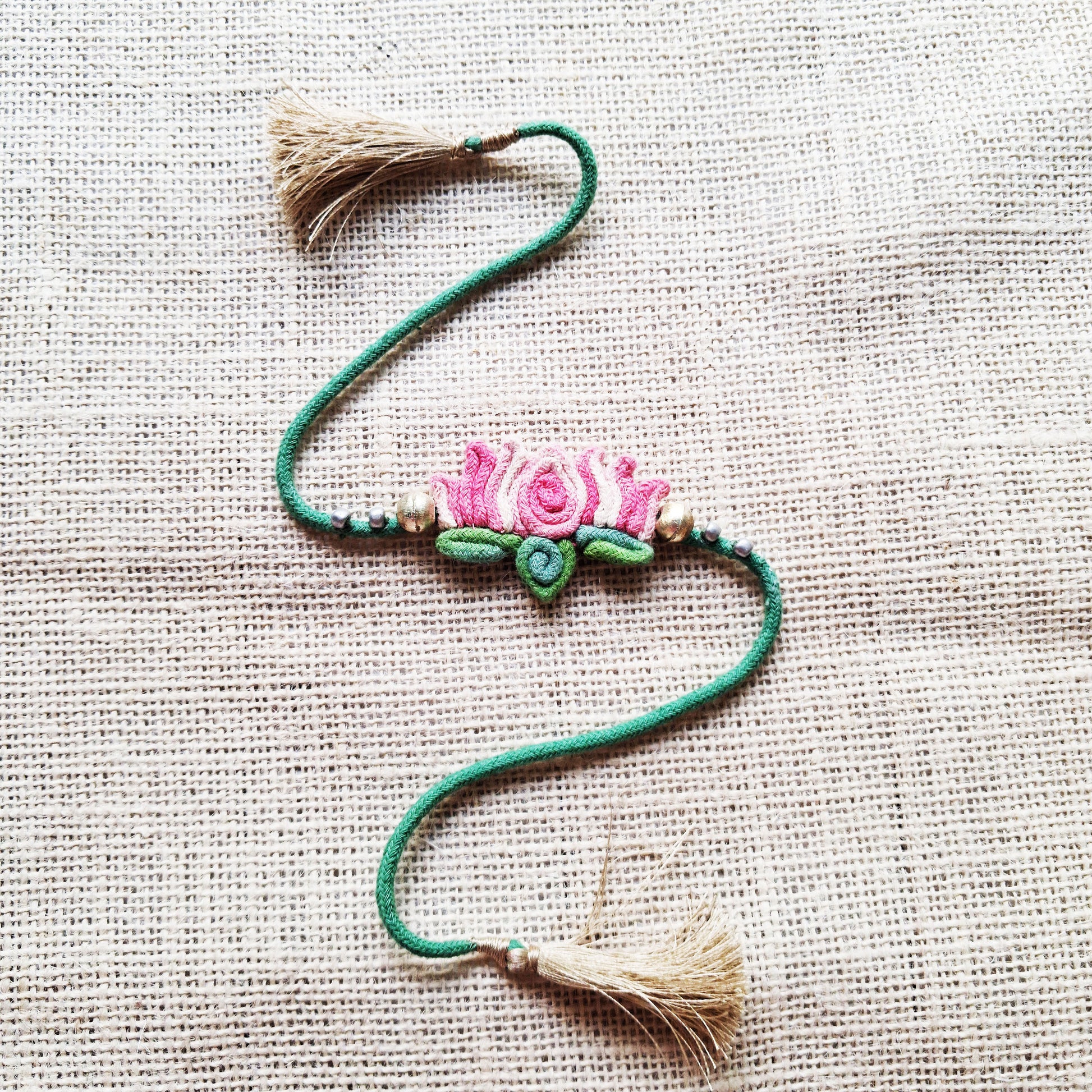 This is a Handmade Rakhi created with our signature Doriwork with a pristine Lotus design adorned with metallic silver beads. The Rakhi is finished wth Silk tassels.