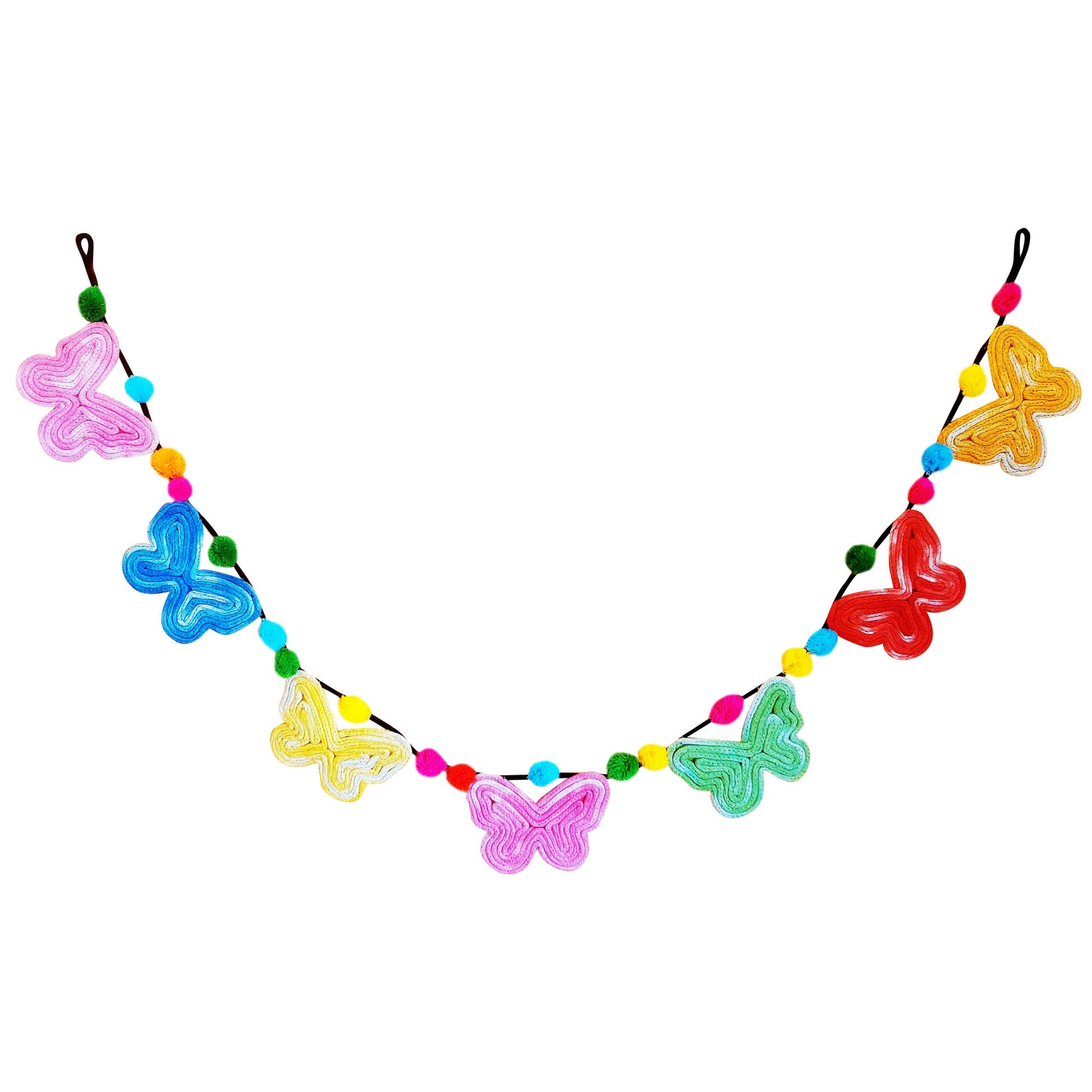 Decorate your living space with this delightful shaded-butterfly bunting. Adorn your wall with vibrant colors and beautiful designs. Every butterfly is intricately handcrafted with tie dyed doriwork and backed with felt, all carefully hand stitched with cotton yarn. To top it off, each butterfly is uniquely embellished with pompoms for an extra touch of beauty. Hang it up and instantly bring a bright, cheerful vibe to any room