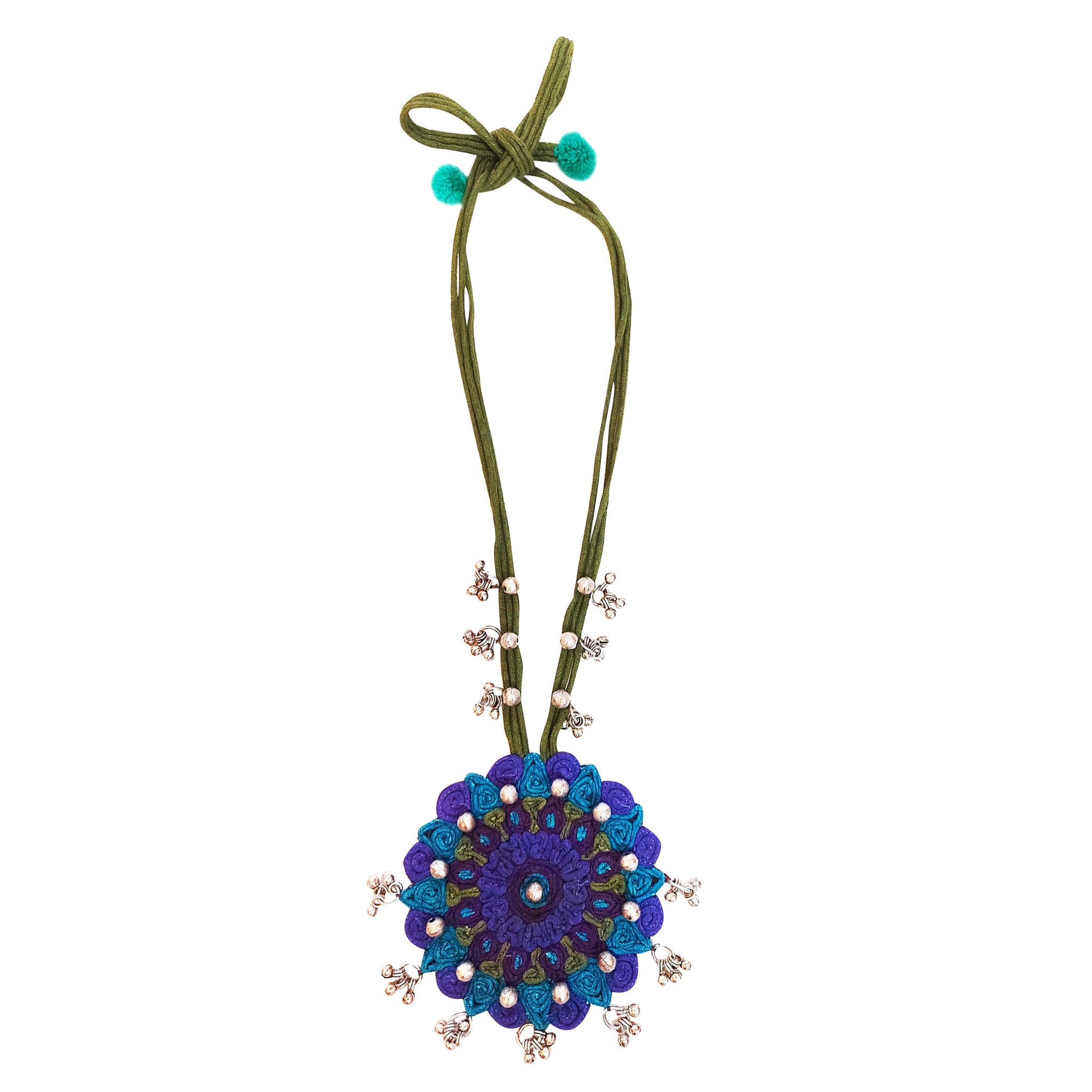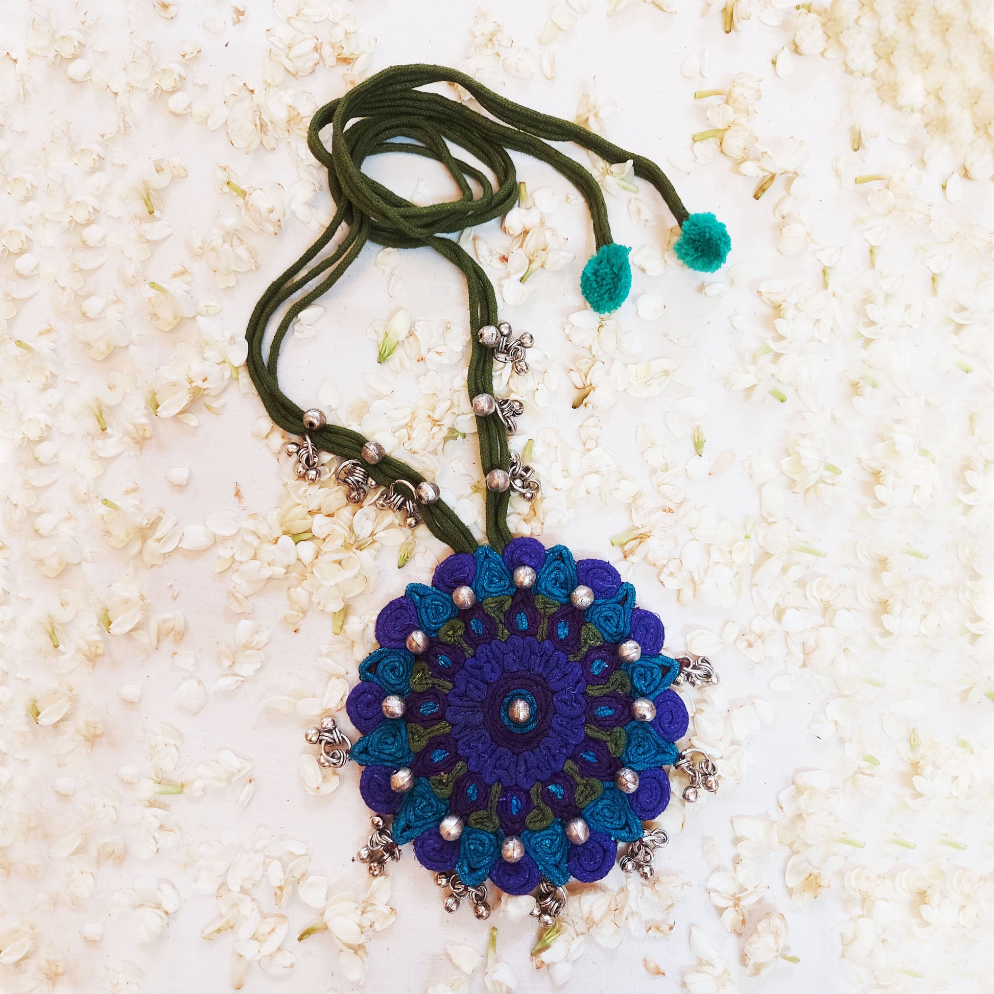 This statement necklace offers layers of spiritual symbolism and vintage Indian flair. The Mandala pattern crafted from cotton dori string forms the foundation for an eclectic mix of design elements like antique ghungroos and a finishing pompom tassel. Adjust the tie-up strings to find the perfect length, whether you want a short, eye-catching choker style or a longer layered look. Embrace the uniqueness of mandala art in a wearable timeless masterpiece.