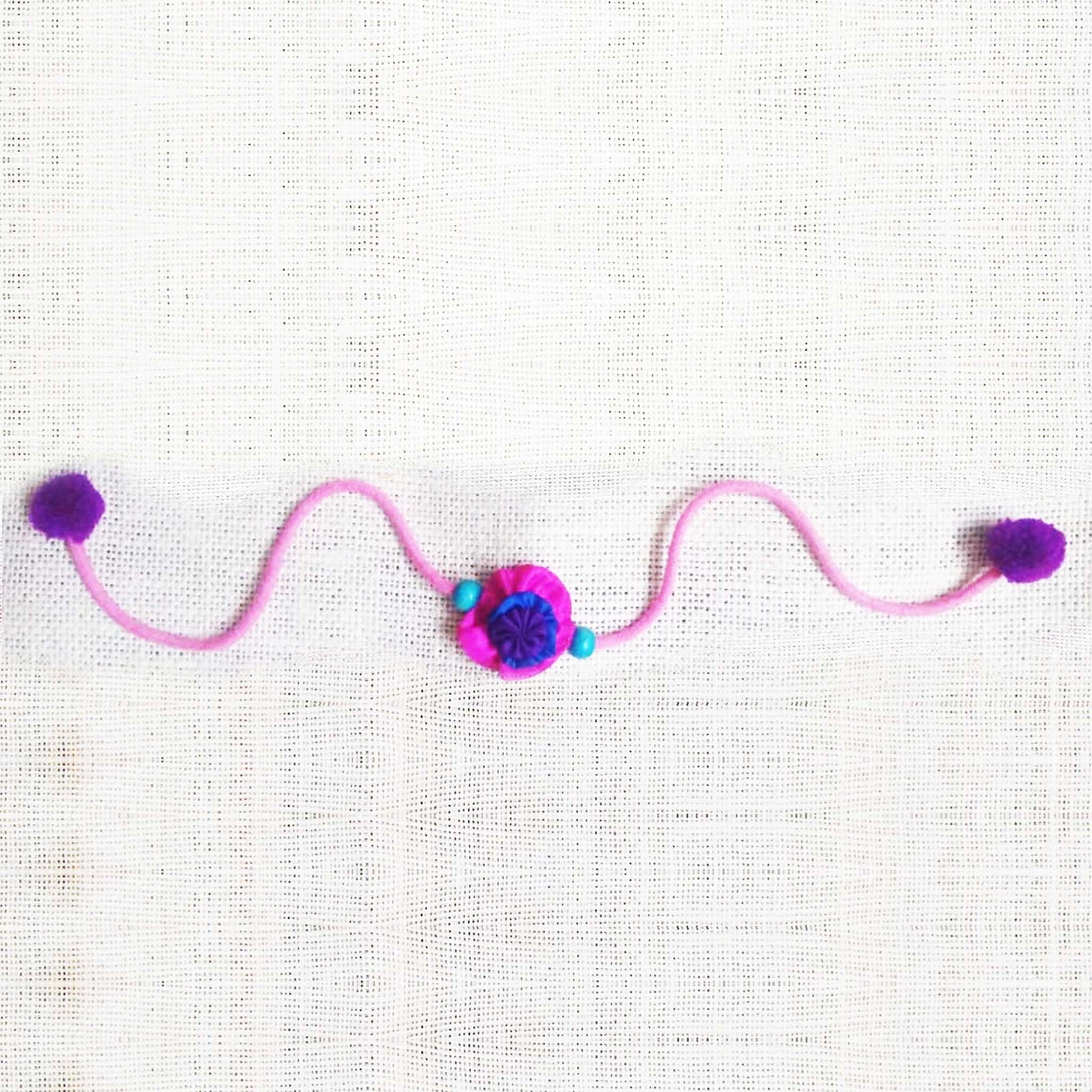 A handmade Layered Flower Rakhi with beads hand sewn on a cotton dori.
