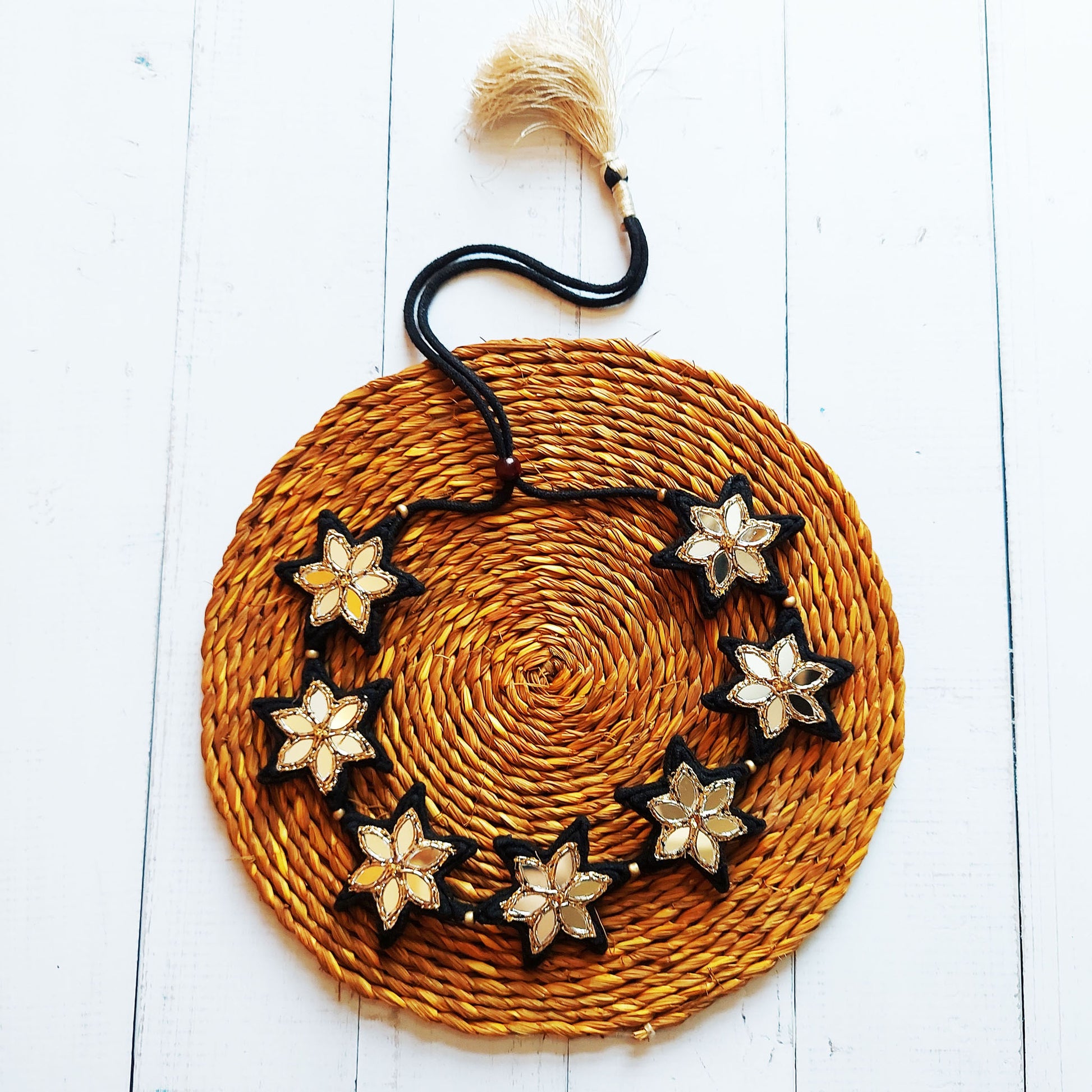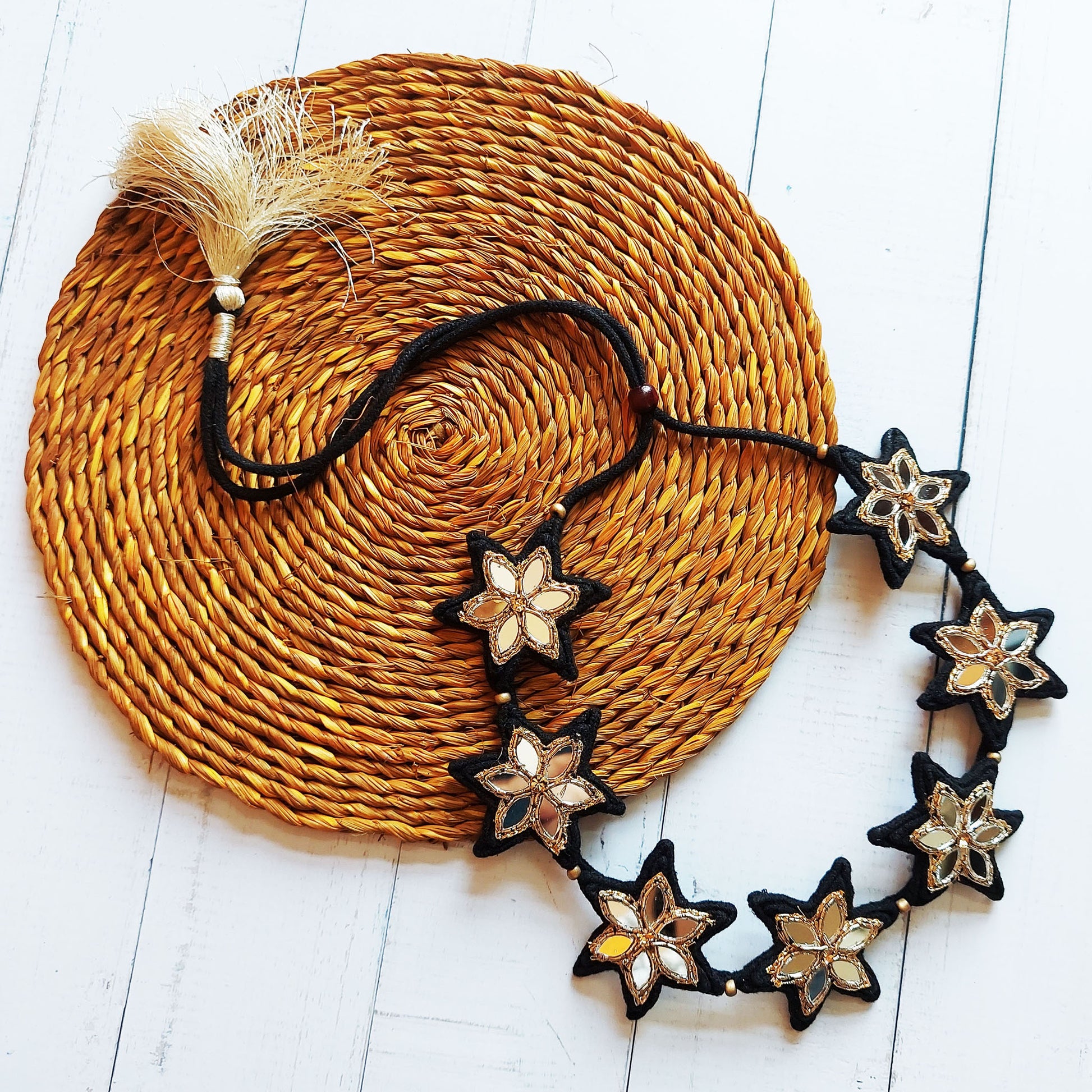 A unique starry choker in black with mirrorwork. It has an ethnic yet modern touch and will compliment your entire festive wardrobe. Perfect for the upcoming festive season. Necklace is finished with silk tassels and the length can be adjusted with a wooden bead.