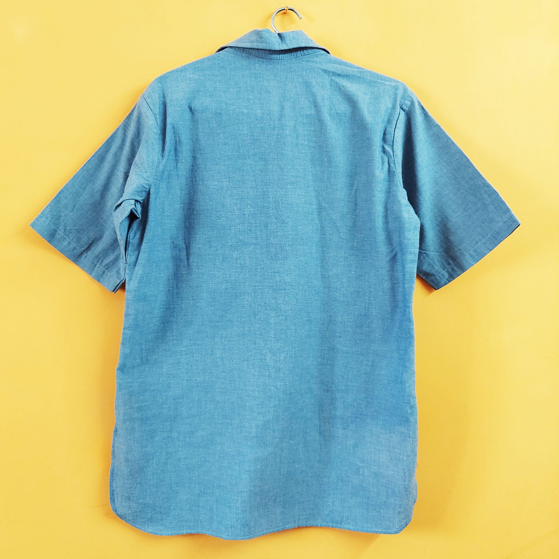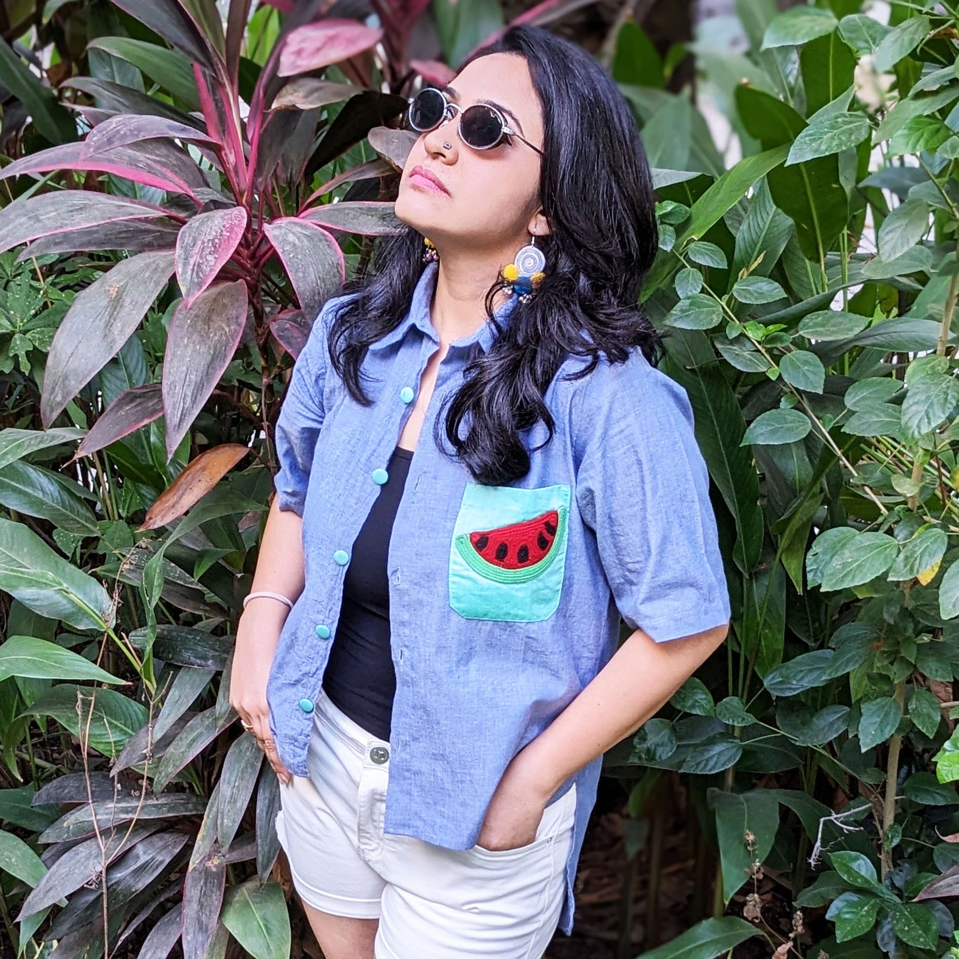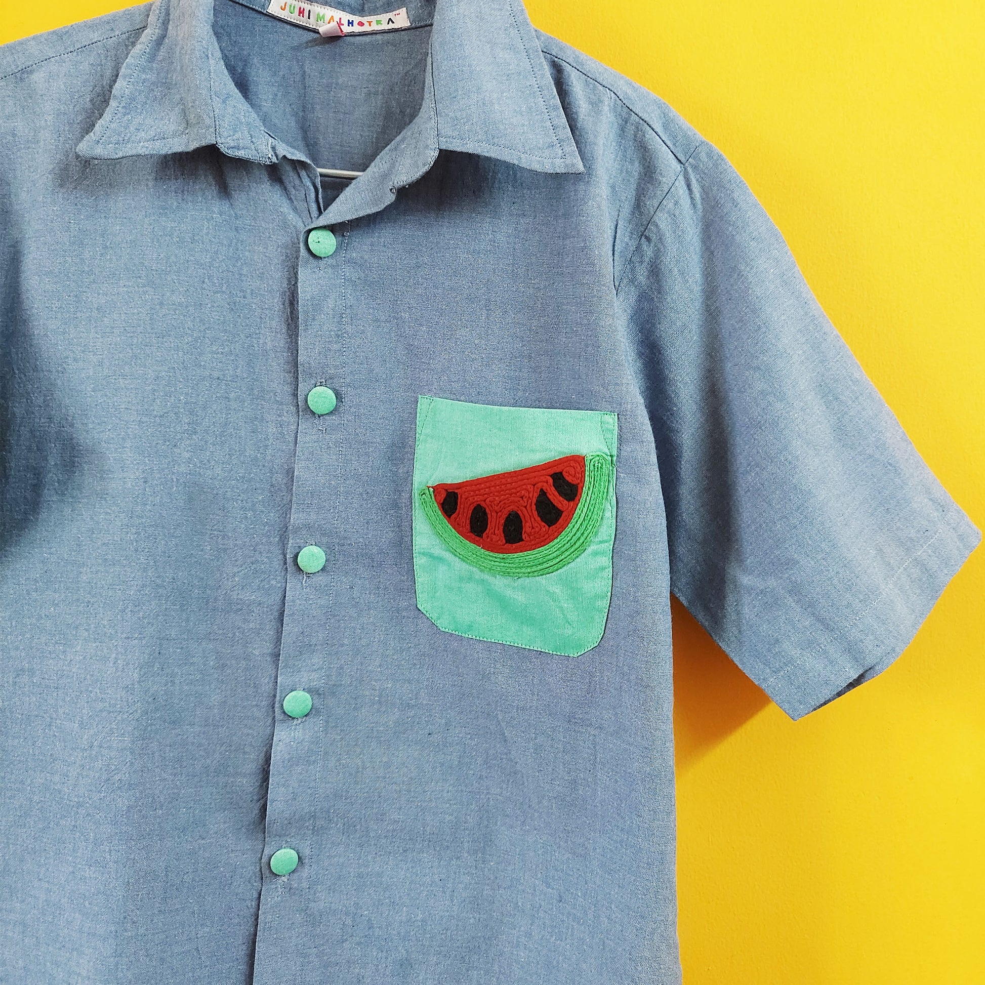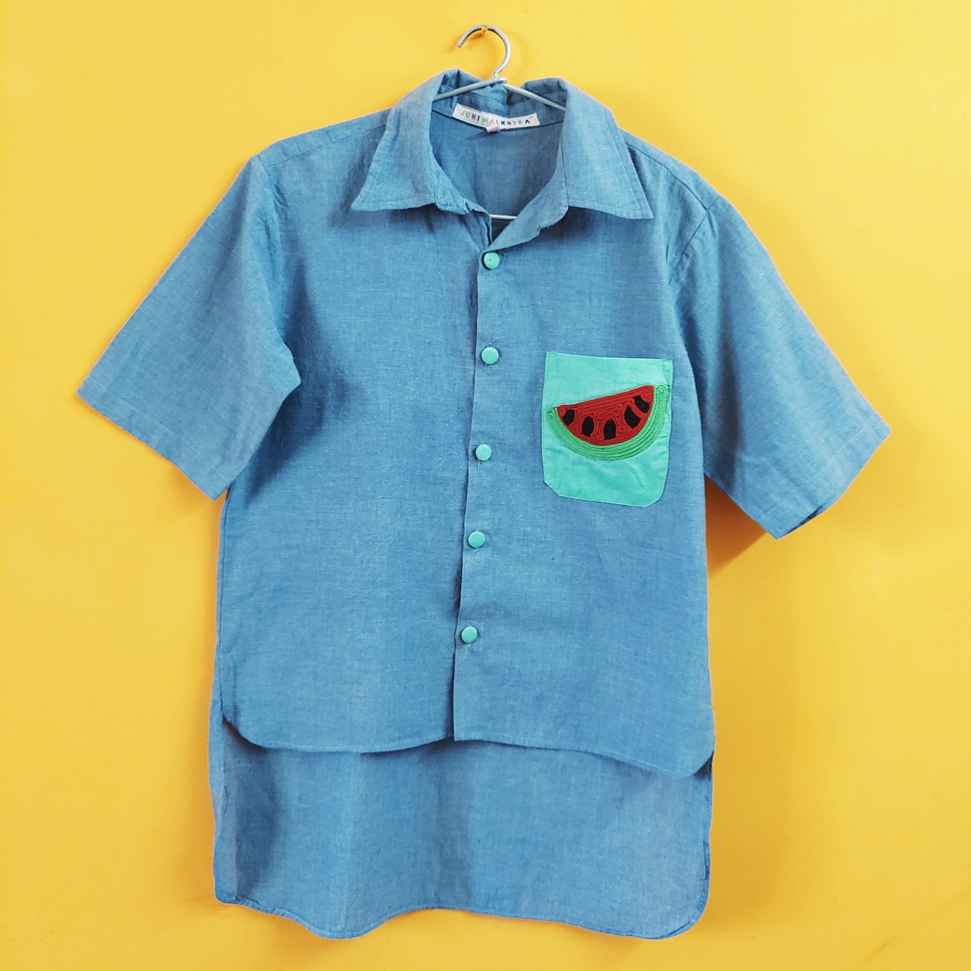 This Cotton chambray shirt is perfect for the summer. The USP is the pocket detail. This shirt is made in Blue chambray cotton with a green pocket and a handmade watermelon patchwork. The back length of the shirt is longer than the front.