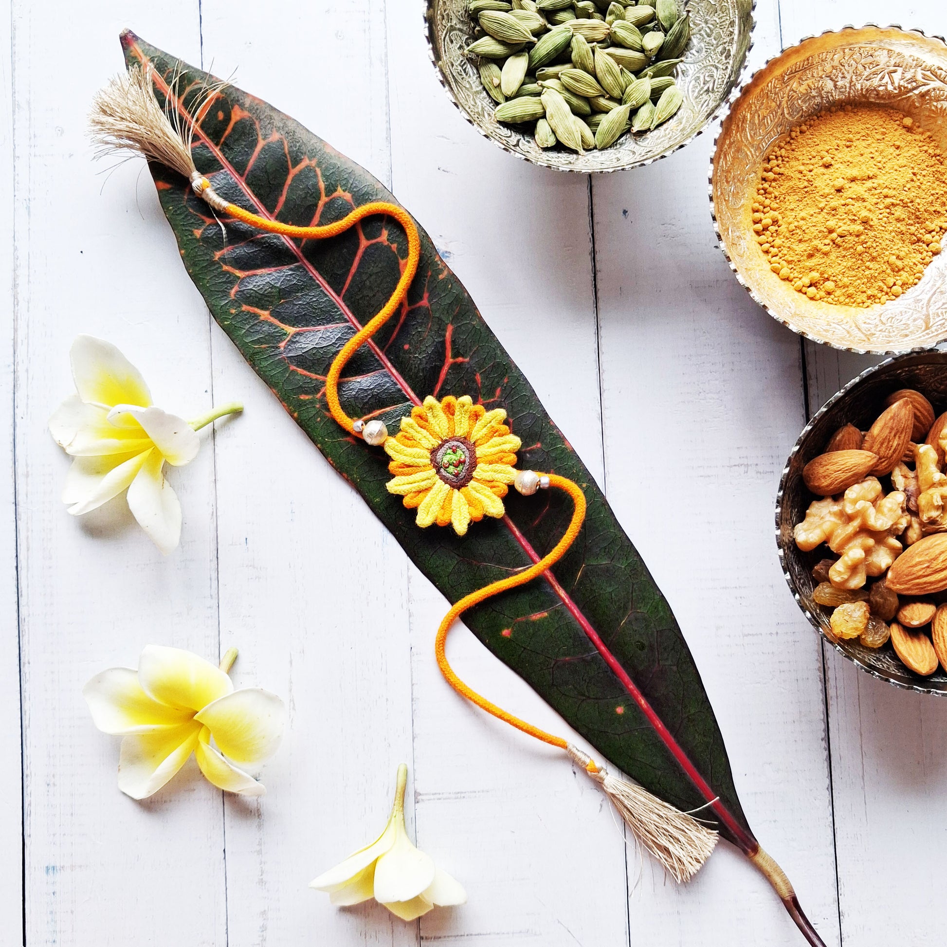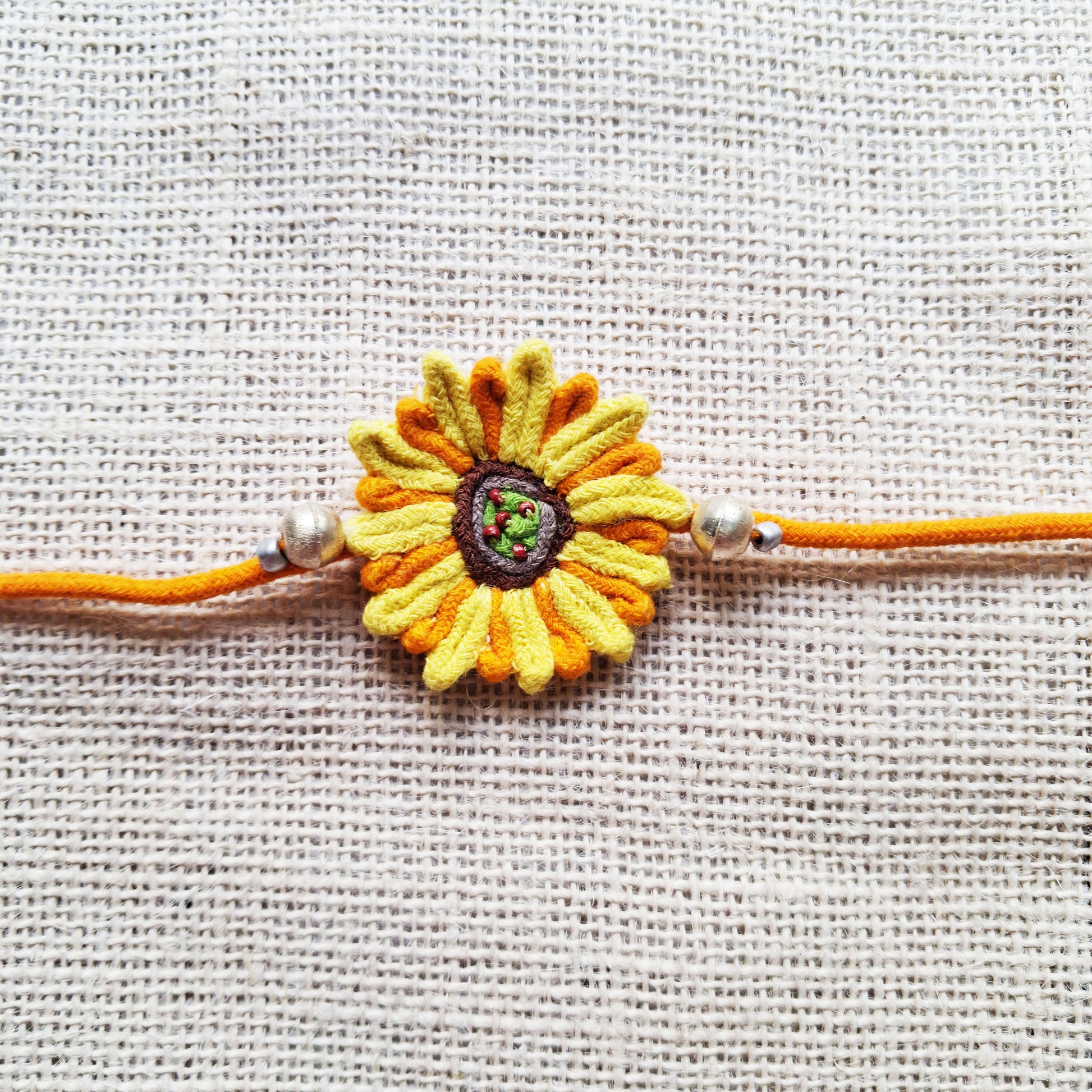 This is a Handmade Rakhi created with our signature Doriwork with a vibrant sunflower design adorned with metallic silver beads. The Rakhi is finished wth Silk tassels.