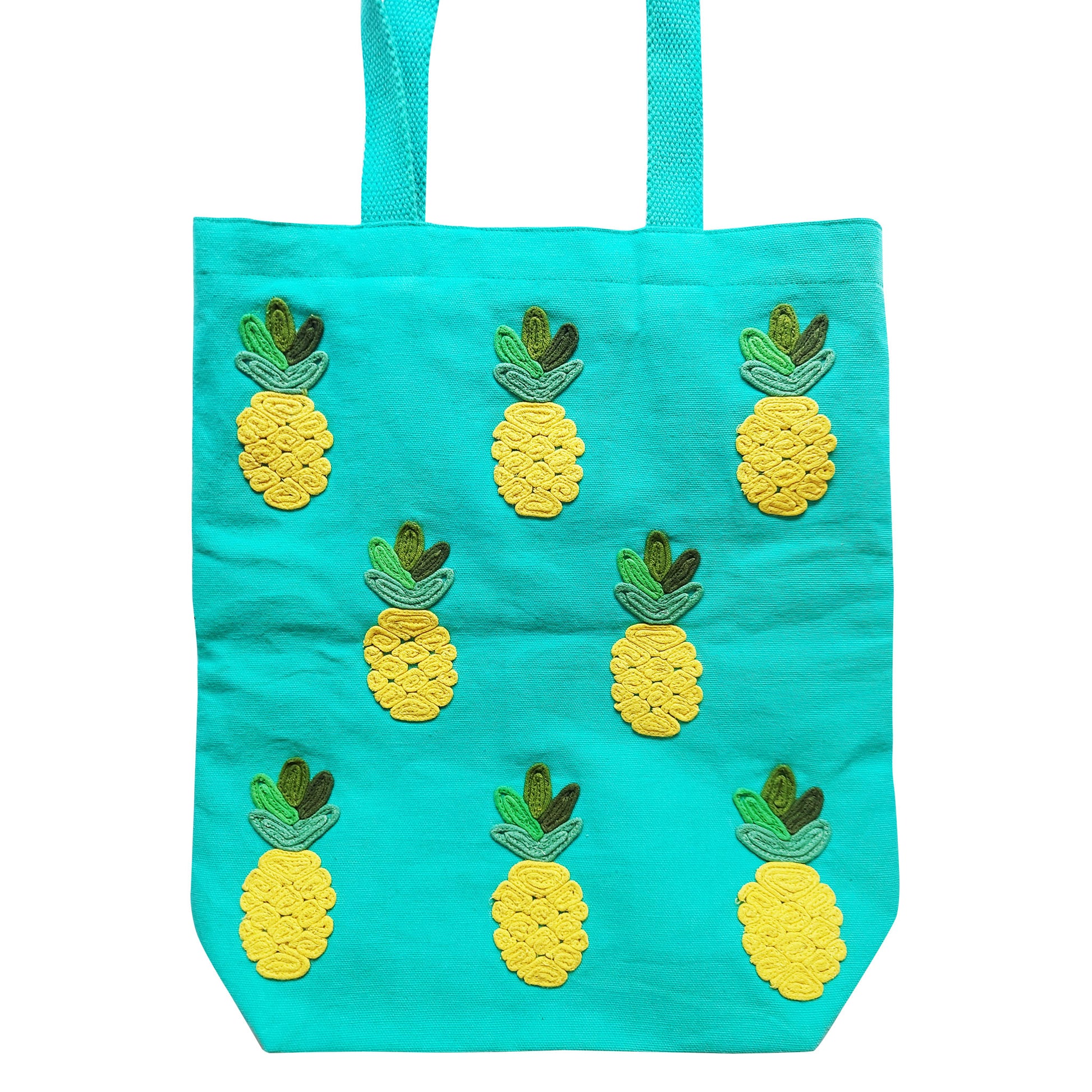 This Tote bag is handcrafted with the brand's signature Doriwork. The Artwork is a fun representation of the juicy fruit Pineapple and has a fun beachy vibe to it. With a vibrant color palette, this bag makes the perfect companion for all travel adventures and casual outings.