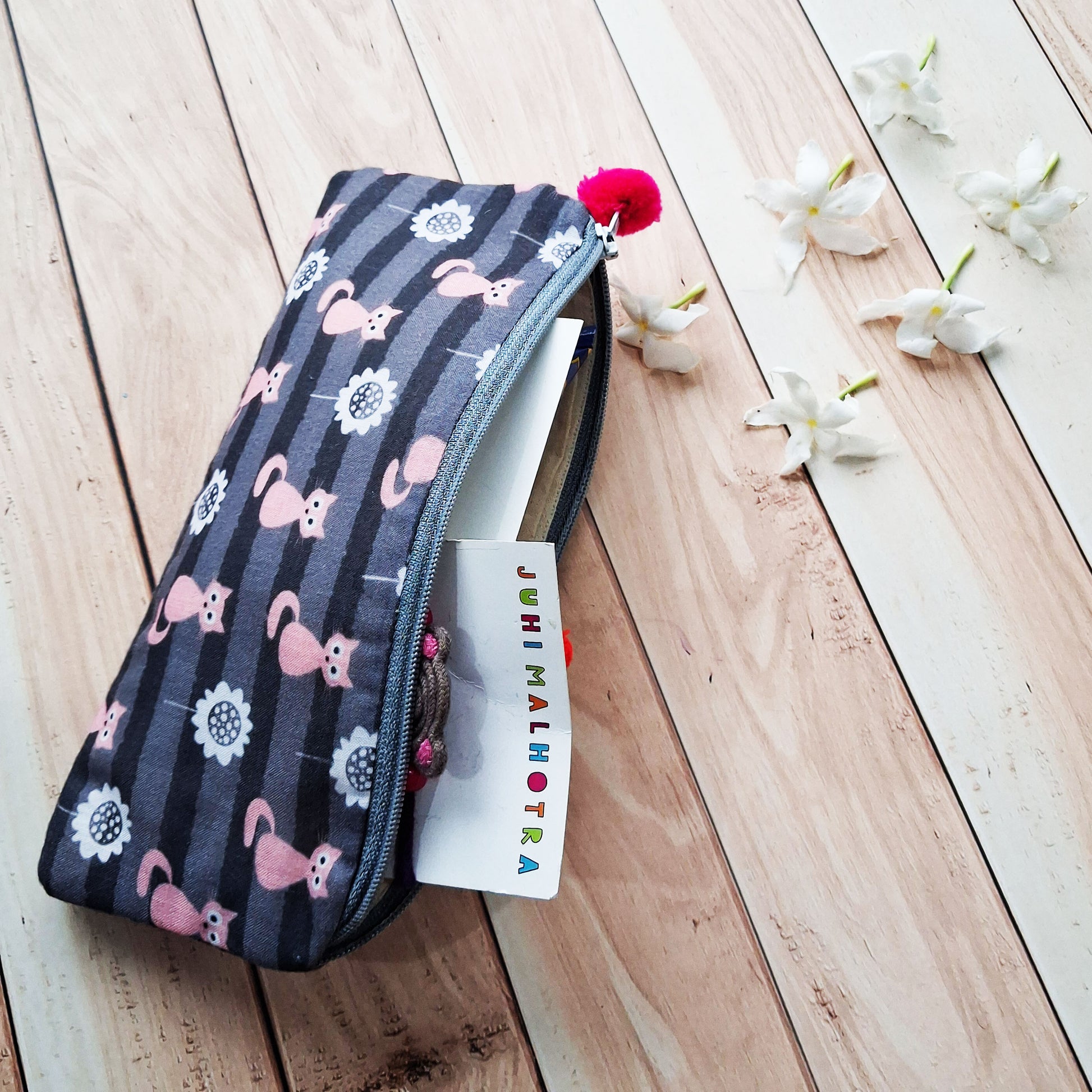 This hamper contains a Kitty Printed Zipper Pouch. It has a handmade Teddy Bear Rakhi made with our signature doriwork. It also has a Paper Boat Dry Fruit and Nutty Trail mix alongwith a Happy Rakhi Card.