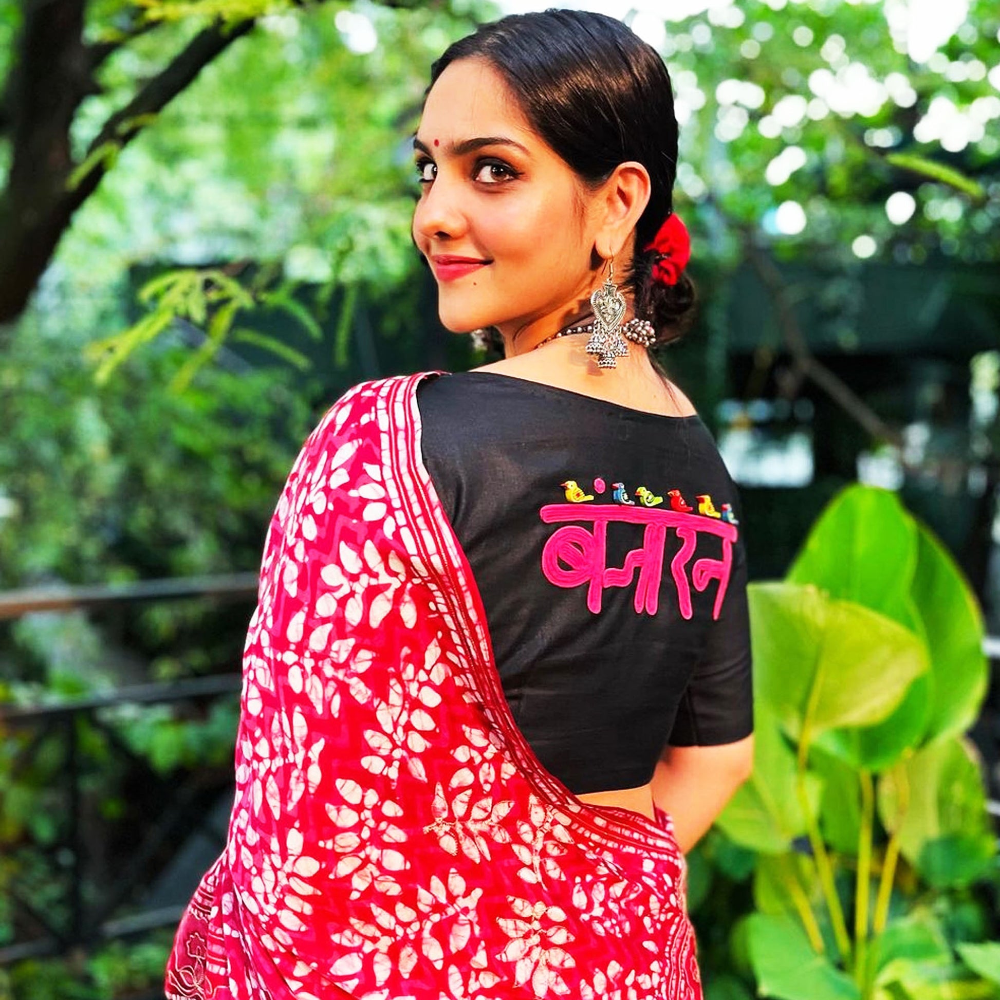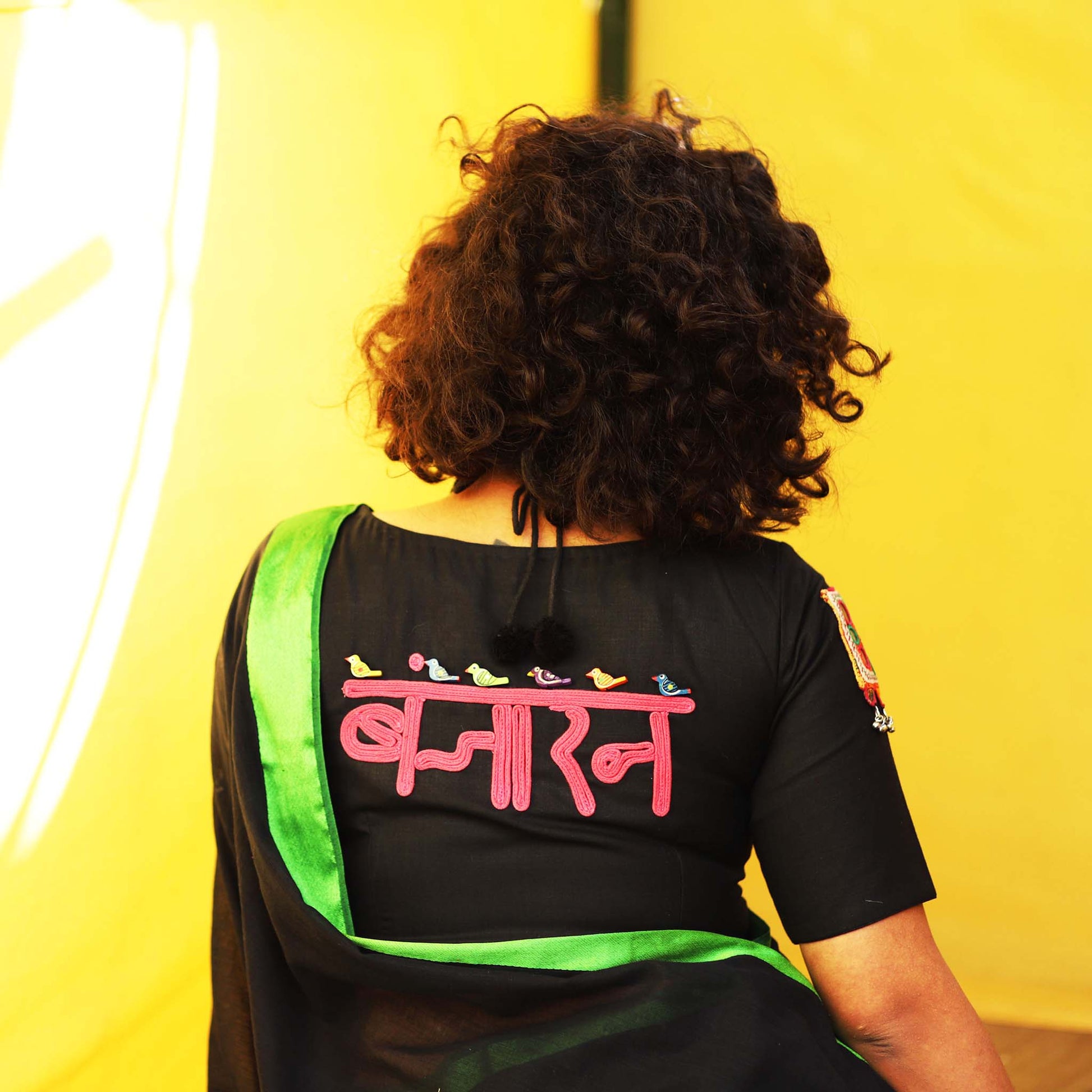 Introducing the Banjaran blouse- a perfect addition to your wardrobe. Featuring a bold Hindi embroidery in Doriwork and wooden birds, this blouse captures your spirit in a timeless way. Stunning details like the mirror work in the front and kutch patches on the sleeves will have you radiating confidence and style. With a side zipper for easy access and an effortlessly chic look, you can create any outfit you desire with The Banjaran blouse.