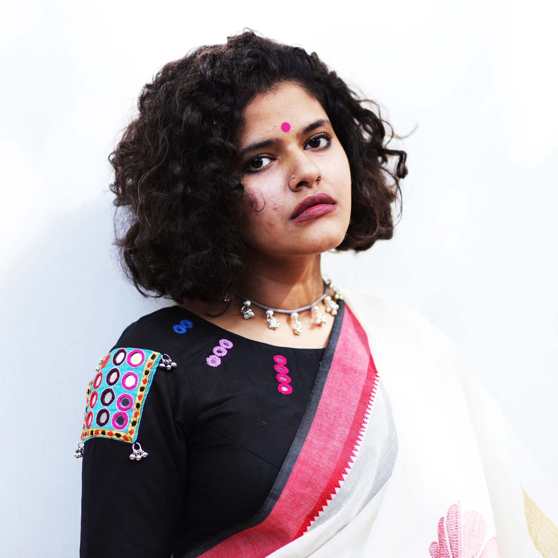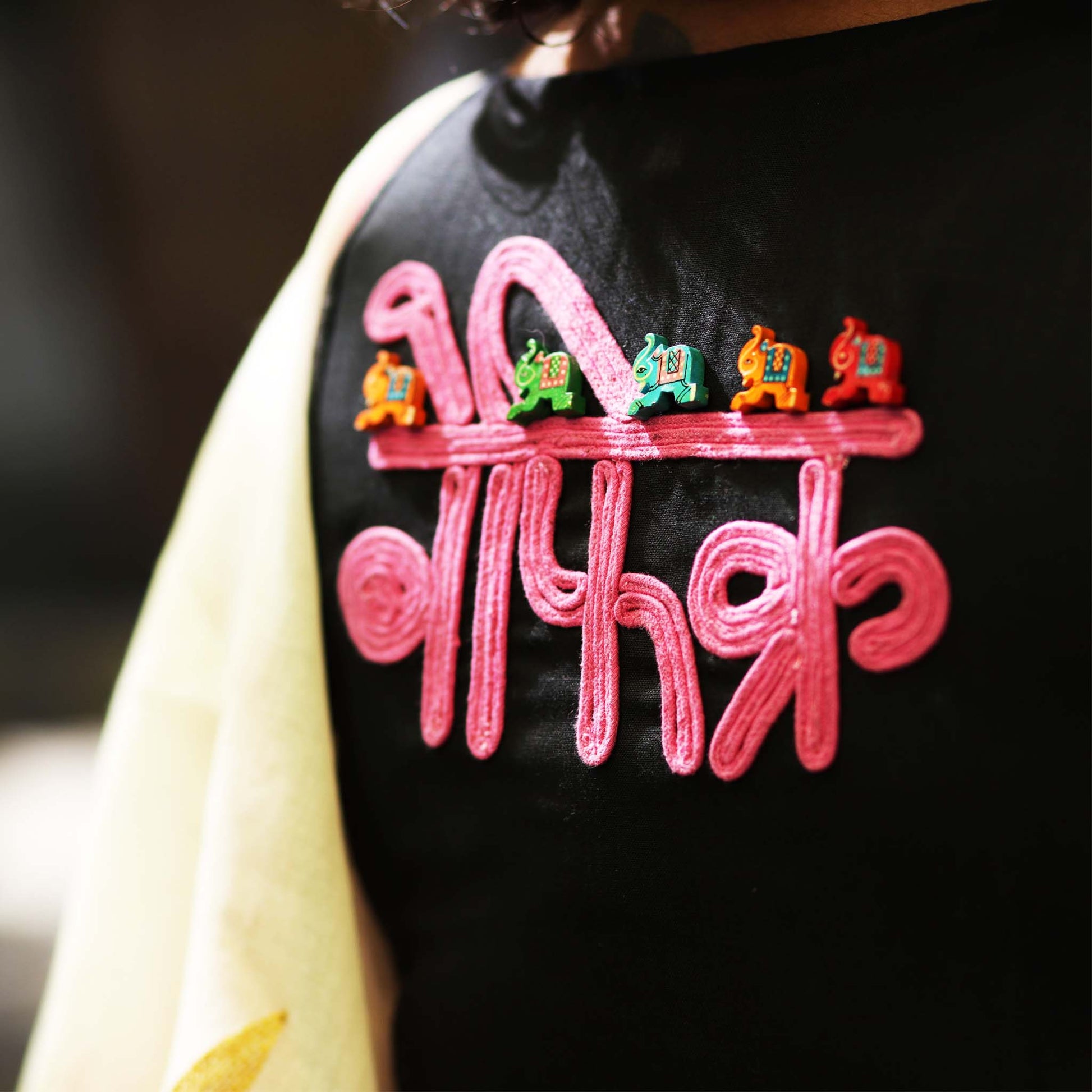 This Befikre blouse is sure to make you stand out! The striking design of "Befikre" embroidered in Hindi in doriwork and embellished with wooden elephants and mirrorwork on the front and kutch patches on the sleeves is truly stunning. No matter what your style, this blouse will add a fresh, fun look to your outfit. Plus, the side zipper makes it easy to put on and take off. Show off your daring fashion sense with this beautiful Befikre blouse.