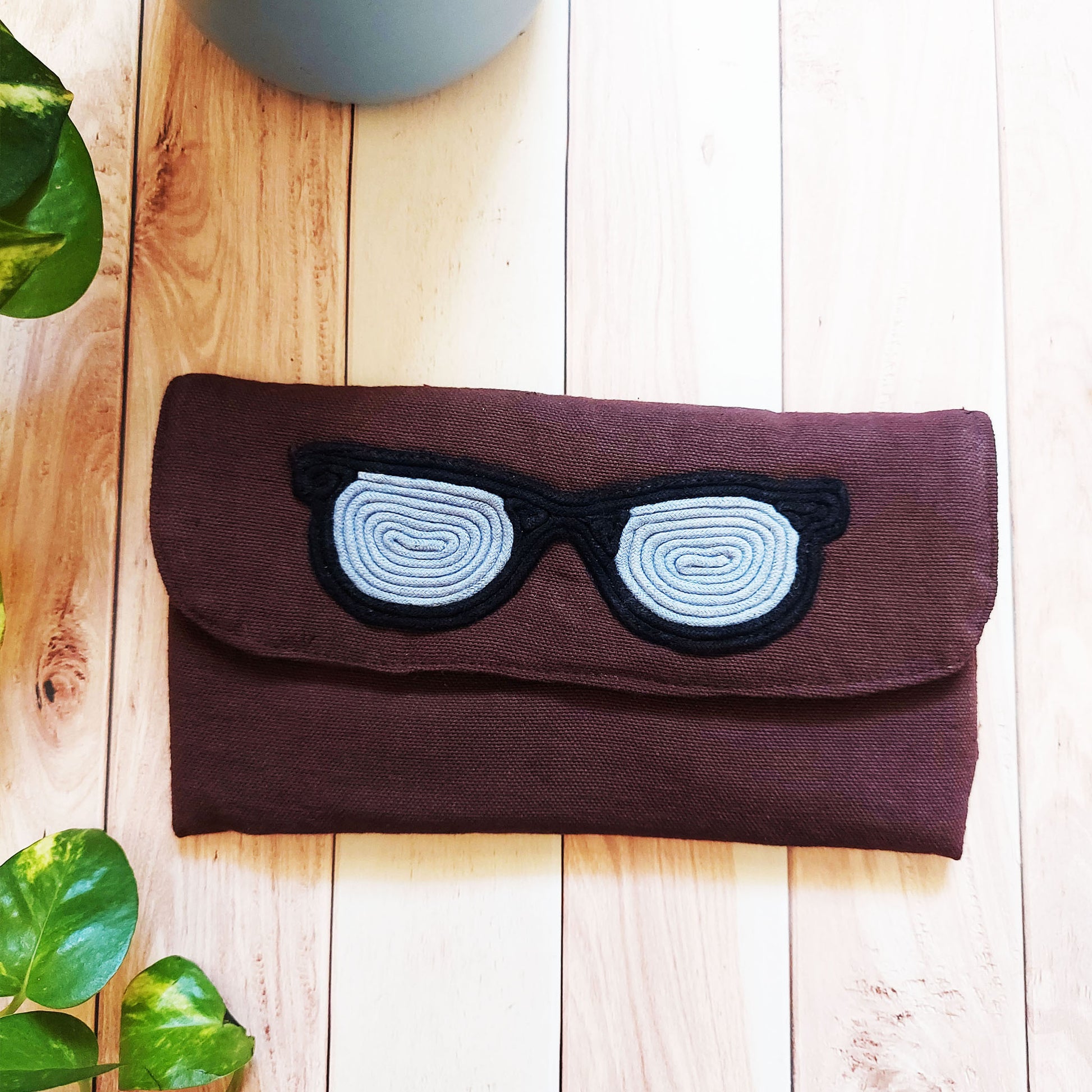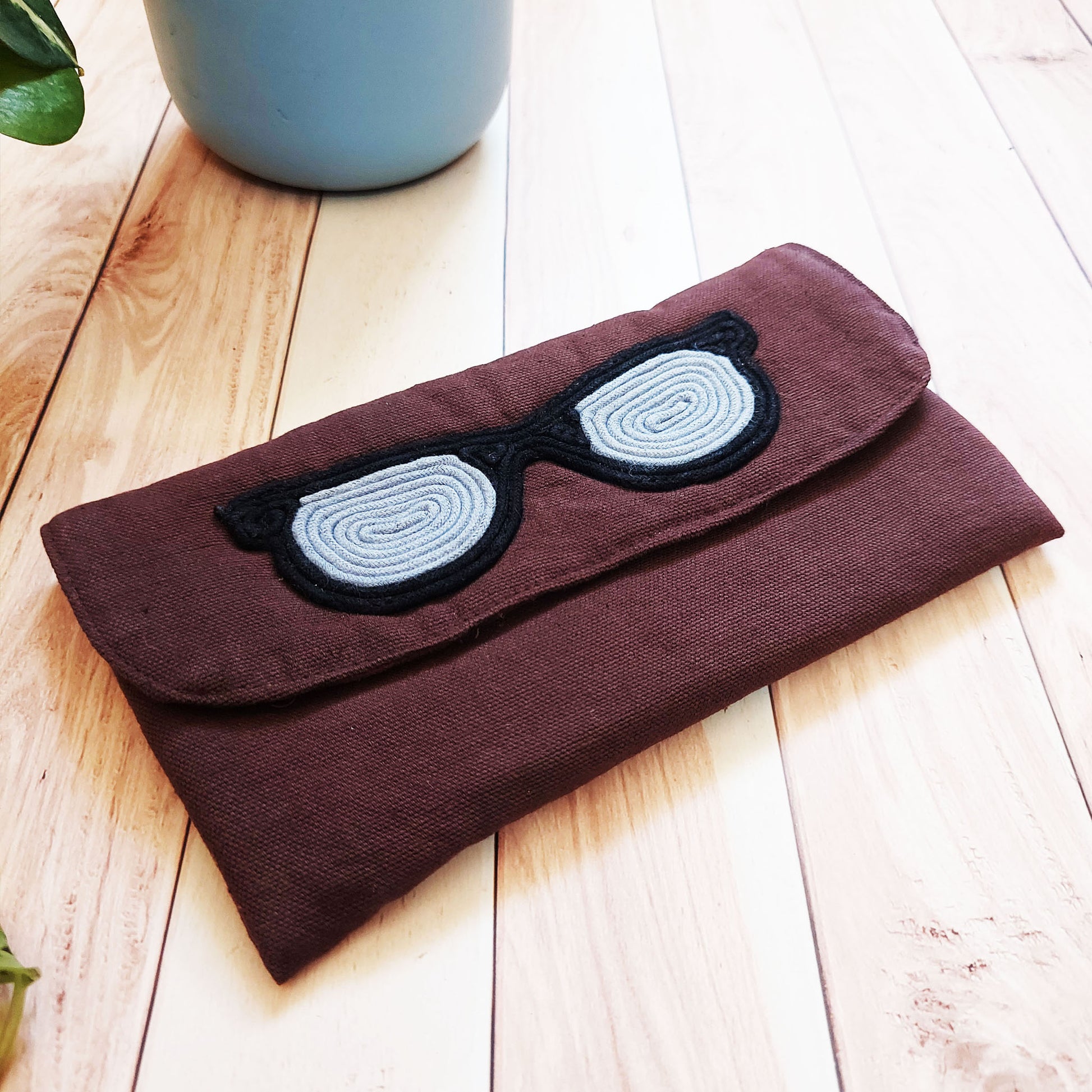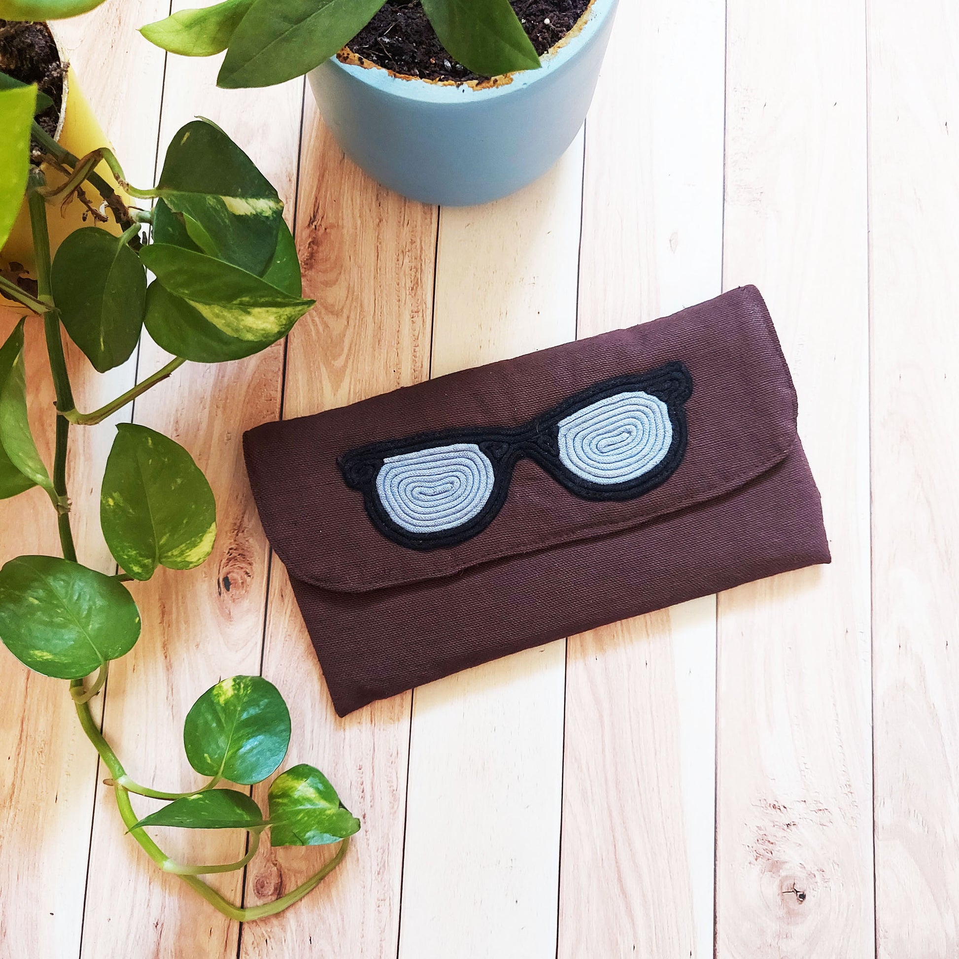 A Cotton Canvas Eyewear Case with a hand embroidered pair of sunglasses patched onto it. A sturdy cover to hold your glasses or sunglasses. It has a magnetic closure and layers of foam to keep your glasses protected. So keep your sunnies or your glasses in this and never worry about losing them again.