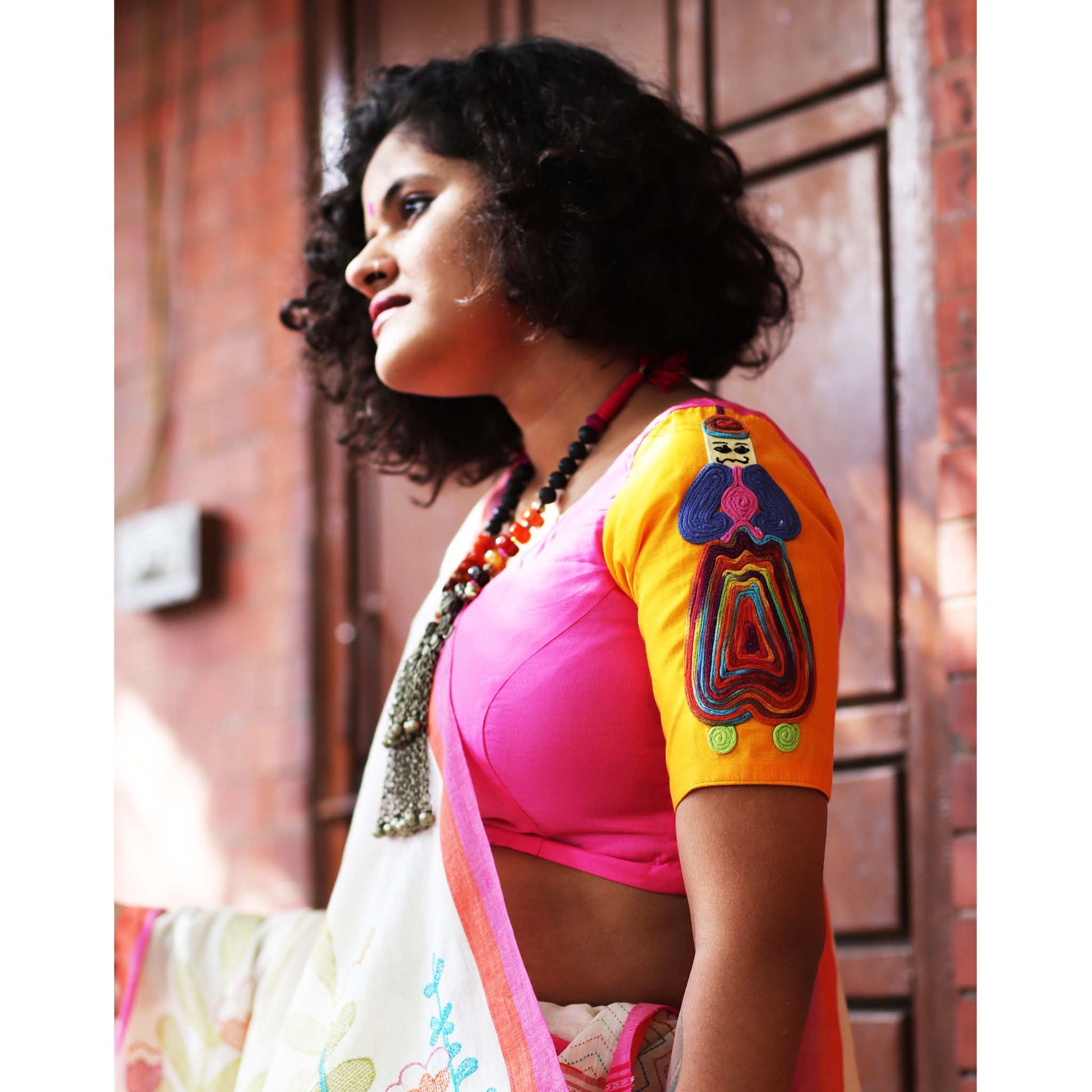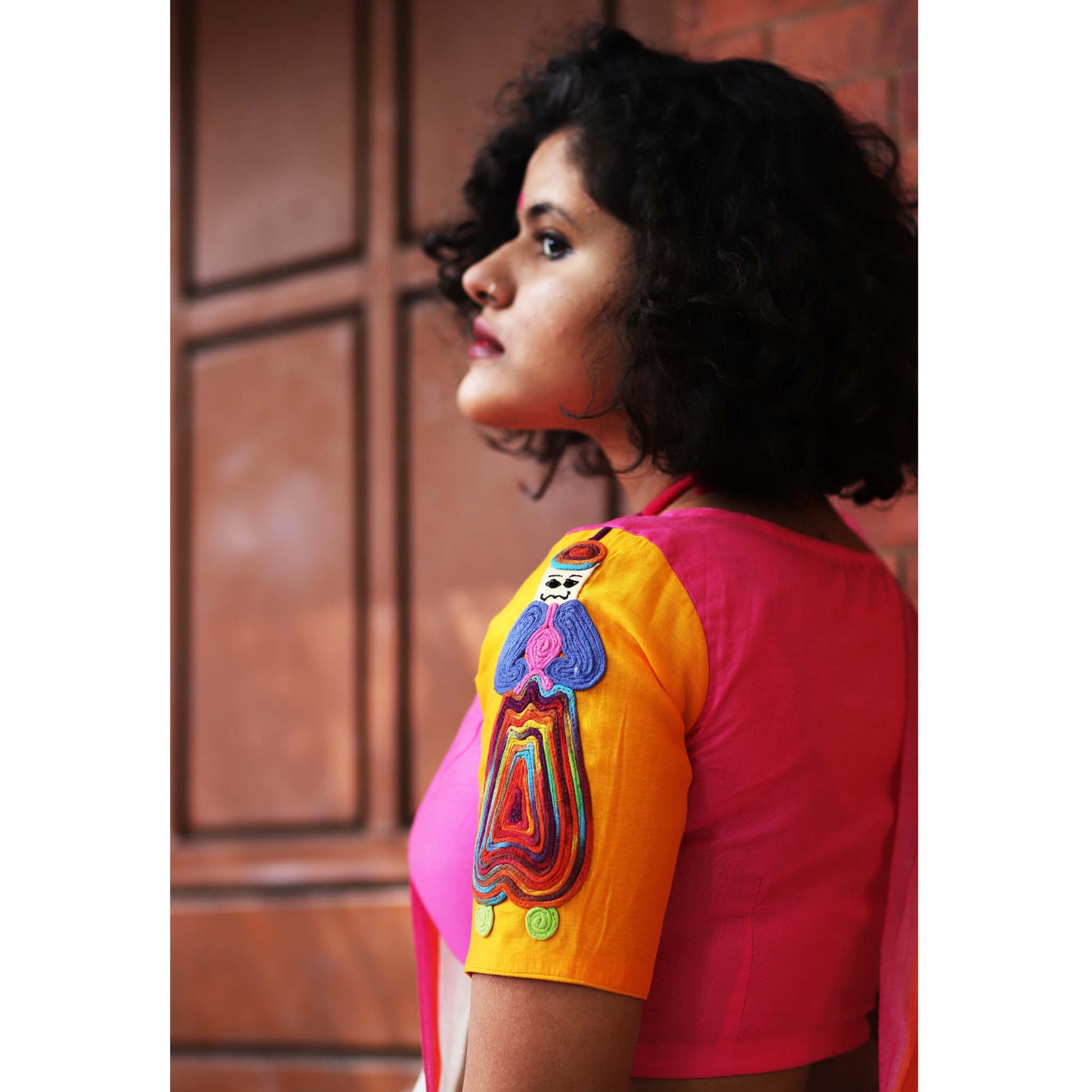 Enhance your look with an eye-catching blouse. The Kathputli blouse is made with cotton chanderi and is hand-embroidered with stunning doriwork designs on the sleeves, adding a beautiful bohemian flair to the classic silhouette. Featuring a side zipper, this blouse ensures that you'll have the perfect fit and complete style for any event. Step up your fashion game and make a bold statement with The Kathputli blouse.