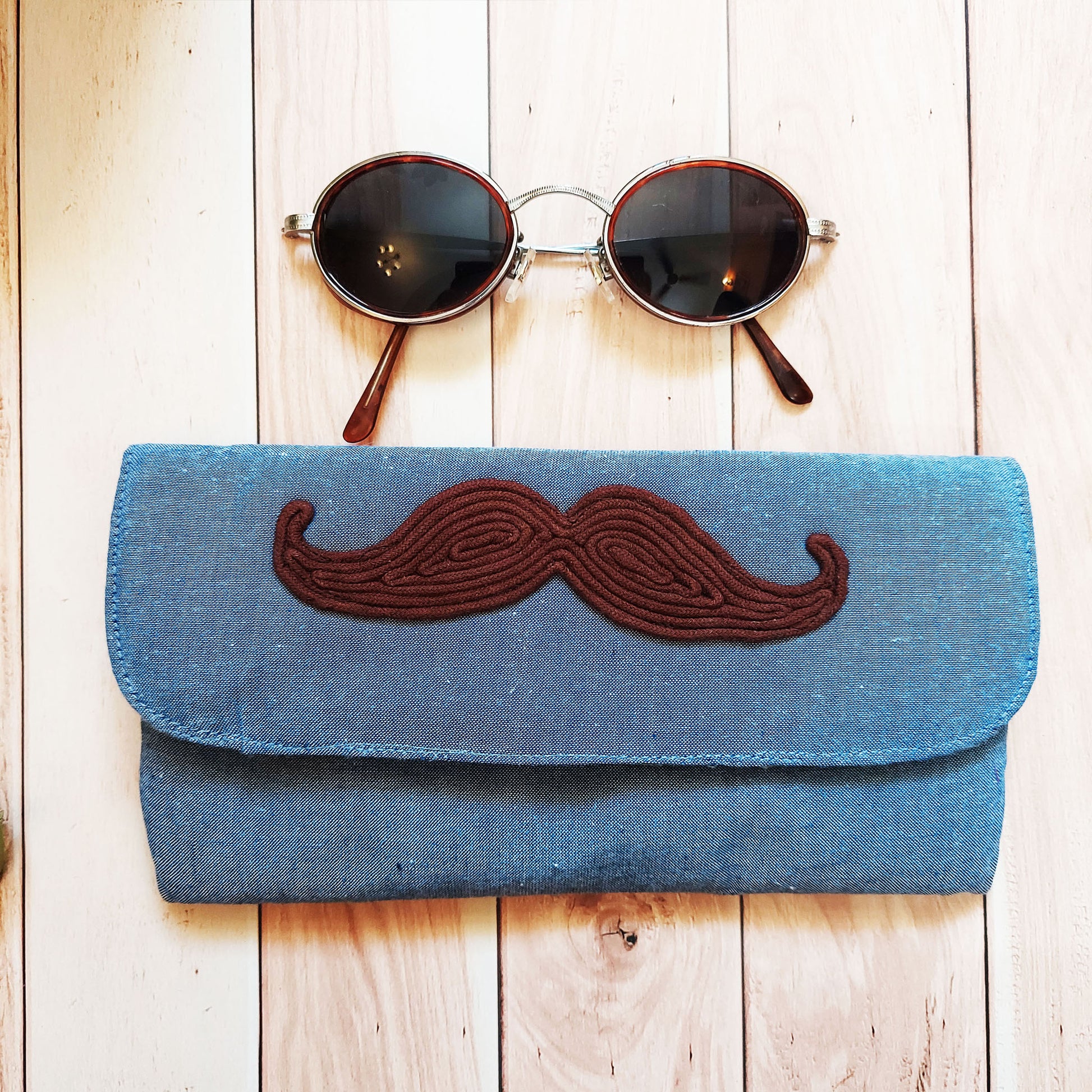 A Cotton Chambray Eyewear Case with a hand embroidered moustache patched onto it. A sturdy cover to hold your glasses or sunglasses. It has a magnetic closure and layers of foam to keep your glasses protected. So keep your sunnies or your glasses in this and never worry about losing them again.