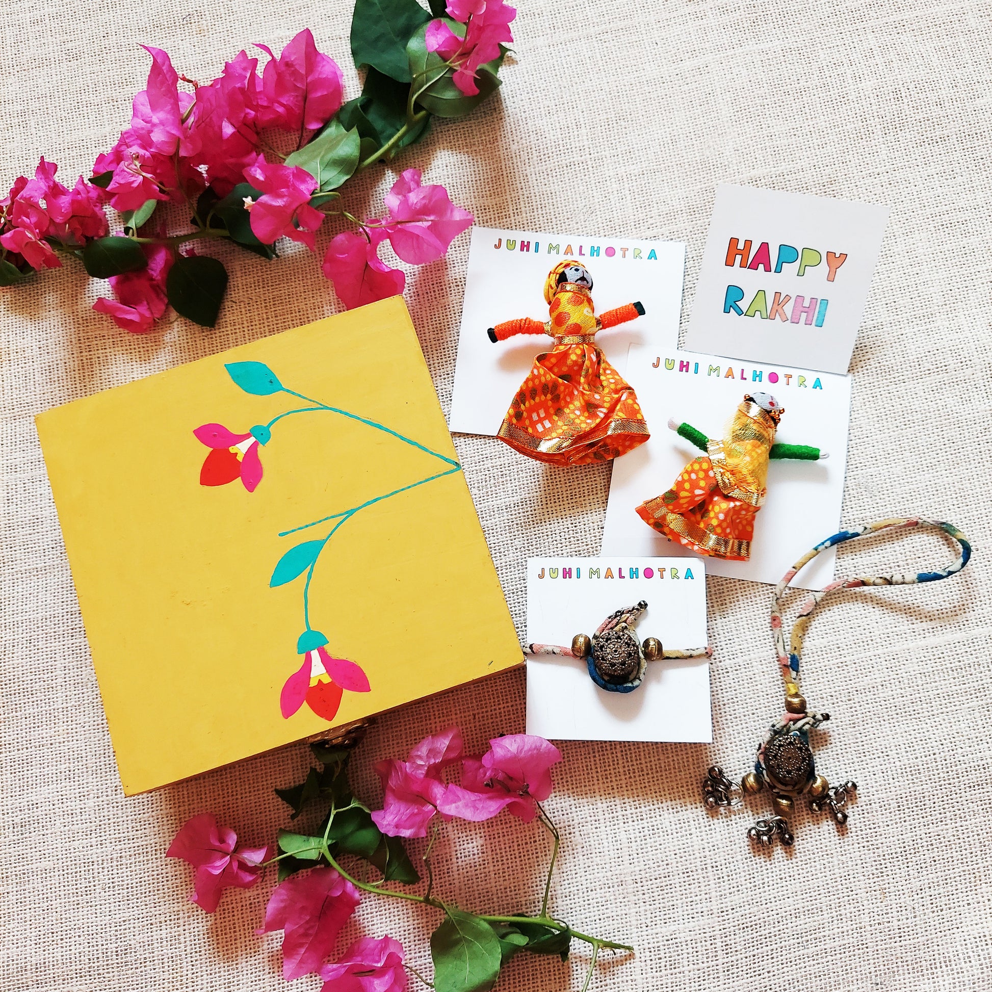 A yellow Box hamper with a handmade Rakhi and Lumba Set for your dear brother and sister in law. In addition there is a puppet brooch pair and a happy Rakhi to celebrate this pious bond.